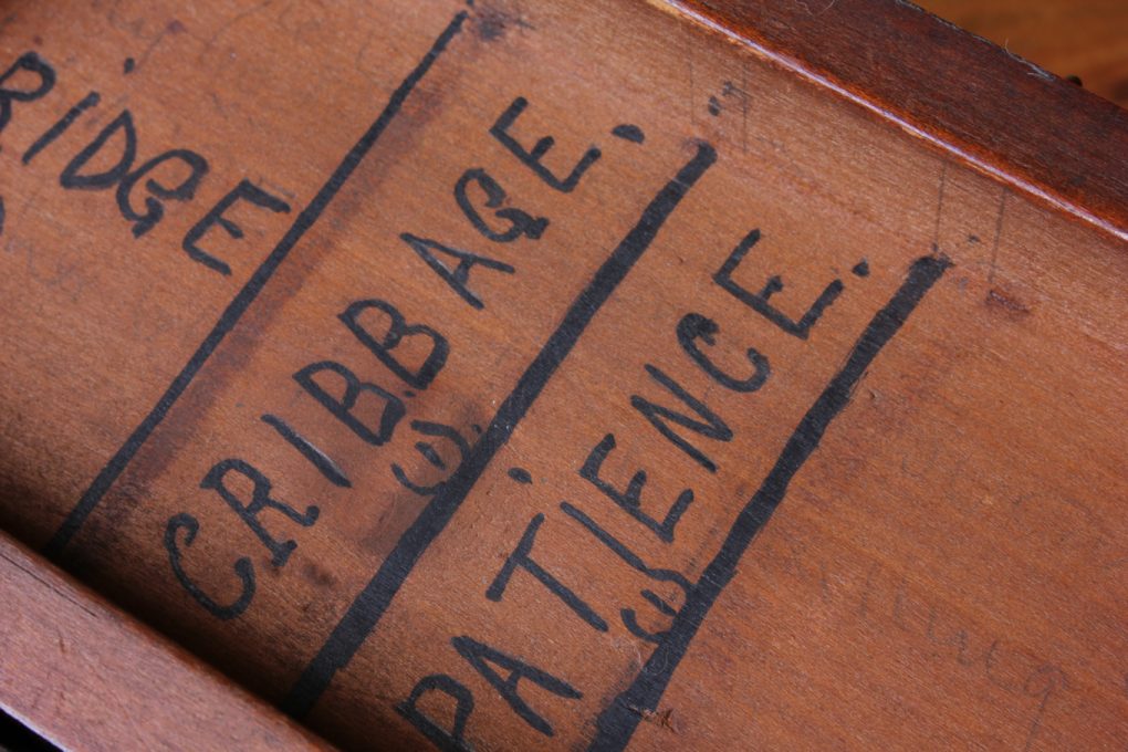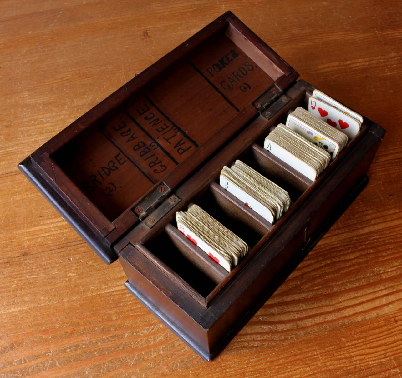This box has a hinged lid which has been marked to the inside by the previous owner with the wording Bridge, Cribbage, Patience and Poker and a fitted interior that can hold 8 packs of playing cards. The cards in the box are included but are not full sets.
