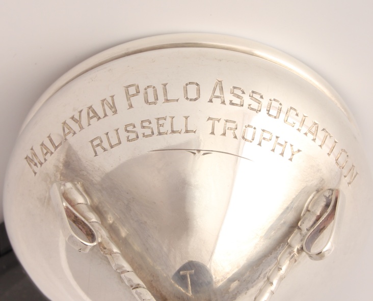 This stylish silver polo trophy which is by silversmith Sanders & Mackenzie is fully hallmarked for Birmingham 1926 and has an interesting inscription that reads Malayan Polo Association. Russell Trophy.