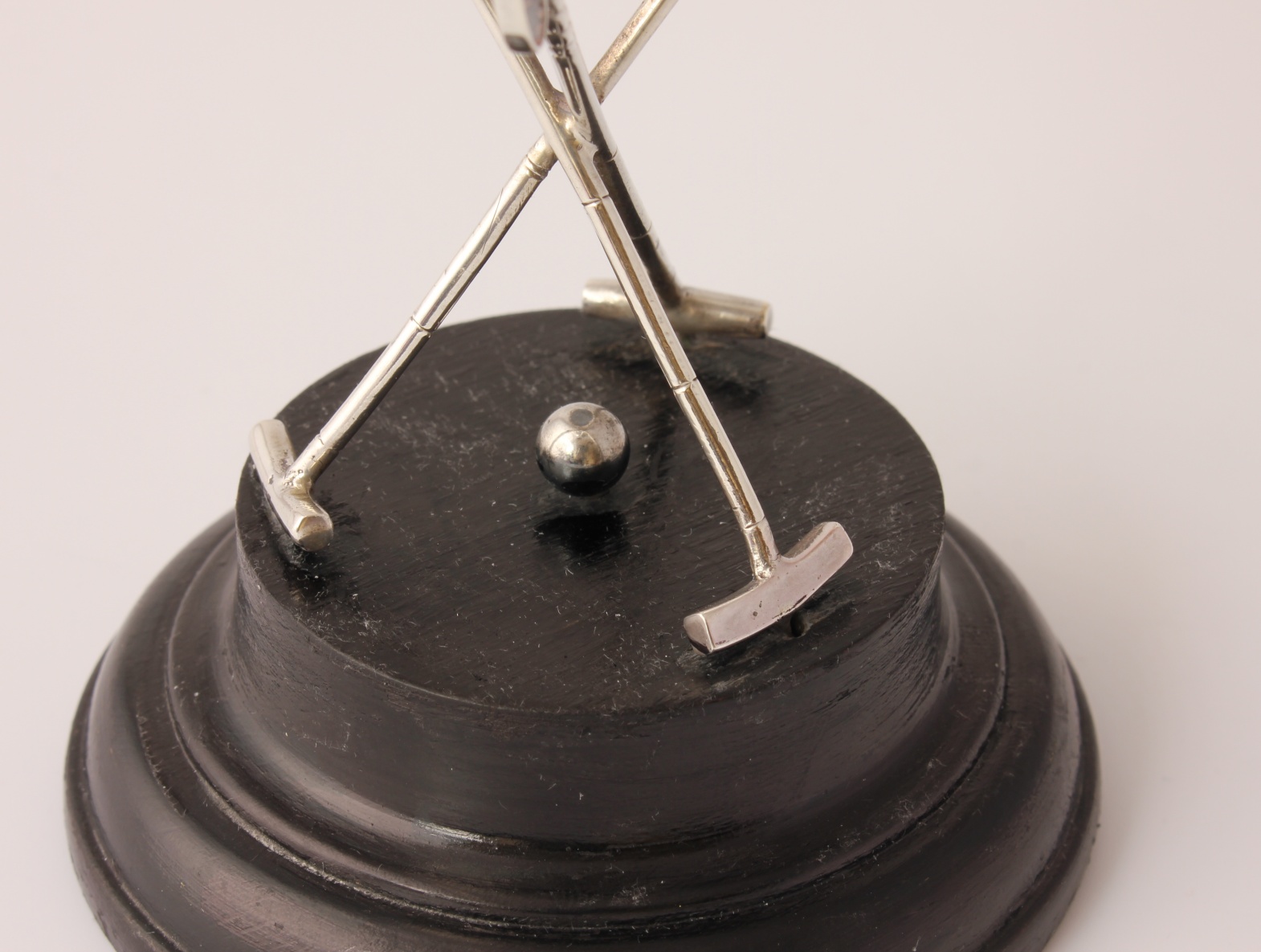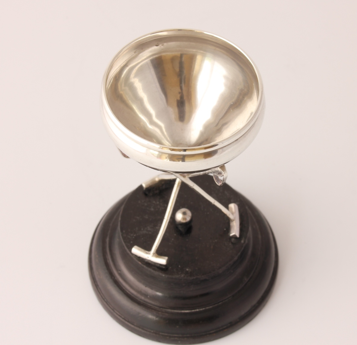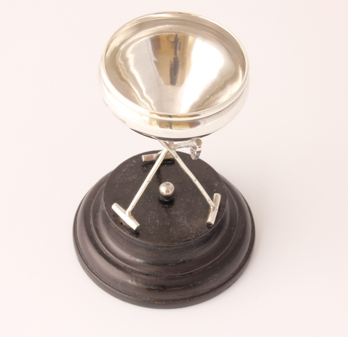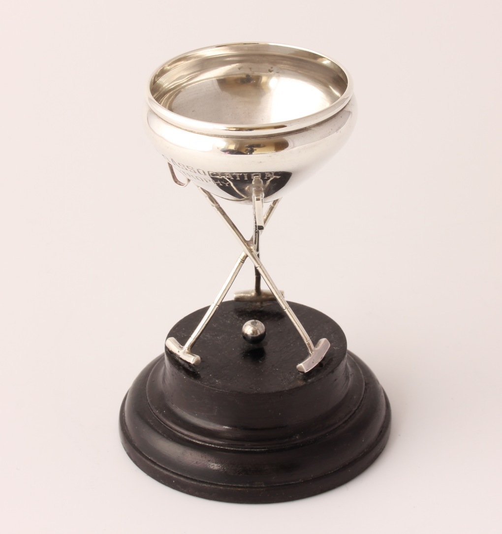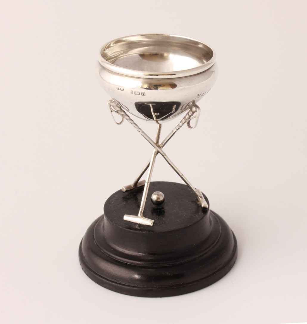 This unusual silver trophy which is designed as a bowl sitting on three polo mallets with a central ball and is fitted to it's black wooden base.