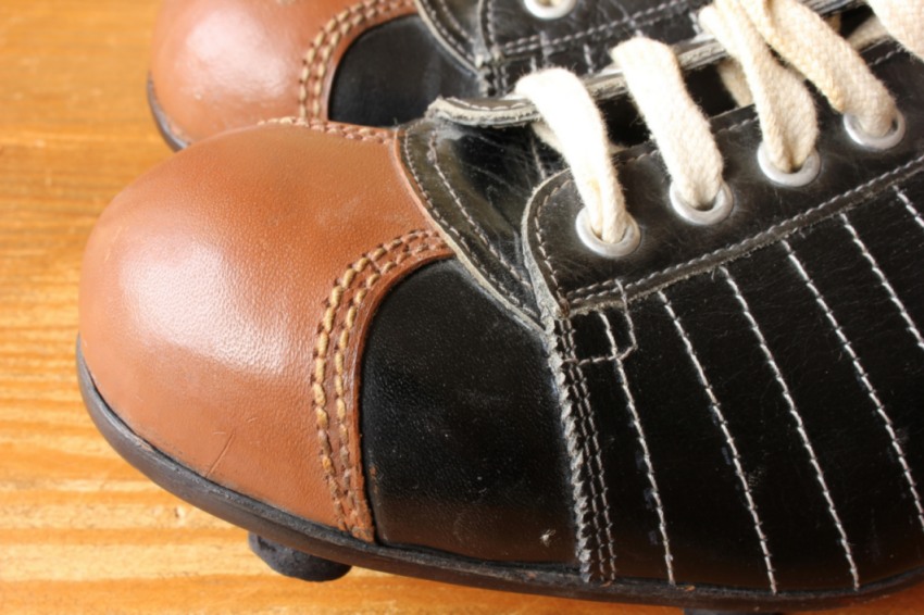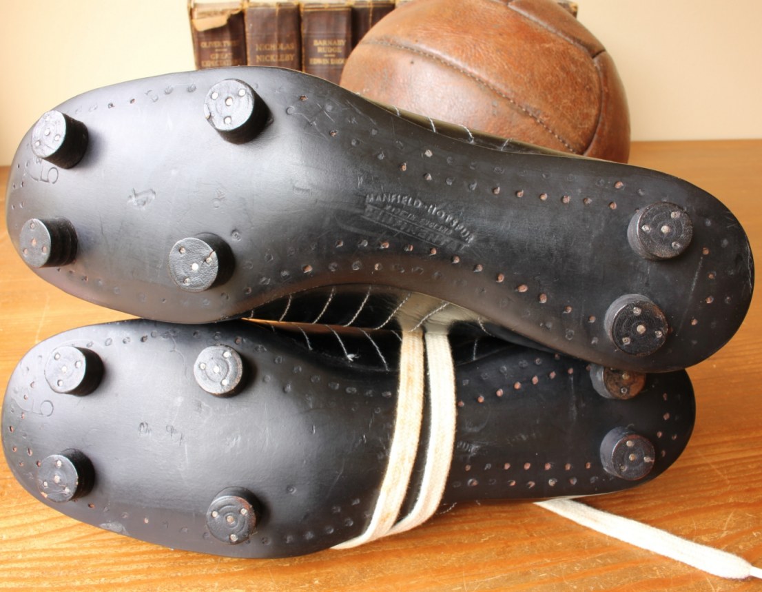 This extremely rare pair of Manfield Hotspur Continental football boots which date from the 1950s are made of black leather, have brown leather toe caps and leather soles with nailed on leather studs.