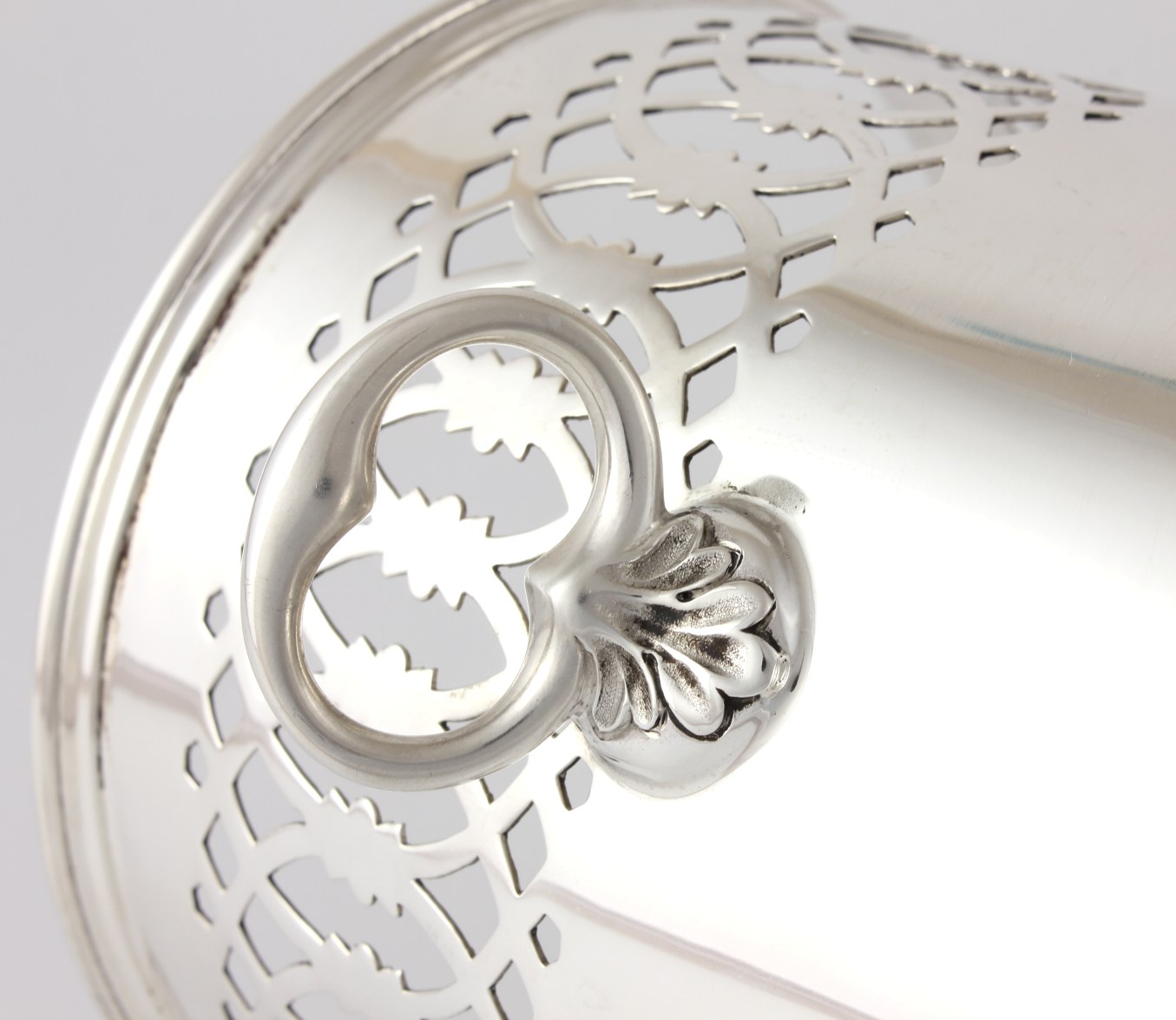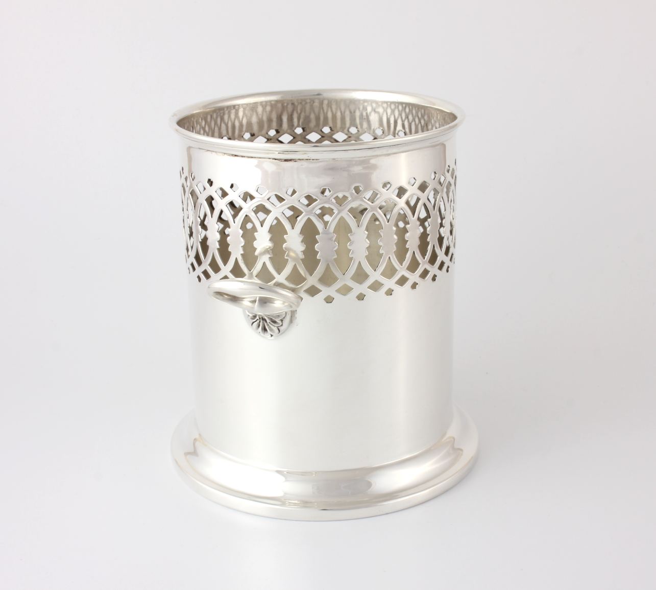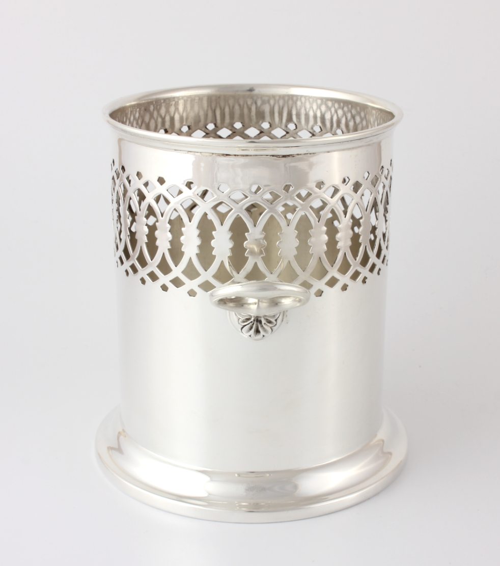 This handsome bottle holder has a handle to each side, a plain lower half and pierced decoration to the top half.