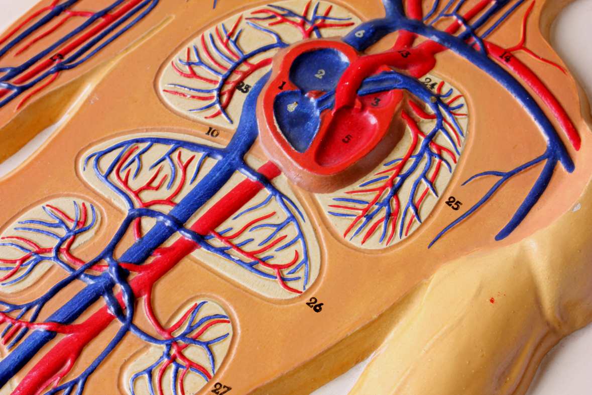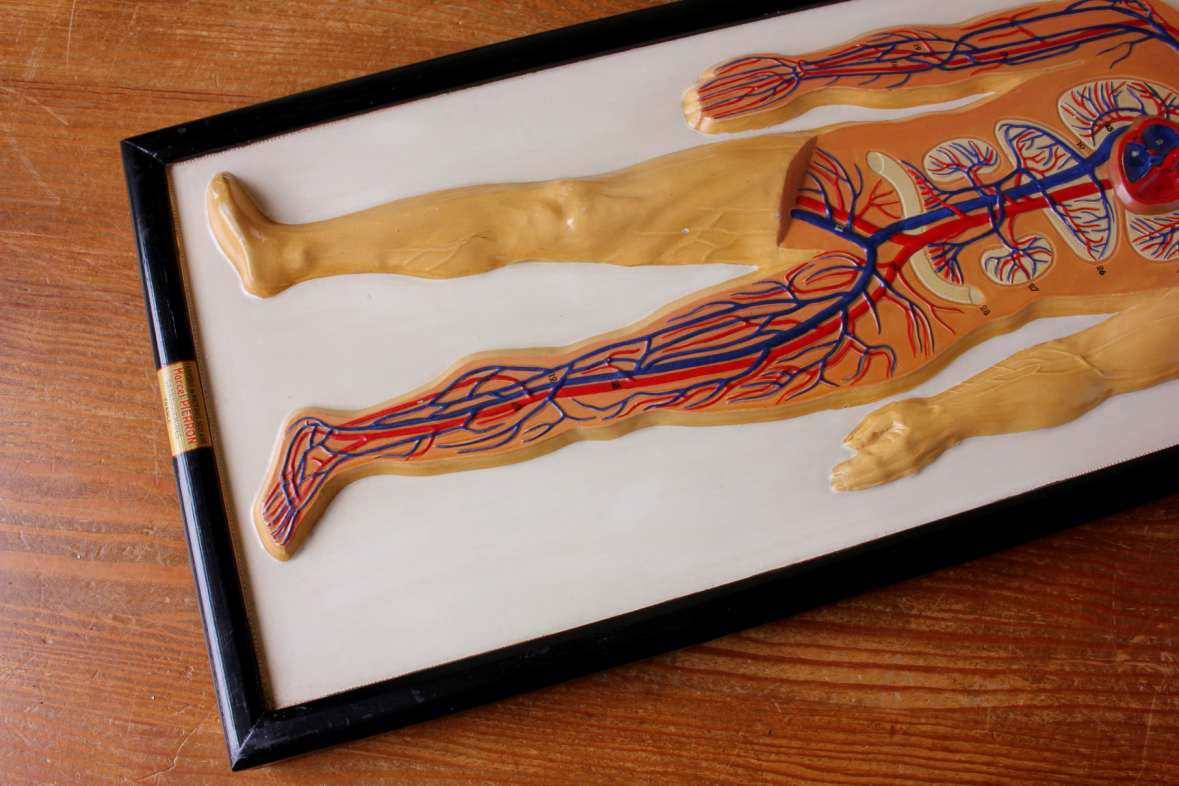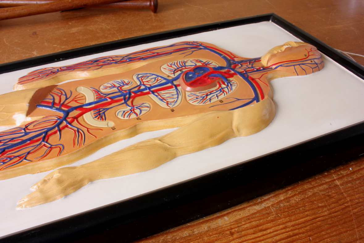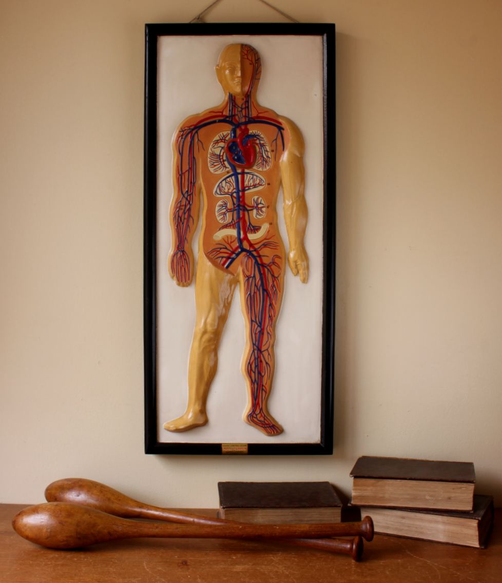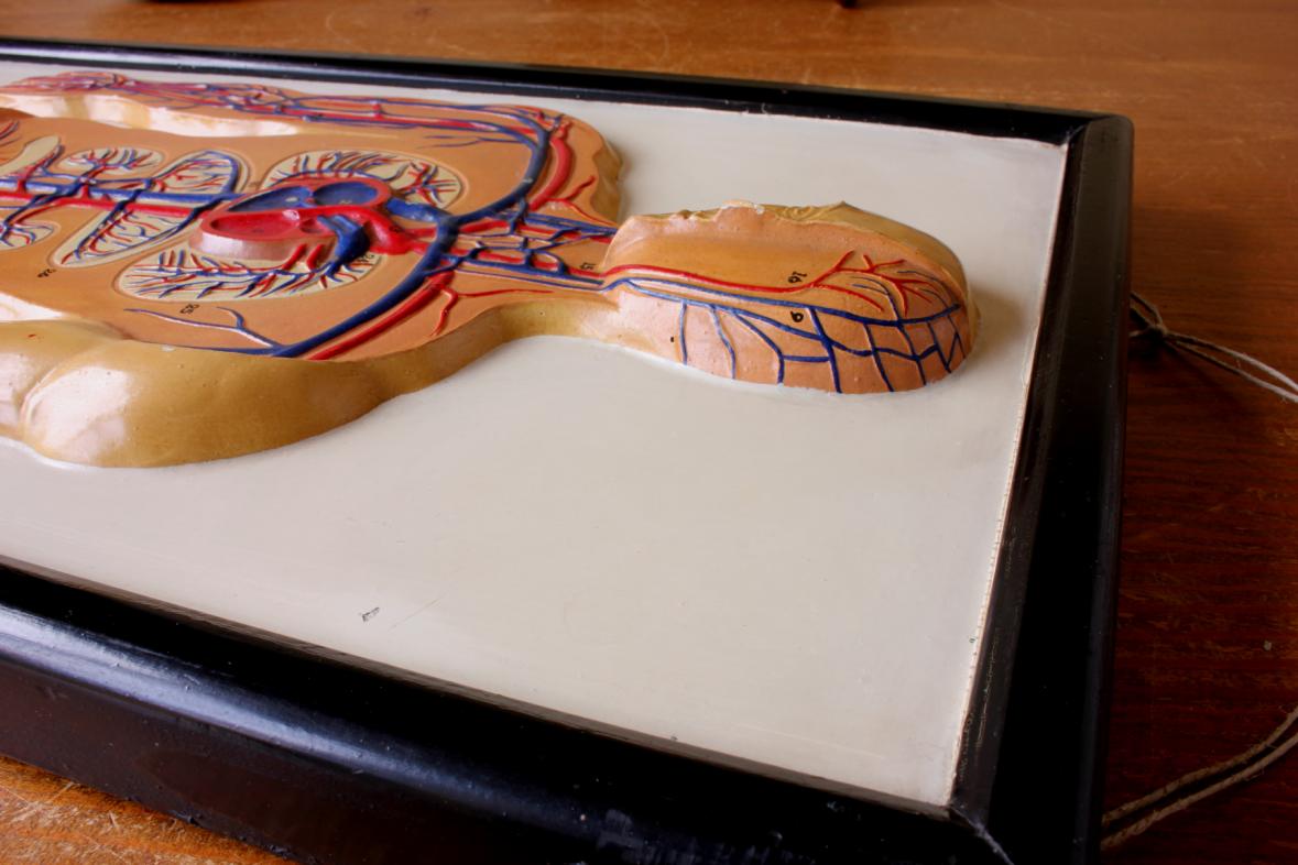This unusual vintage educational anatomical wall display which has a raised 3d effect is made of plaster and is a cutaway model of the front of a human body showing the blood vessels in the body.