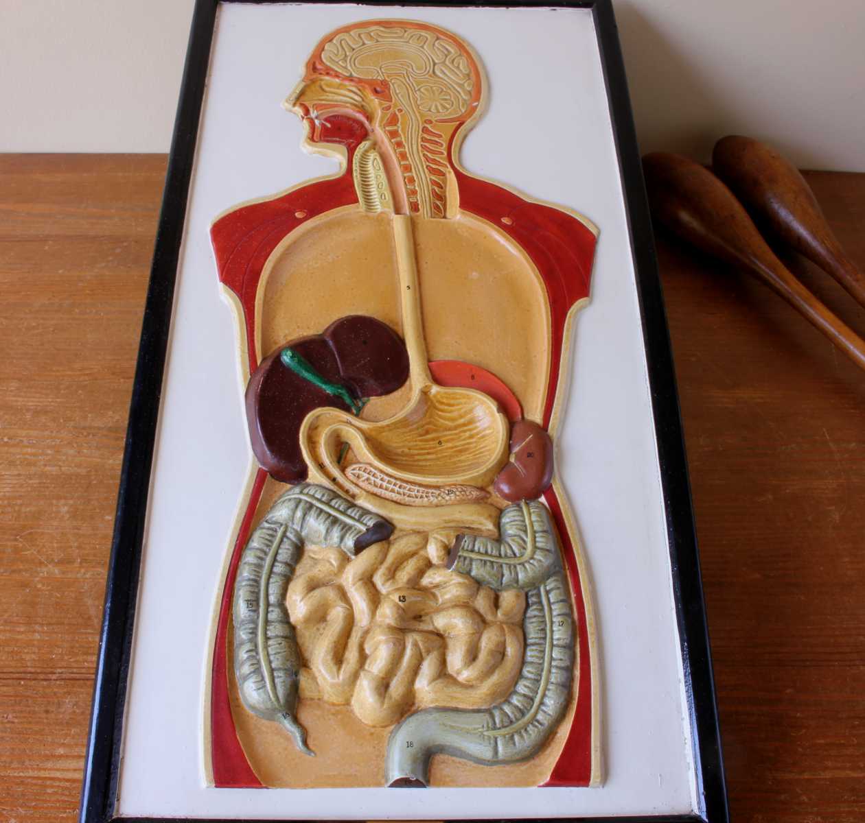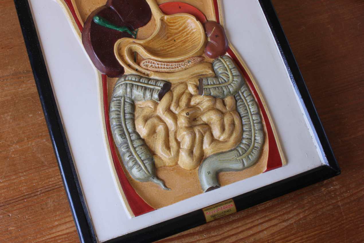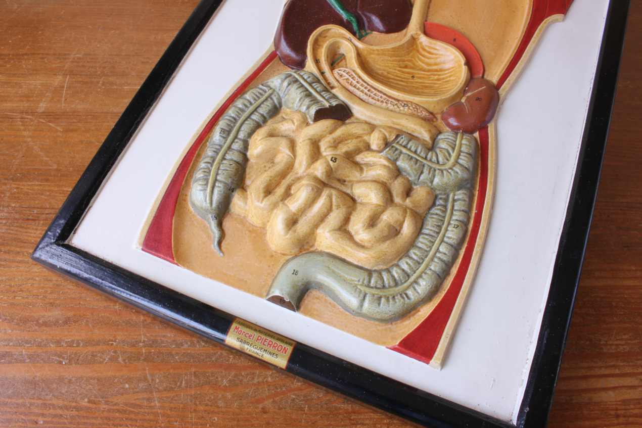 This unusual vintage educational anatomical wall display which is a cutaway model of the front of a human body shows the digestion system and is made of plaster which has a raised 3d effect.