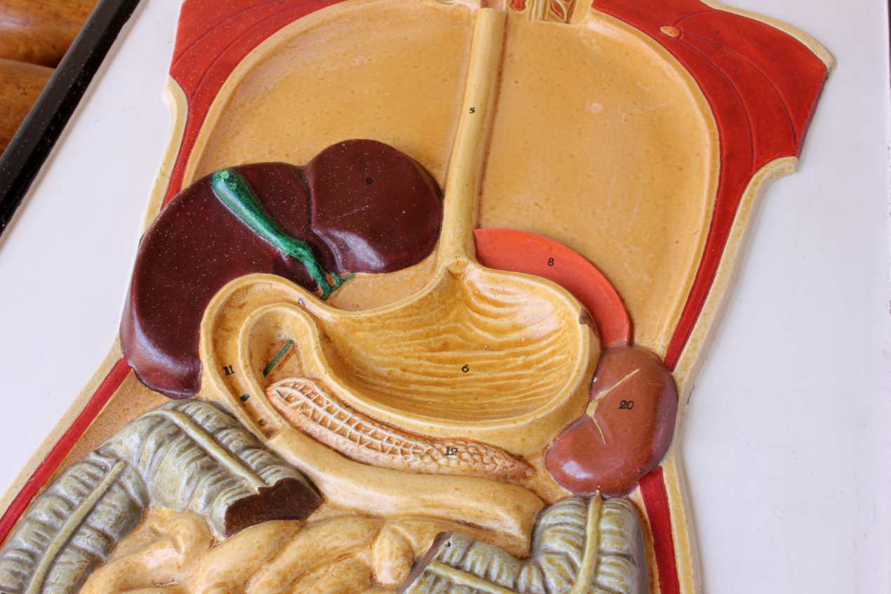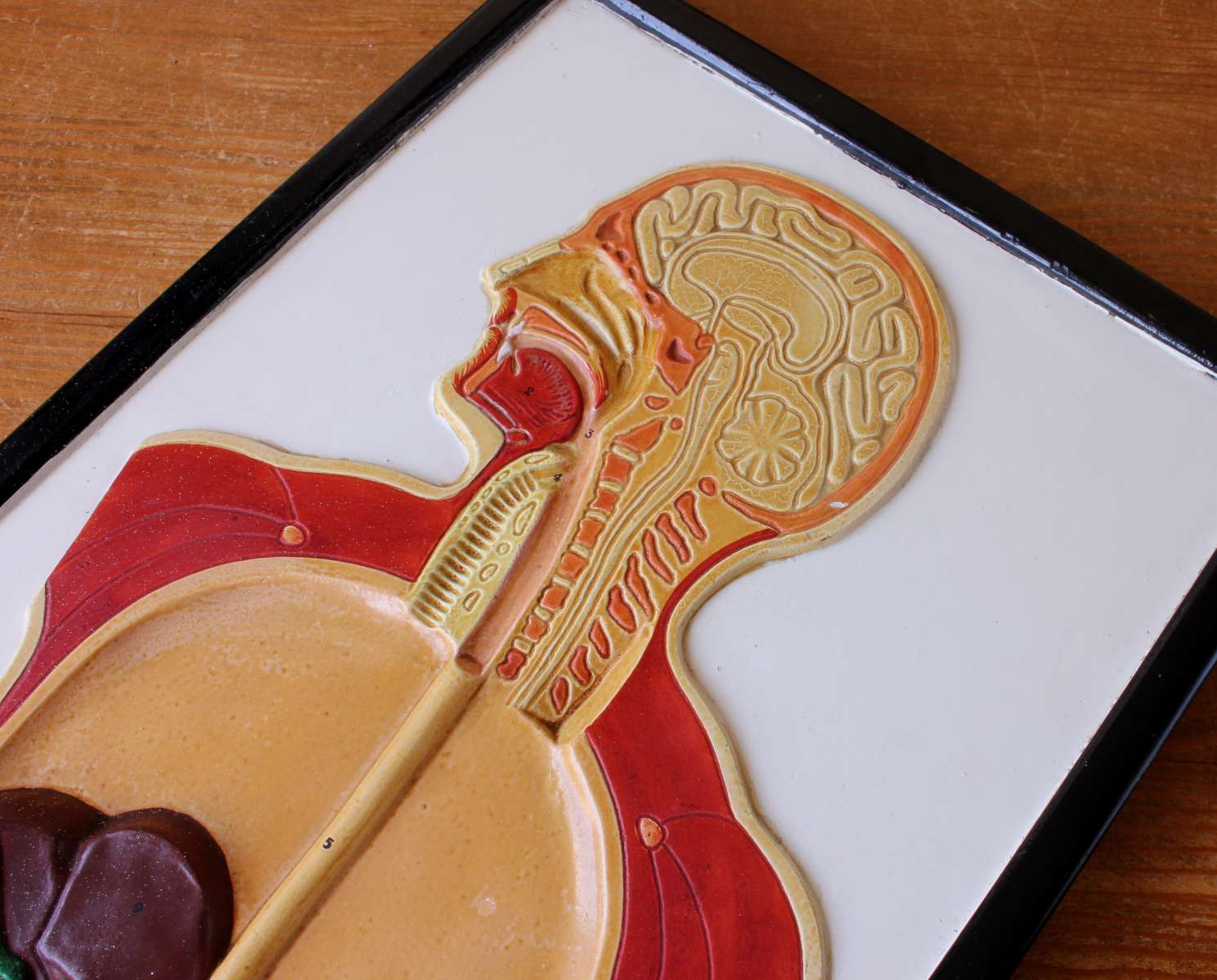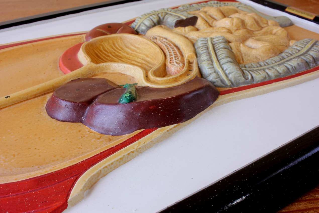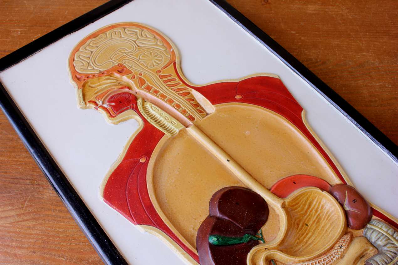 This unusual vintage educational anatomical wall display which is a cutaway model of the front of a human body shows the digestion system and is made of plaster which has a raised 3d effect.