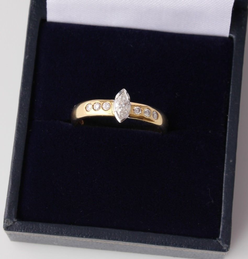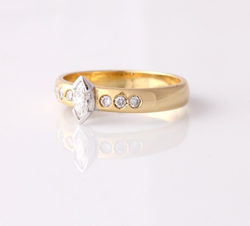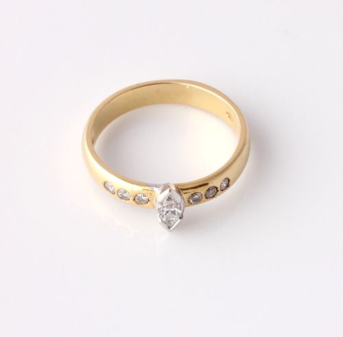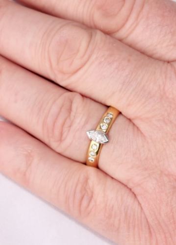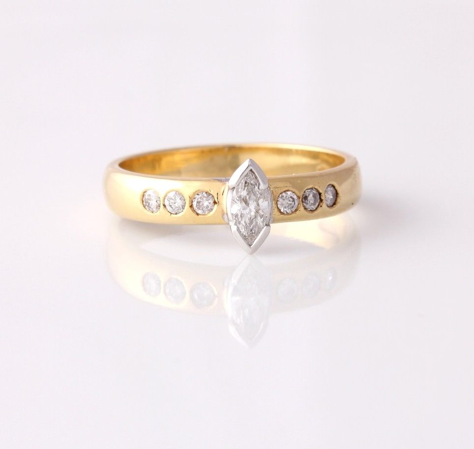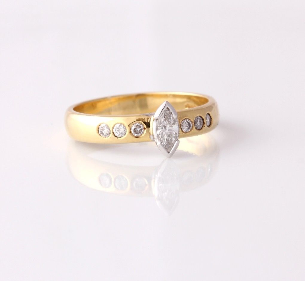 This stunning ring is crafted in 18ct yellow gold and is set with a marquise cut natural central diamond of 0.25cts. There are also 3 natural diamonds on each shoulder which have a diamond weight of 0.15 cts total. The central diamond is of VS quality and is clear and bright.