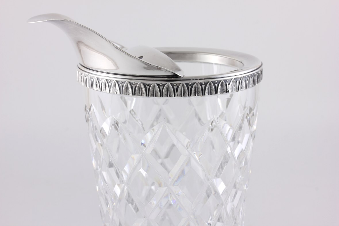 This antique French Art Deco cocktail pitcher / jug which dates from c1930 has a silver plated pourer, strainer and rim that is nicely decorated with a classic French design.