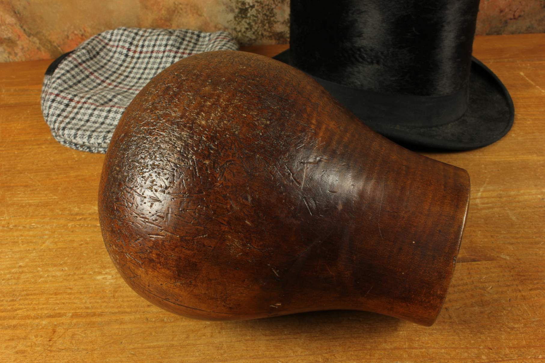 This hat block has accumulated lots of pin holes and wear over the years leaving a wonderful look and would be ideal for displaying hats, wigs and other headwear.