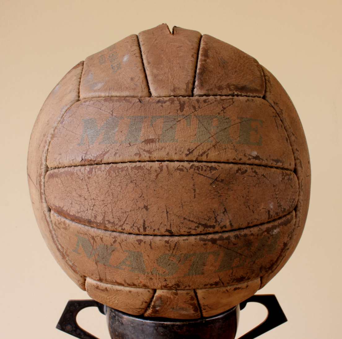 This very nice vintage Mitre Master football which is made of tanned Mitrox leather, is an 18 panel design ball and dates from 1959. Mitre Master footballs were used by professional teams from the late 1950's and through the 60's. This one is marked with a hand written M.T.F.C. which we believe to be Mansfield Town Football Club as they used Mitre balls at that time.