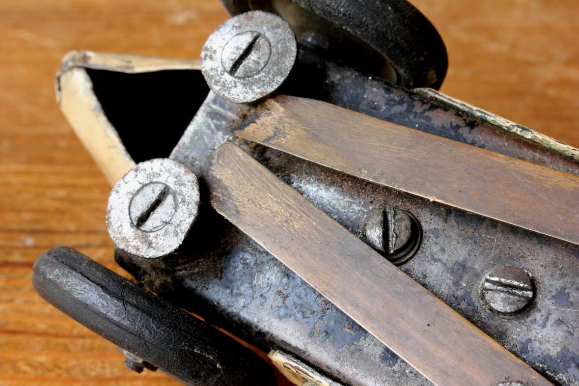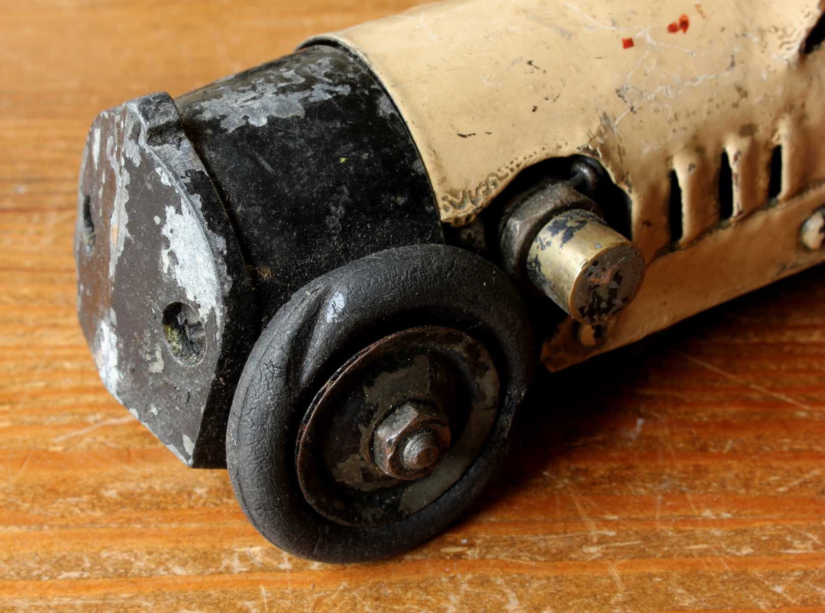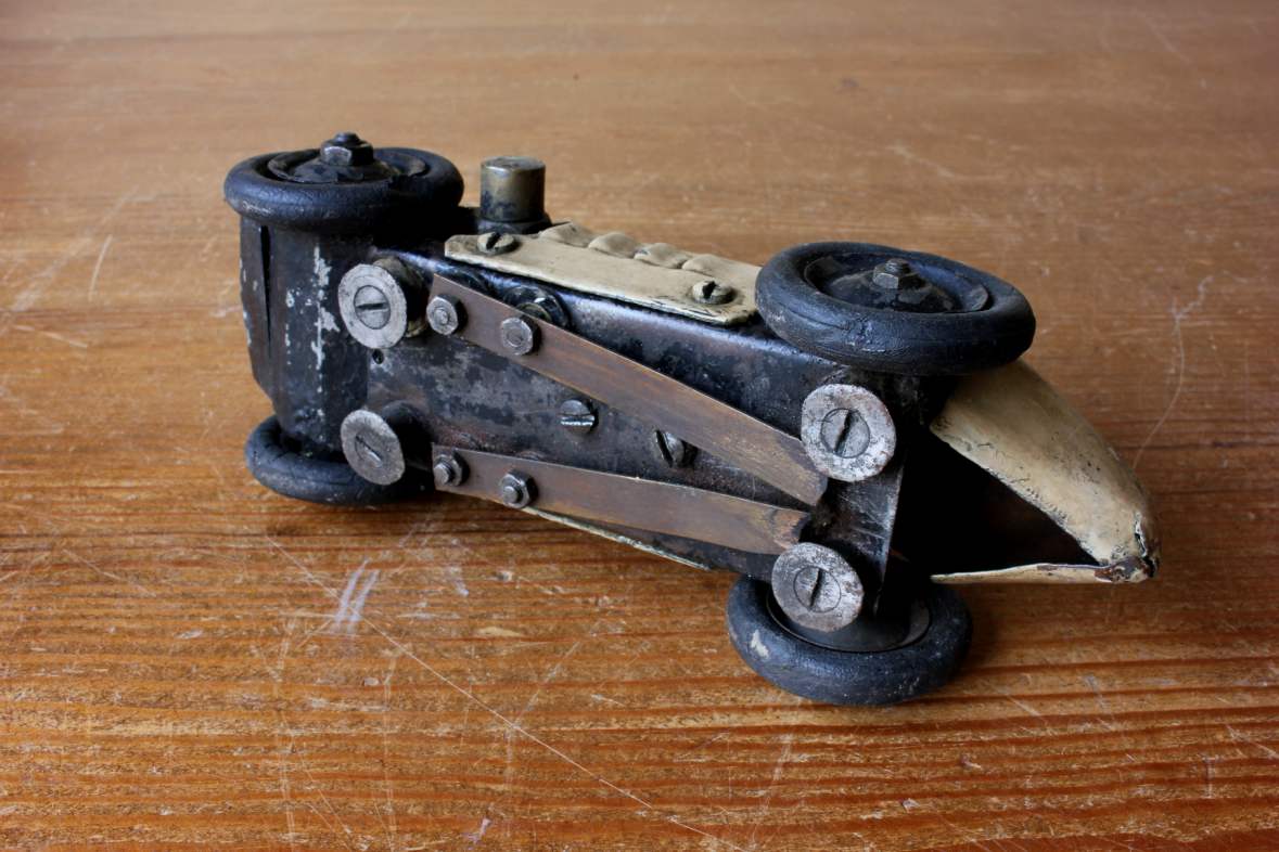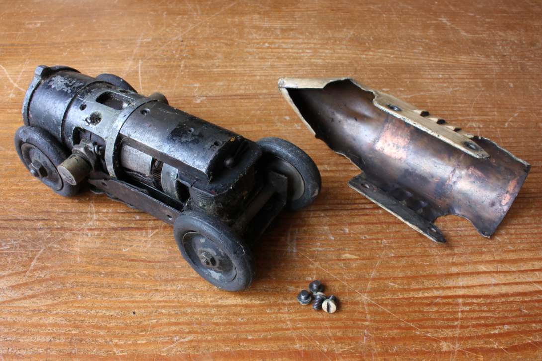 This super cool looking electric model track car which is scratch built has copper bodywork, an electric motor, rubber tyres and copper electrical contacts that would have sat on the tracks.