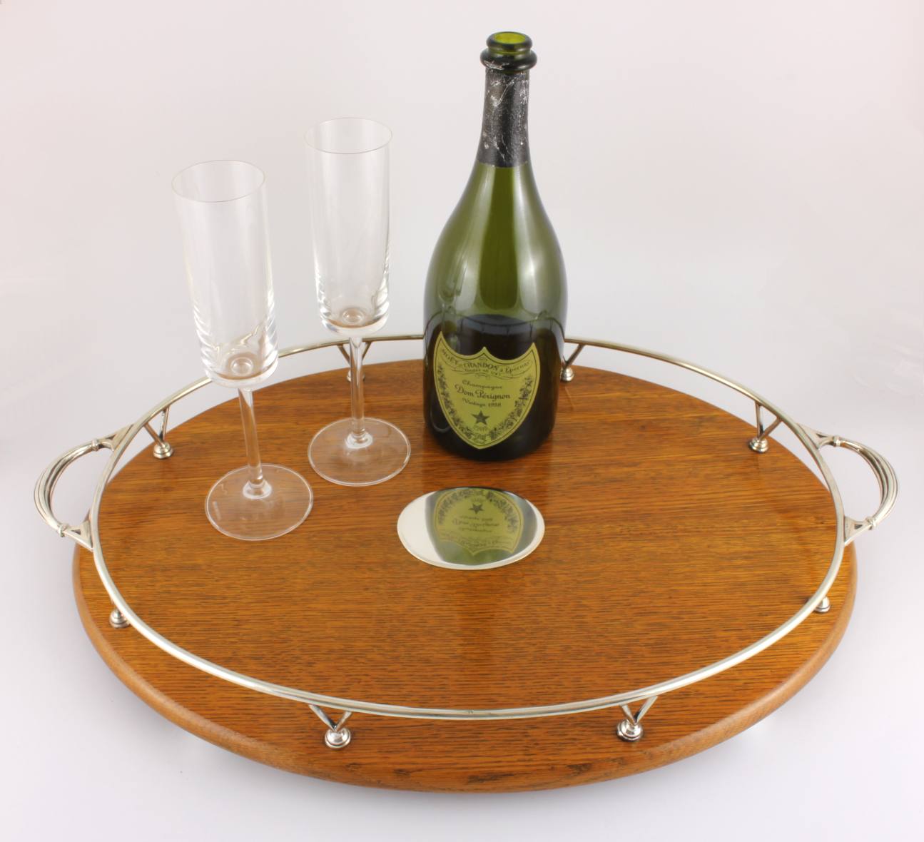 This antique oval tray which is made of English oak has a stylish silver plated gallery and dates from the late 19th century.