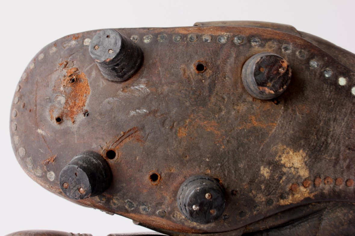 This nice worn pair of vintage football boots which date from the 1950's are made of dark brown leather with leather soles and nailed on studs.