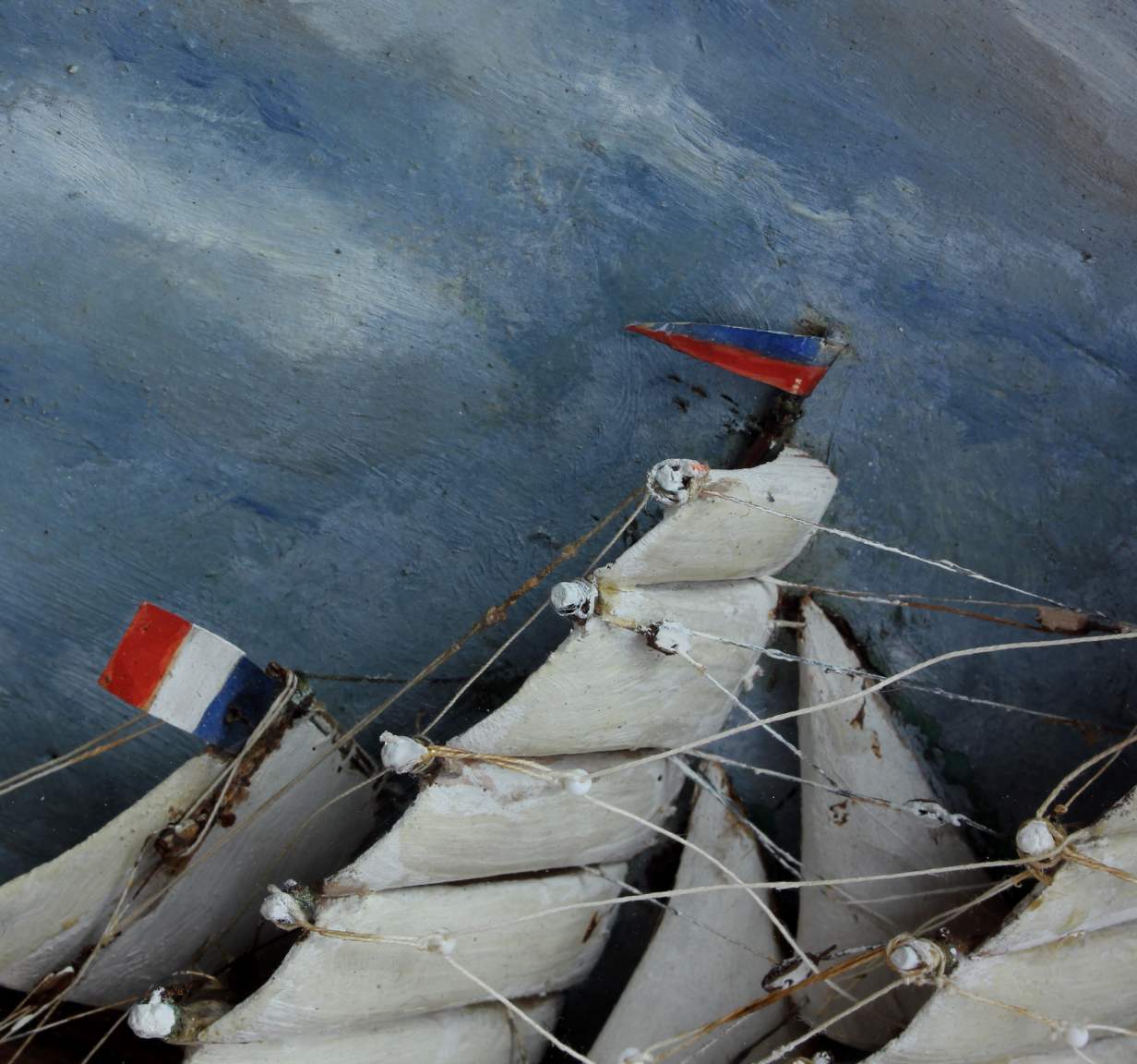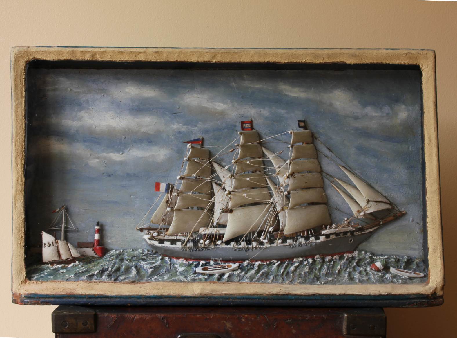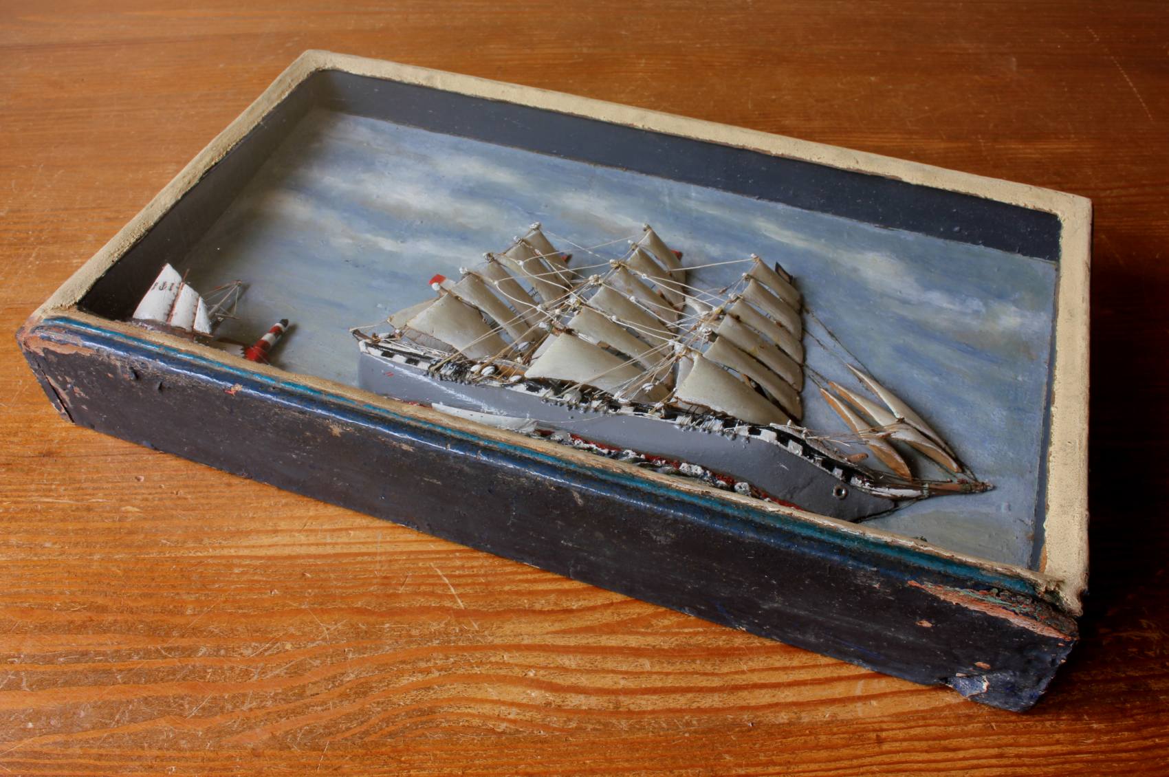 This handsome original French ship in a box diorama which has been lovingly handmade in wood is of beautiful quality with wonderful detail, dates from the beginning of the 20th century and is encased in a glass fronted wooden box.