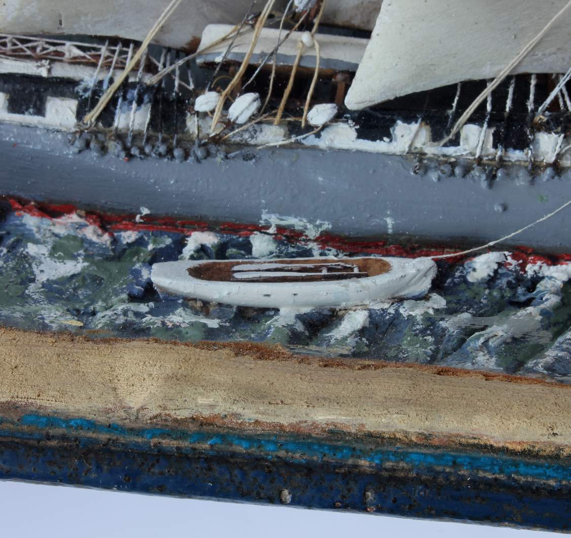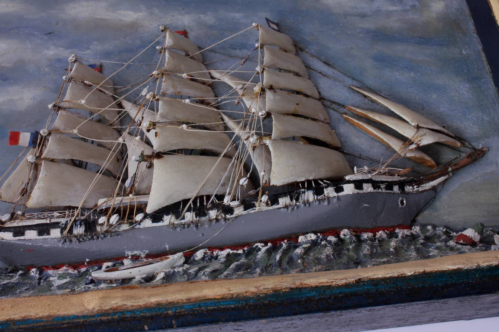 This piece came from Nantes in France so most likely features a sailing ship from that area. The ship has wonderful detail including carved wooden and painted sails, rigging and a dramatic painted sky.