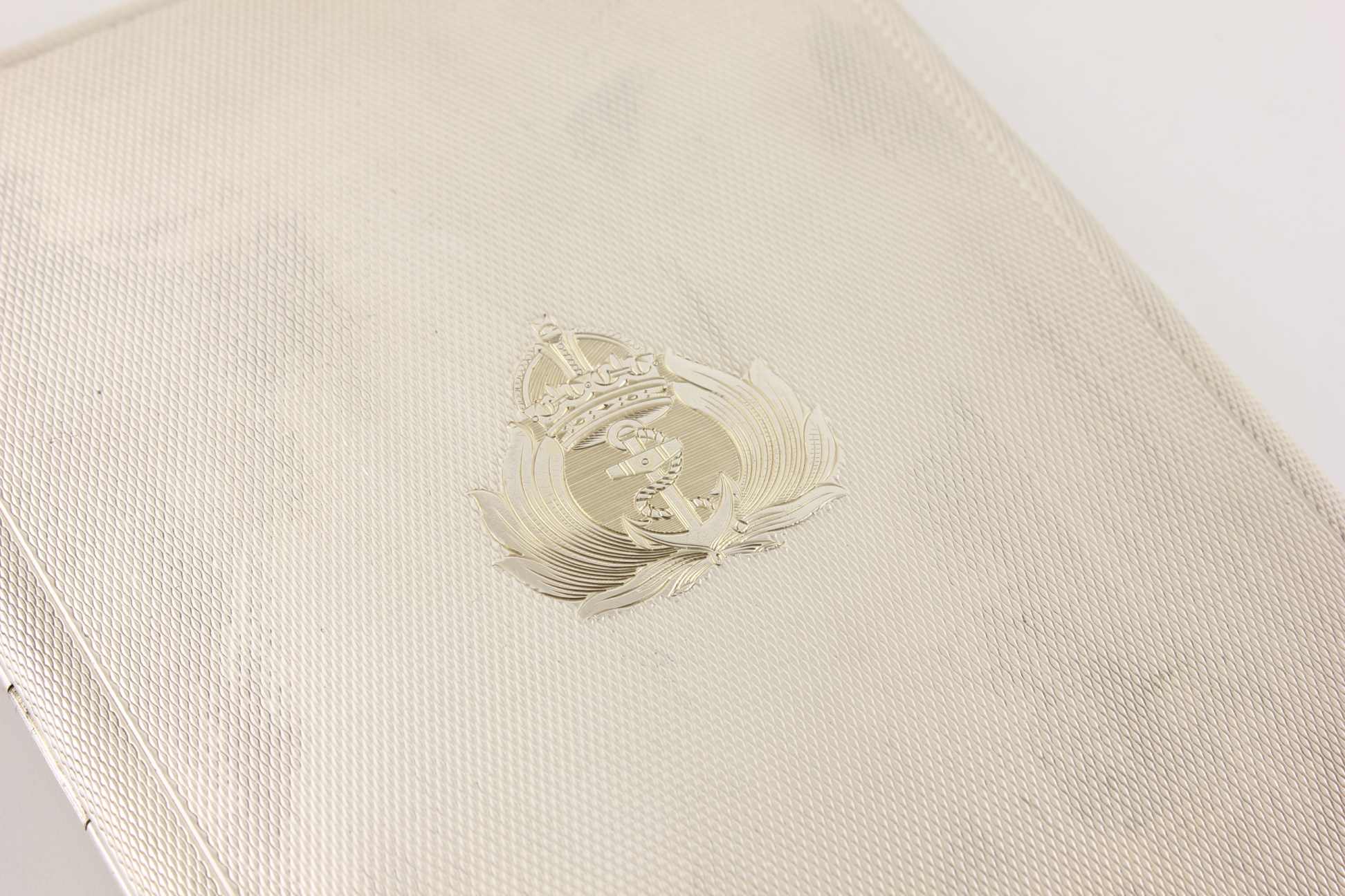 This fabulous solid silver cigarette case which is fully hallmarked for 1941 is made by Charles S Green & Co Ltd, has beautiful engine turned decoration and a central Royal Navy badge to the front.