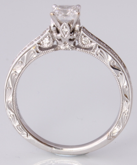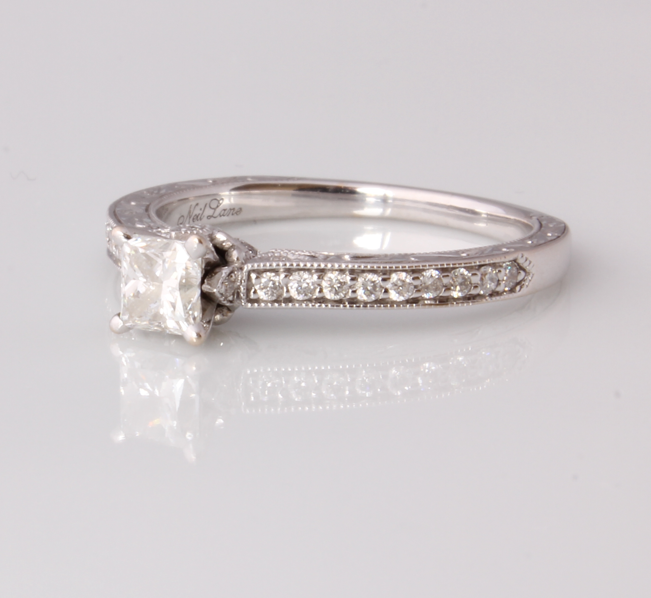 This stunning ring is by the renowned jeweller to the Hollywood stars Neil Lane. It is crafted in 14ct white gold with one central square-shape natural diamond plus the shoulders and mount are uniquely set with brilliant-cut natural diamonds.