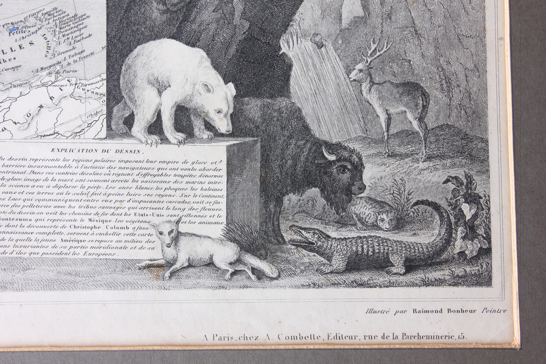 This fascinating map is wonderfully decorated and depicts the American continent as it existed in 1845. The very ornate and detailed border depicts scenes with animals native to North America such as bison, alligators and bears. The chart at the bottom lists the population of each country. Despite the date, Texas is not named on the map or listed in the population table underneath.