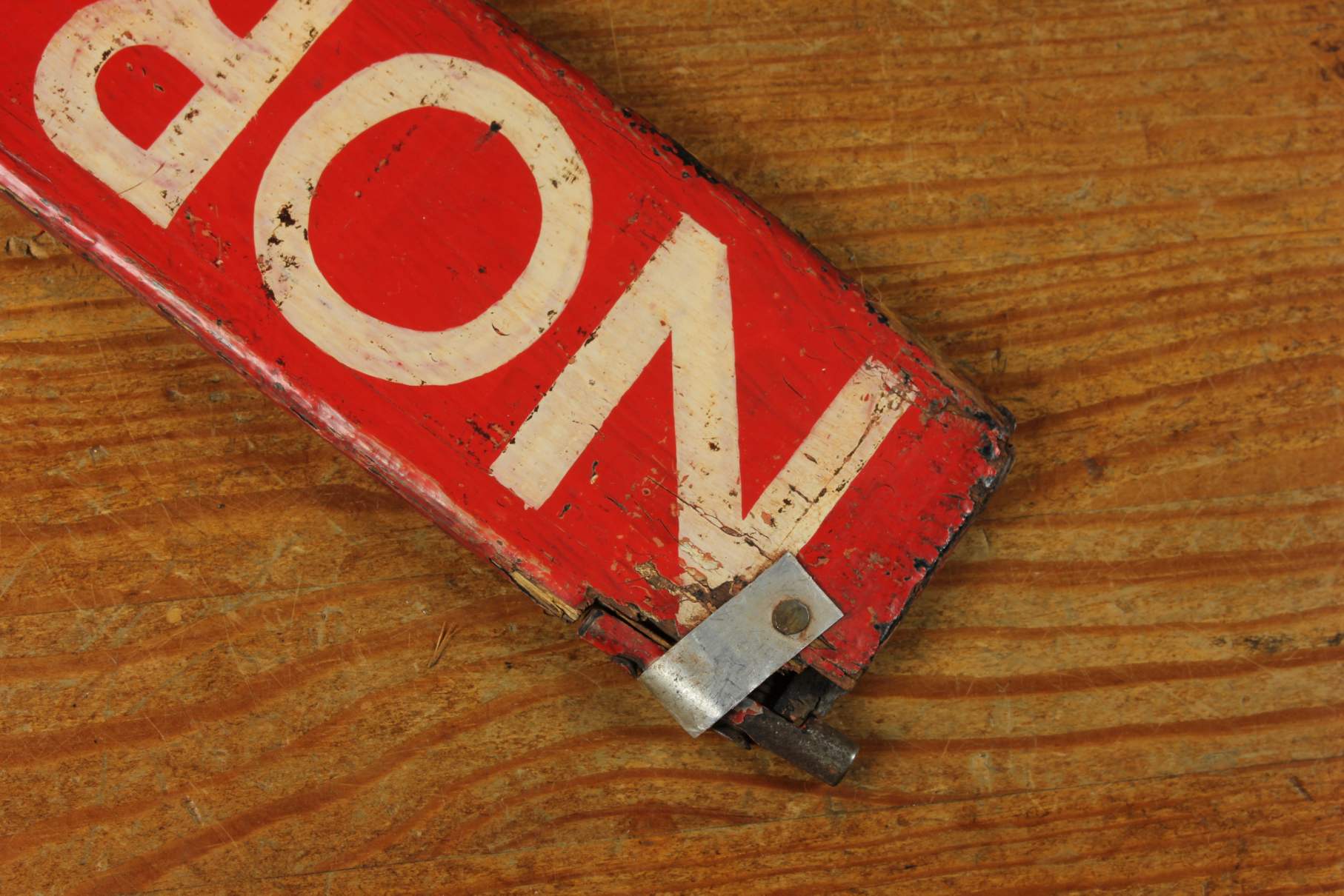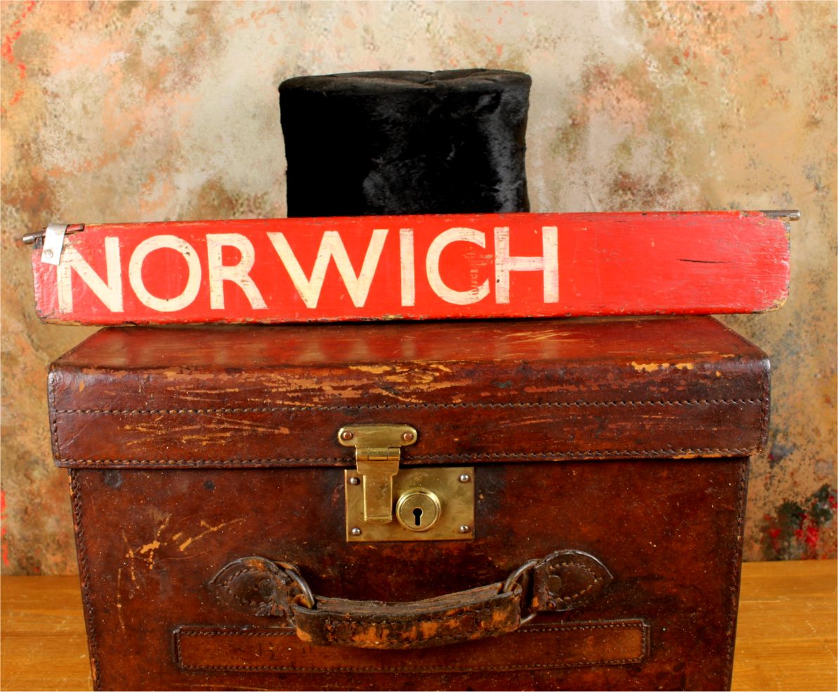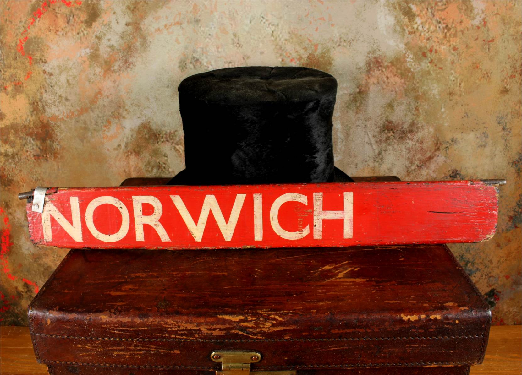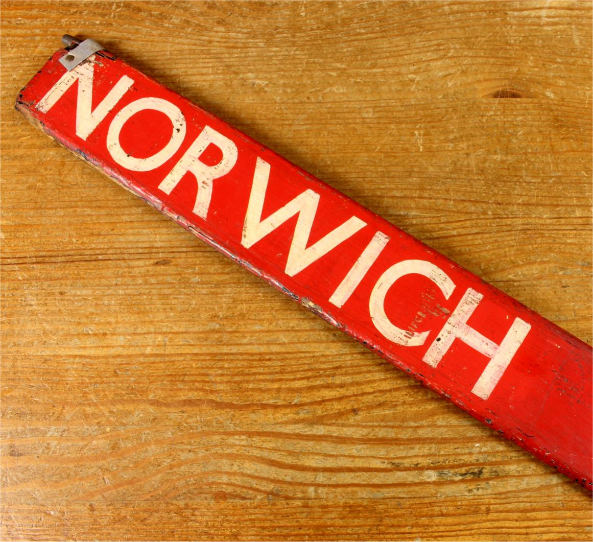 This original c1930 train station destination sign which came from Liverpool Street Station is made of wood and has a red background with the name of the destination station Norwich in hand painted lettering to one side.