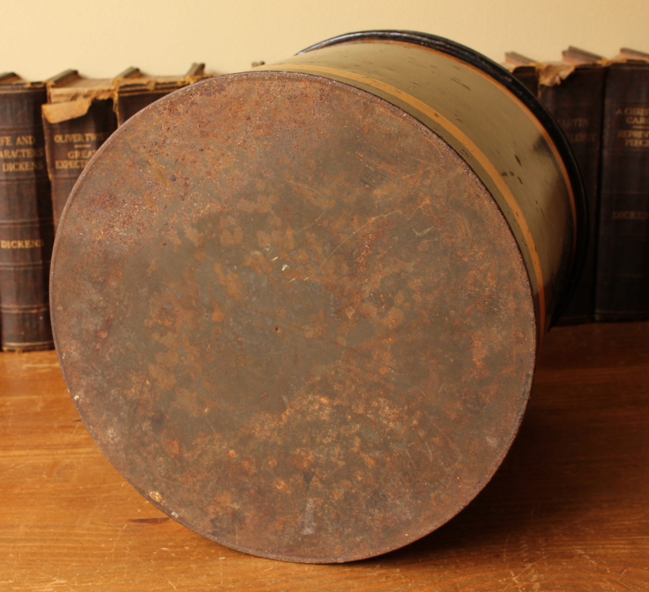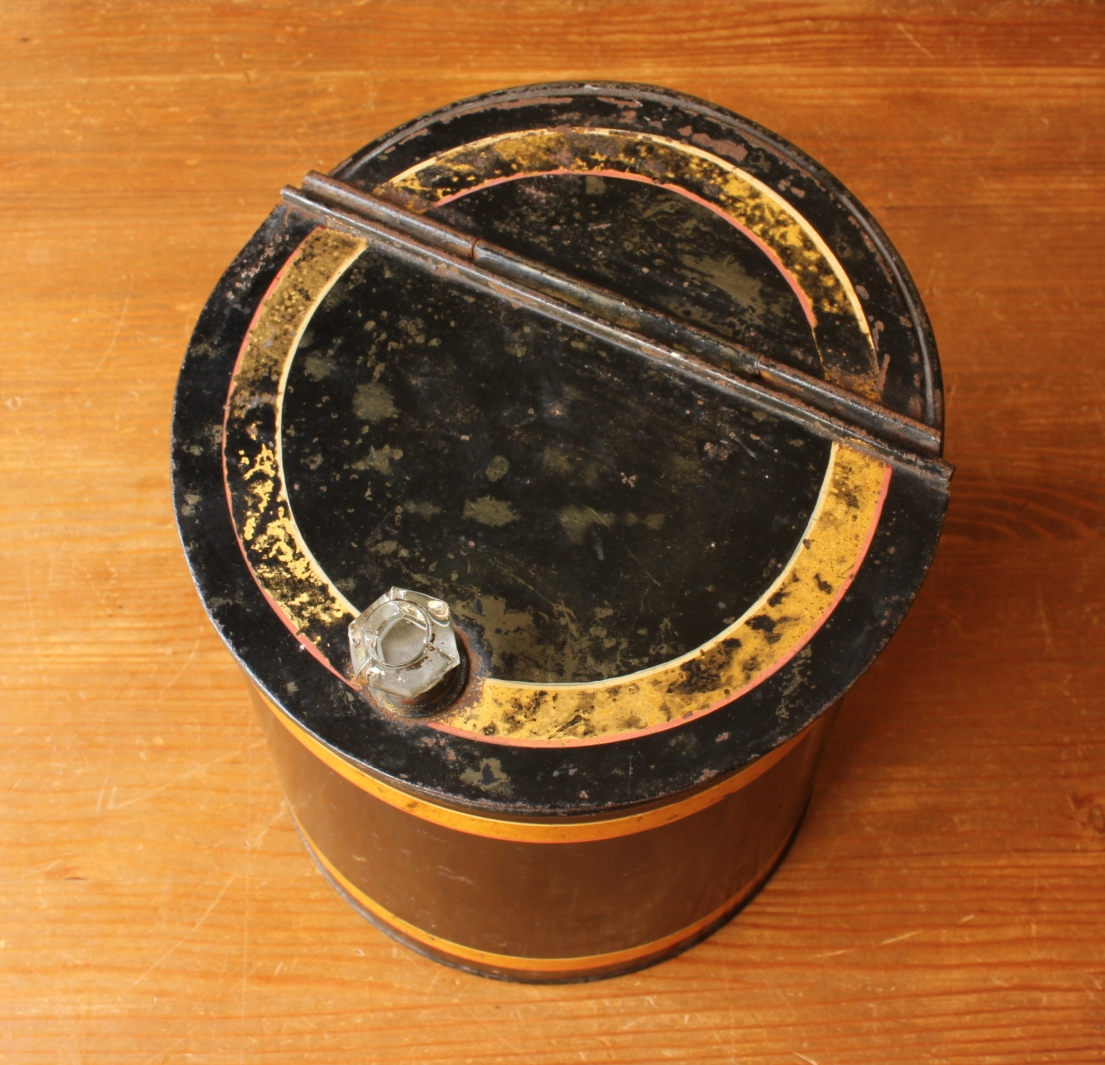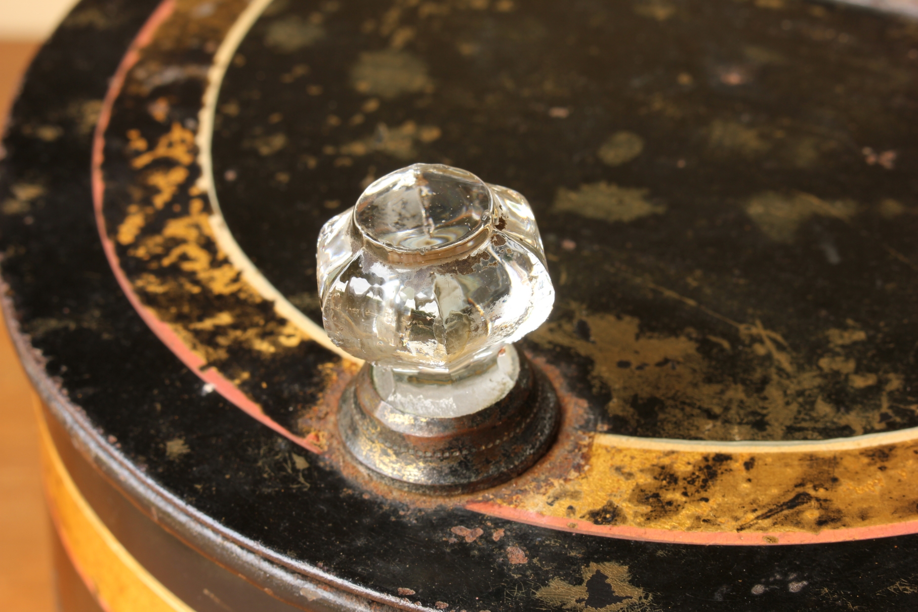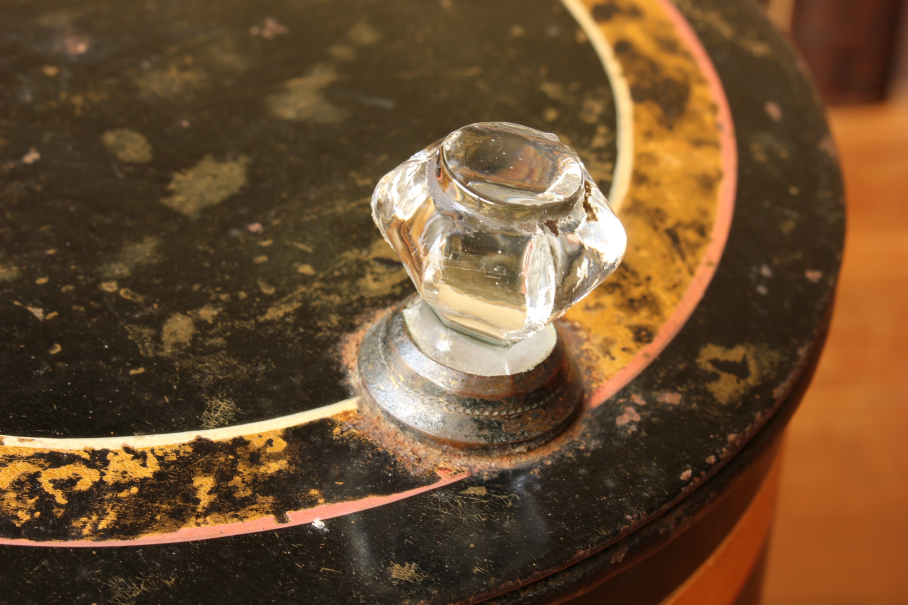 This highly decorative coffee container which is a nice size, would have been used to store tea or coffee in a food store or cafe, has an opening compartment that has a glass knob.