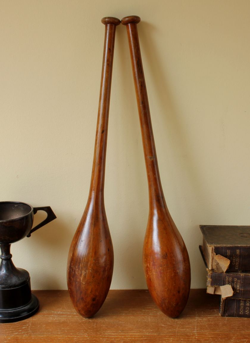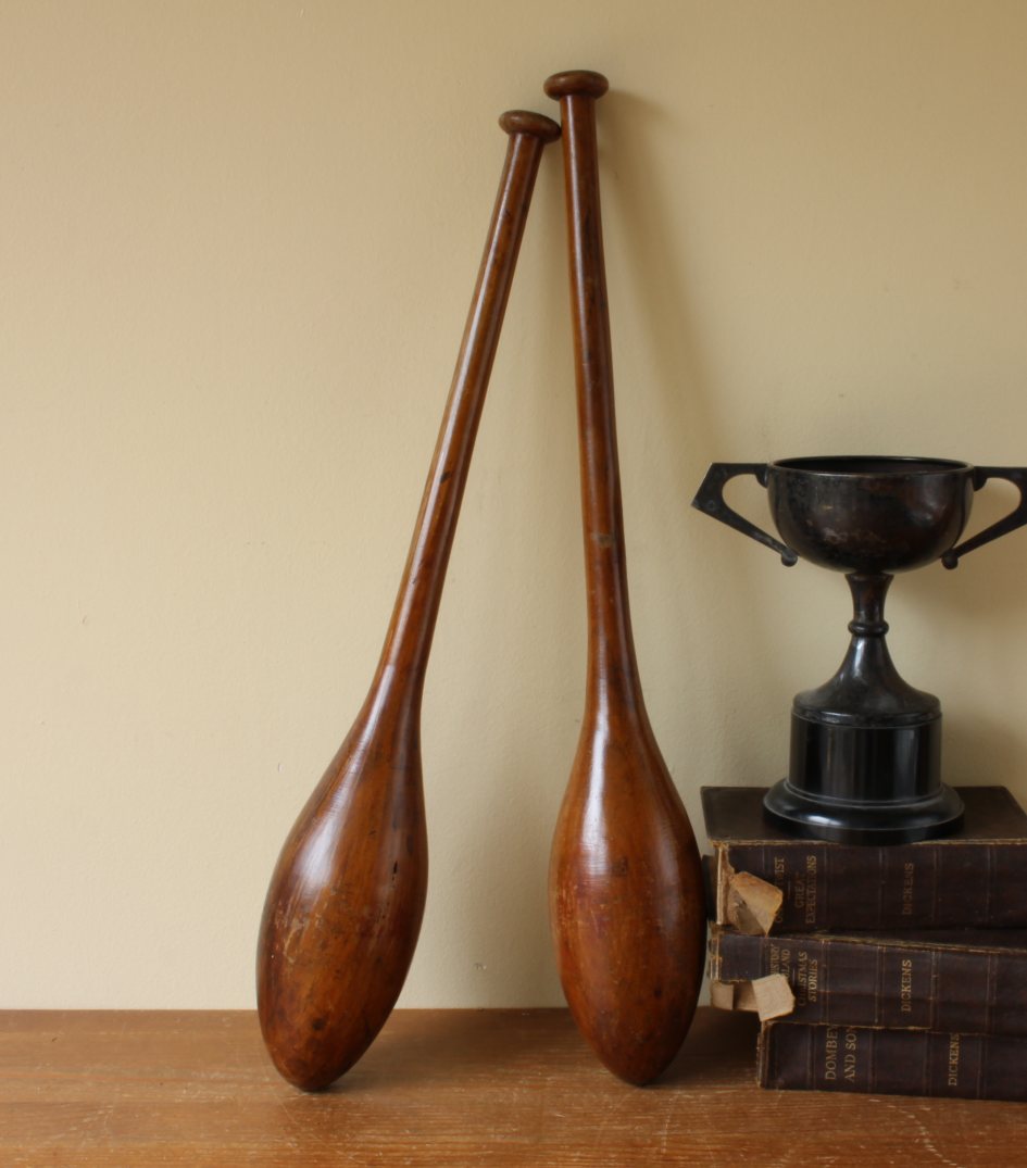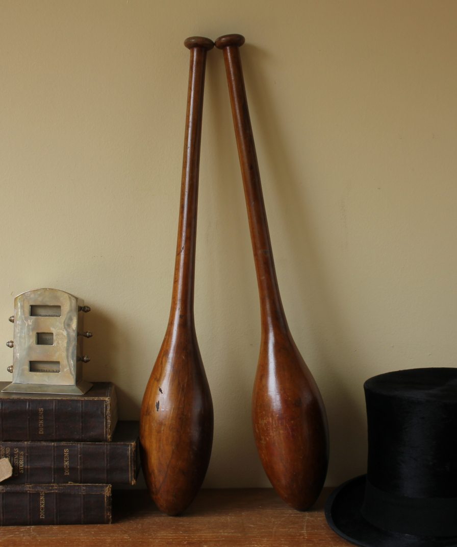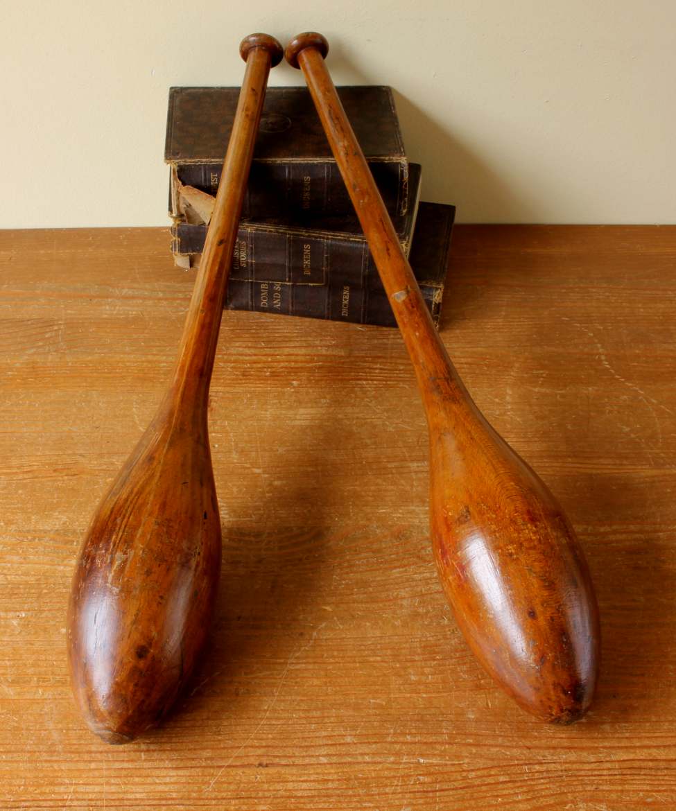 This handsome pair of antique wooden Indian clubs or exercise meels which were hand made in the late 19th / early 20th century have a wonderful rich colour and patina and are marked with a number 3 to the ends.