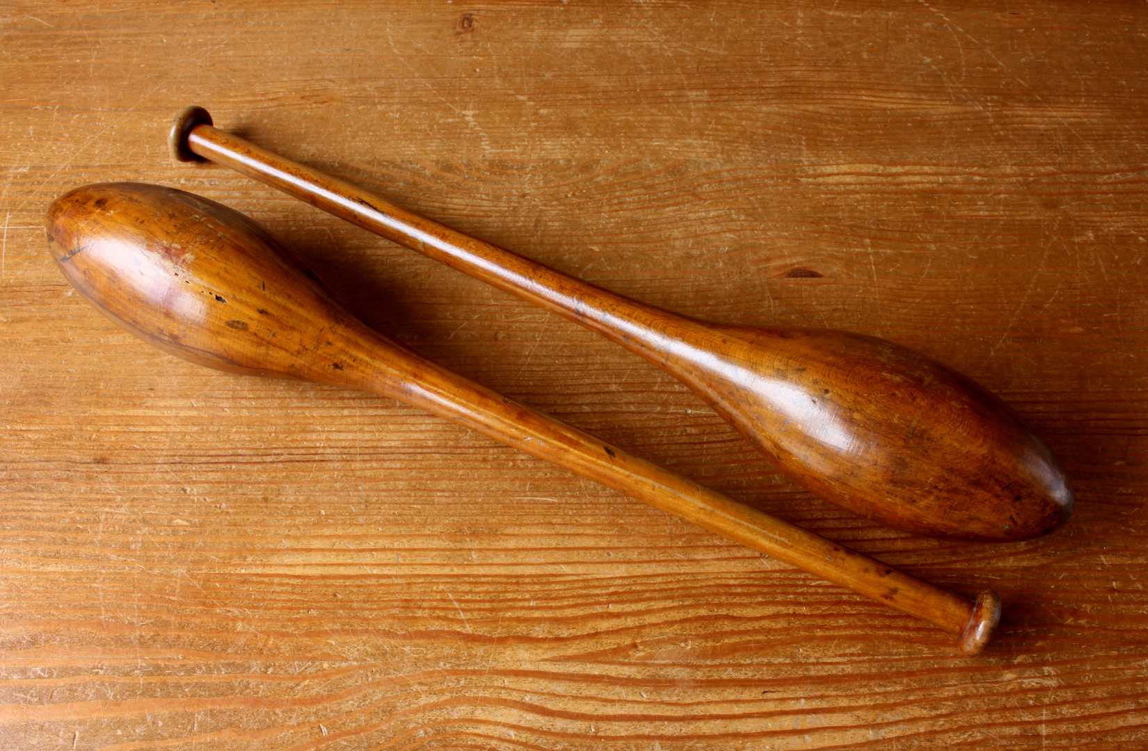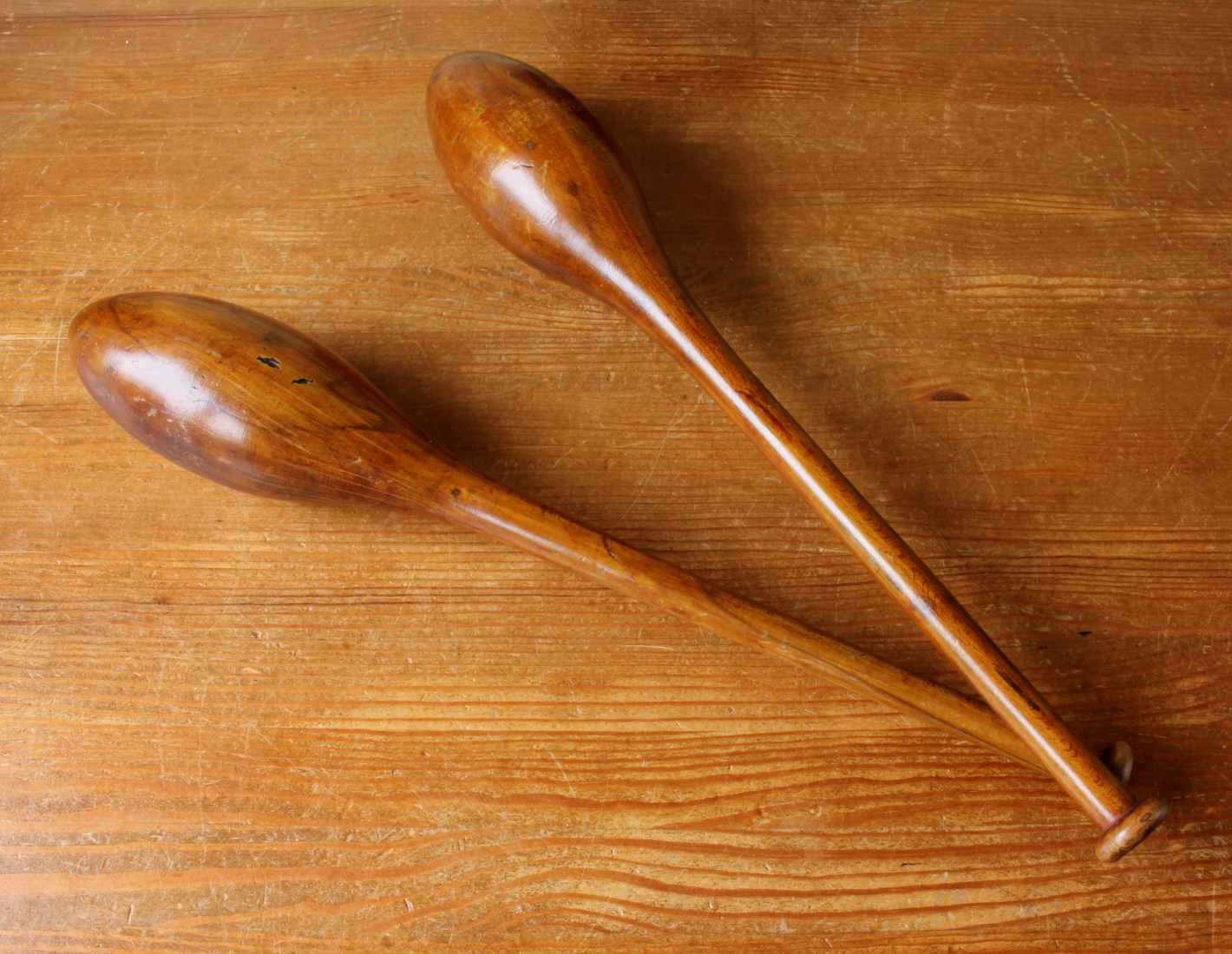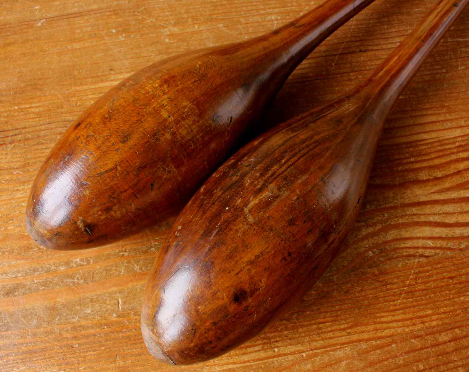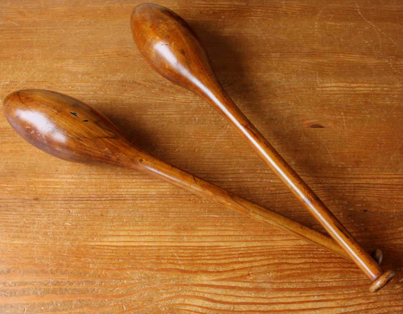 This handsome pair of antique wooden Indian clubs or exercise meels which were hand made in the late 19th / early 20th century have a wonderful rich colour and patina and are marked with a number 3 to the ends.