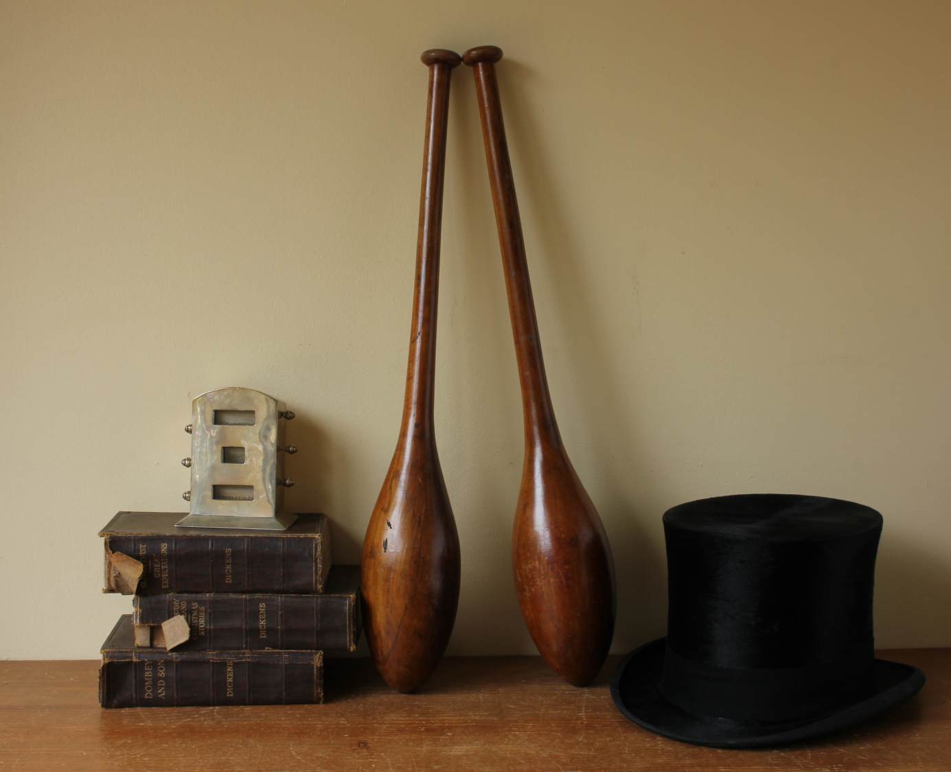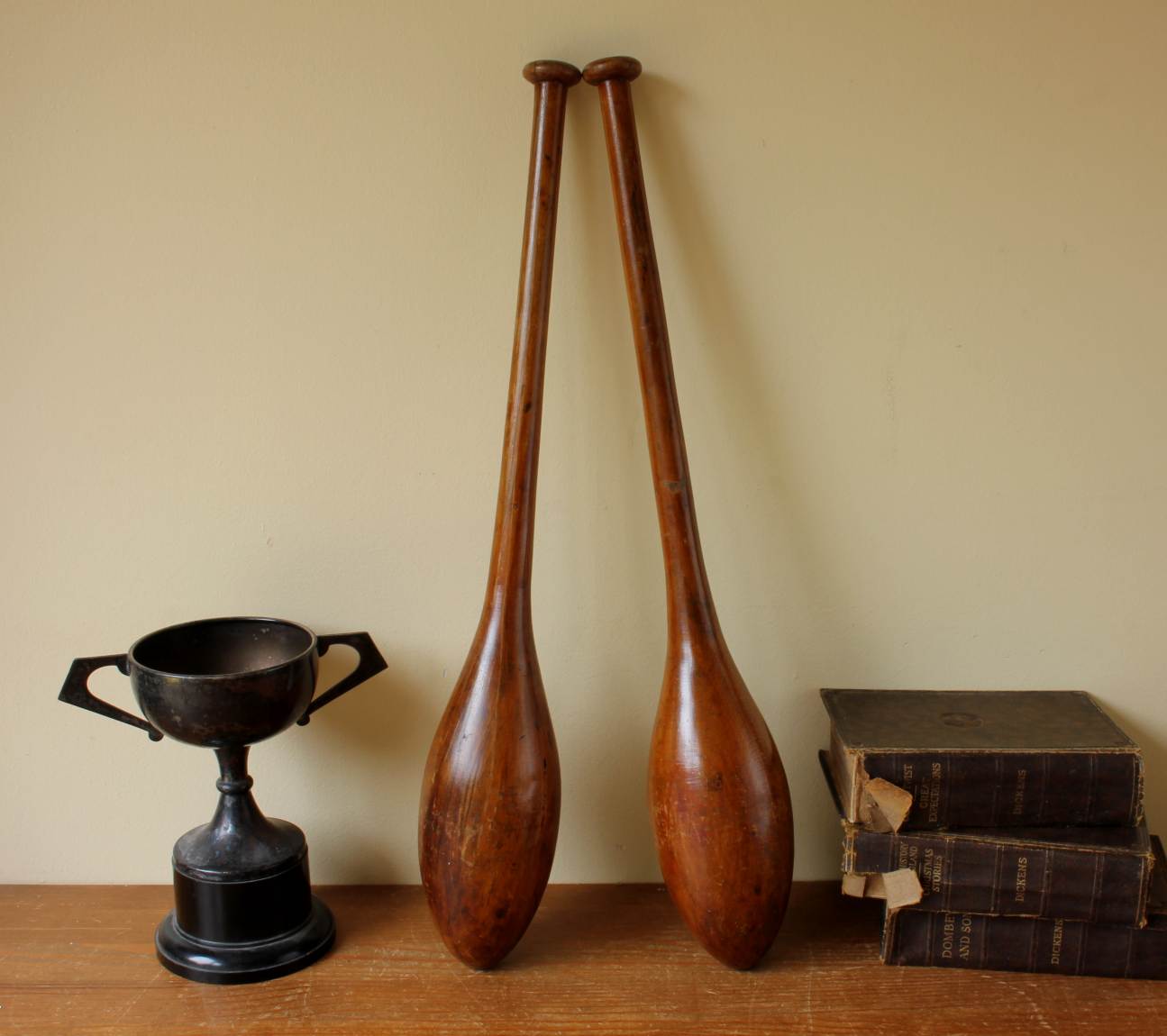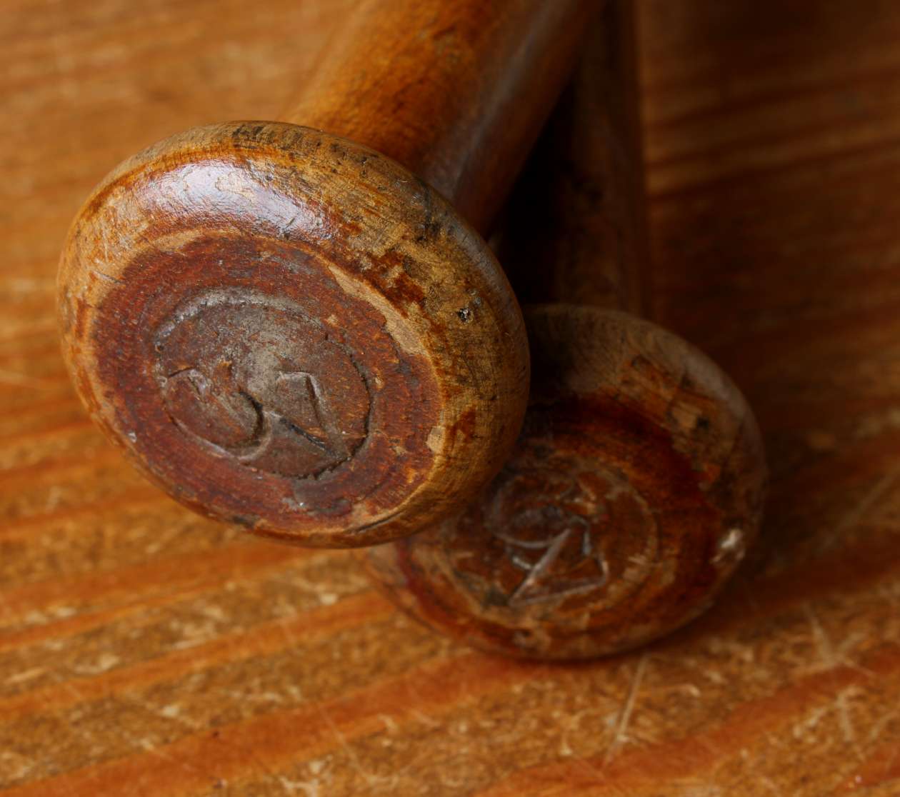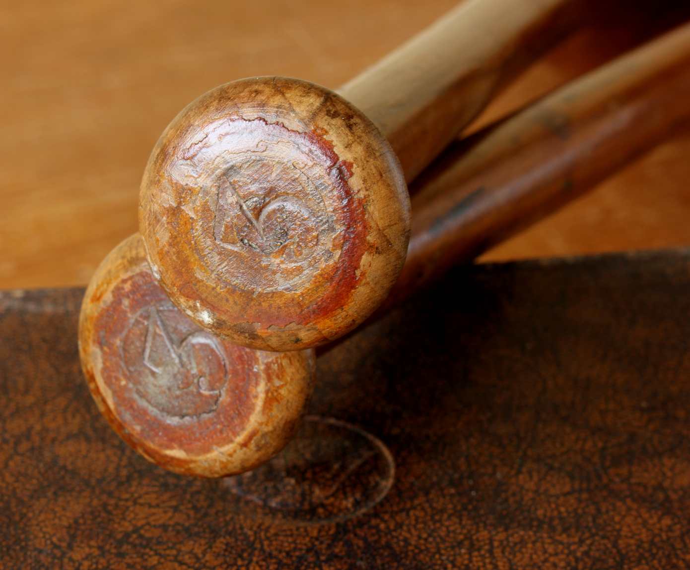 This handsome pair of antique wooden Indian clubs or exercise meels which were hand made in the late 19th / early 20th century have a wonderful rich colour and patina and are marked with a number 3 to the ends.