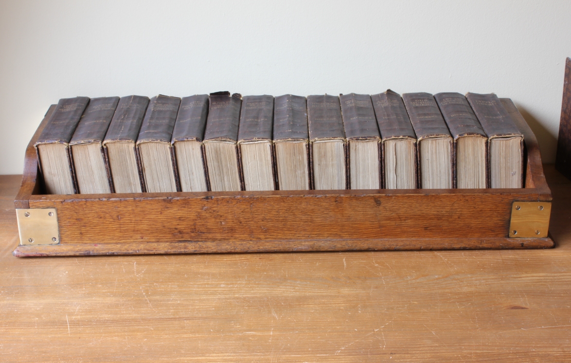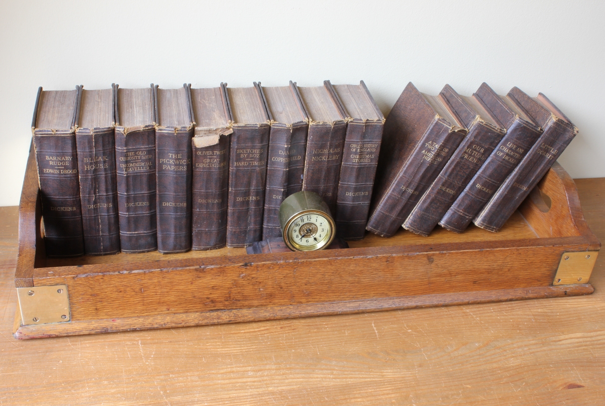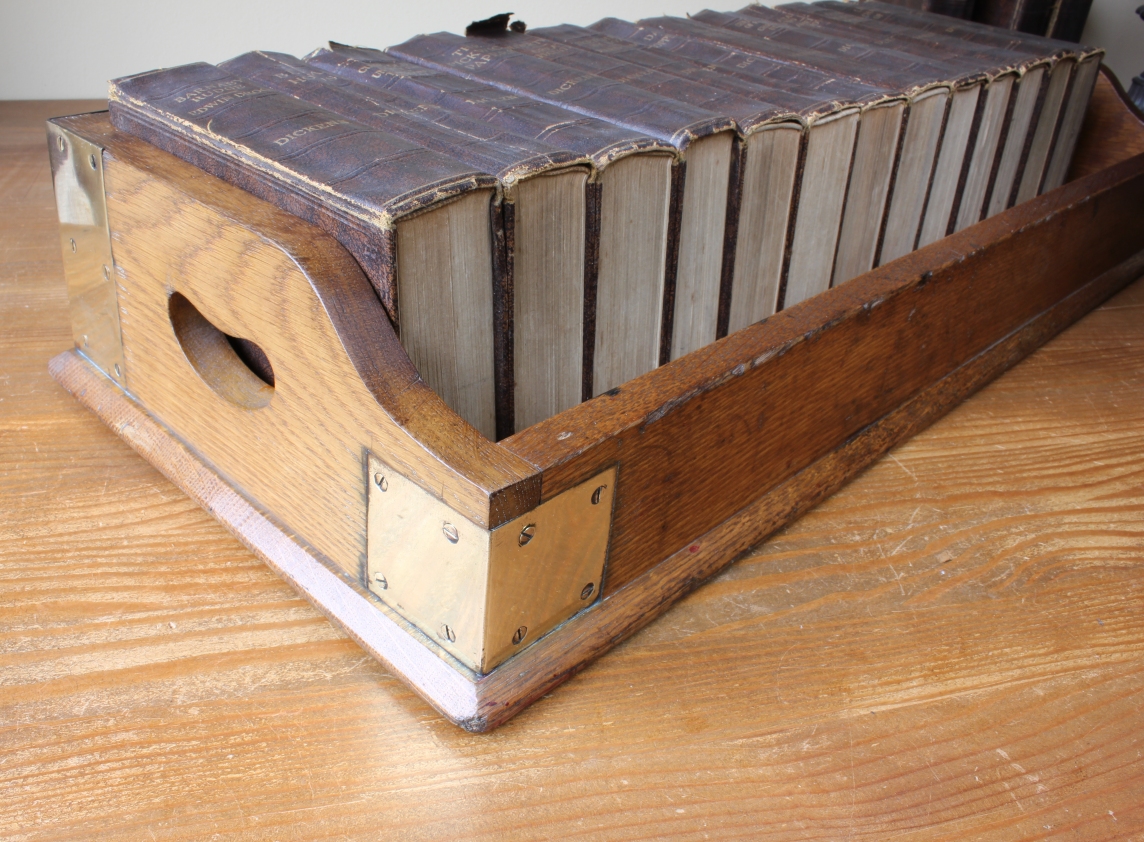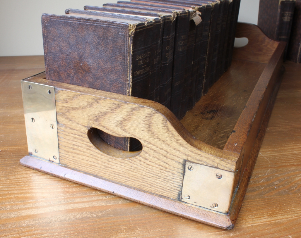 This handsome library book tray which dates from the 19th Century is made of solid oak, has brass corner brackets and gallery sides with cut out handles. It has developed a wonderful used natural patina, is excellent quality and a nice heavy weight.