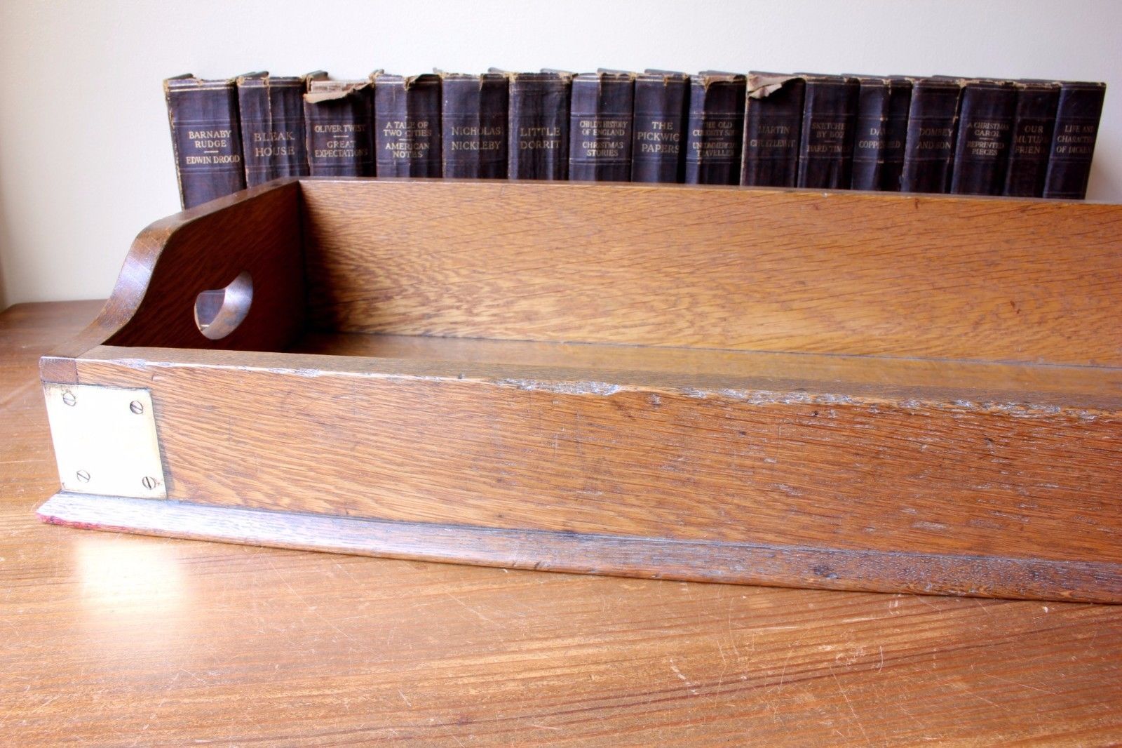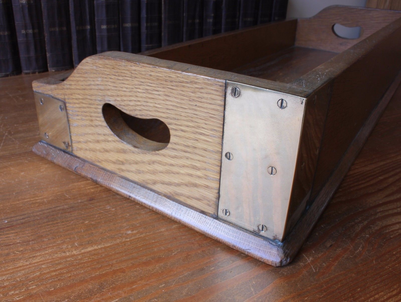 This handsome library book tray which dates from the 19th Century is made of solid oak, has brass corner brackets and gallery sides with cut out handles. It has developed a wonderful used natural patina, is excellent quality and a nice heavy weight.