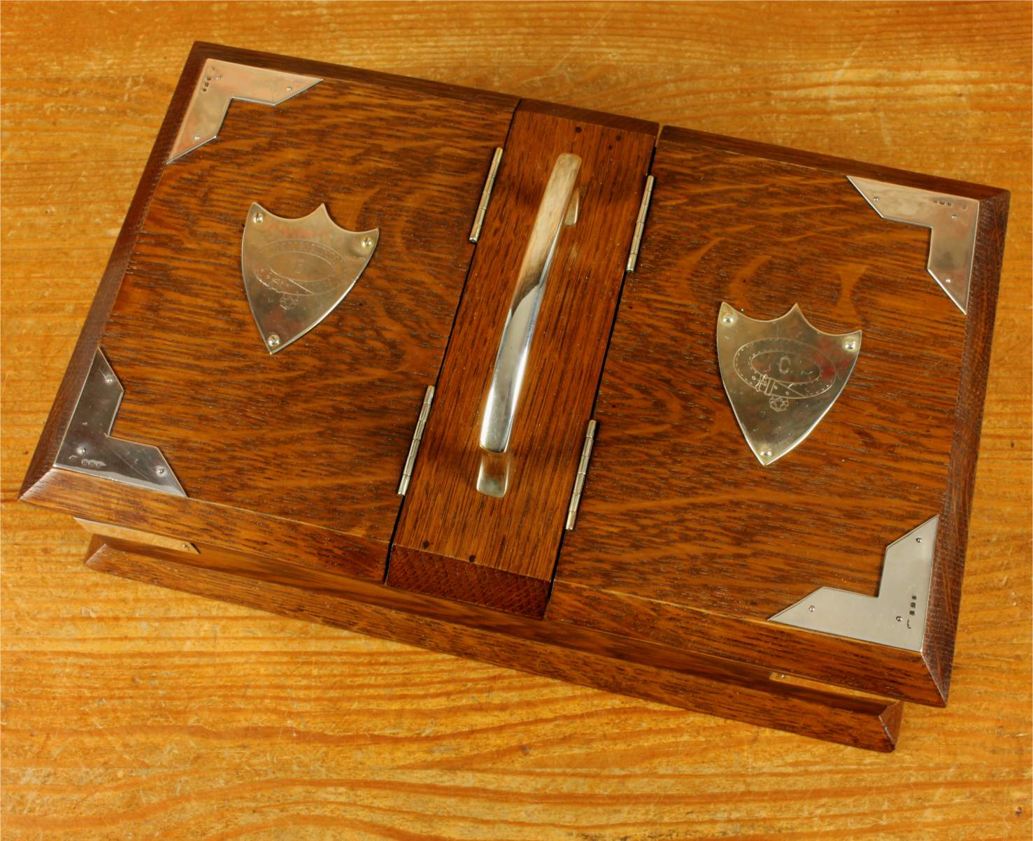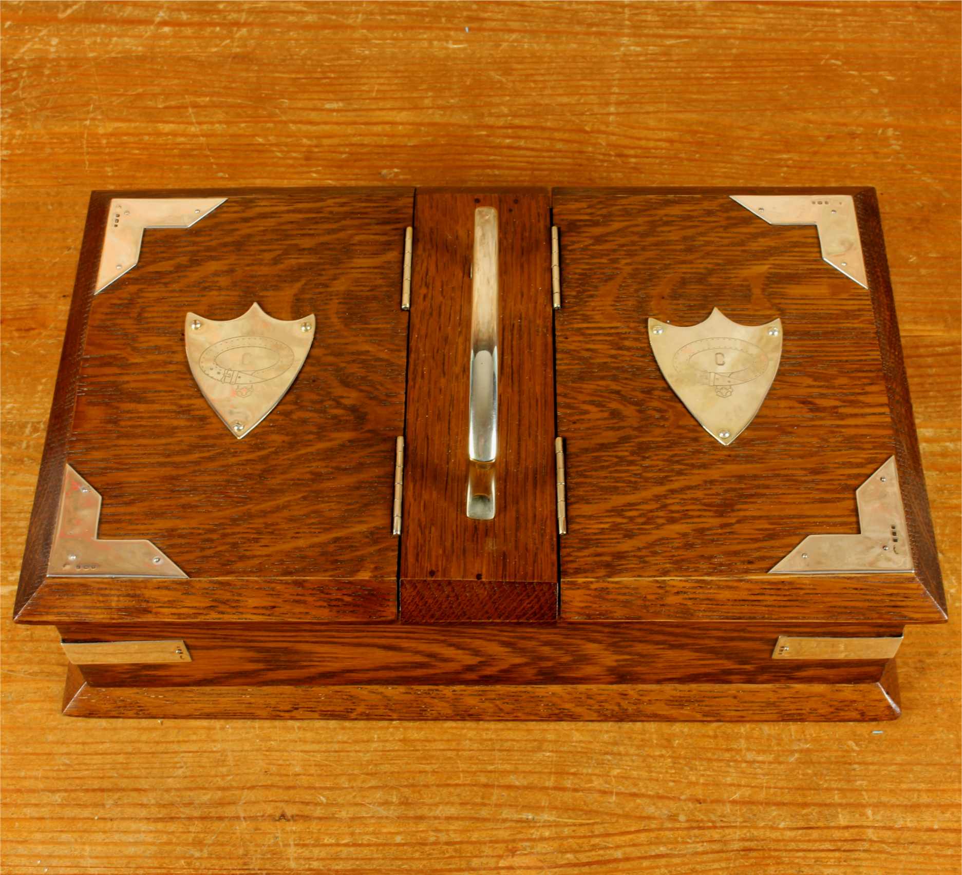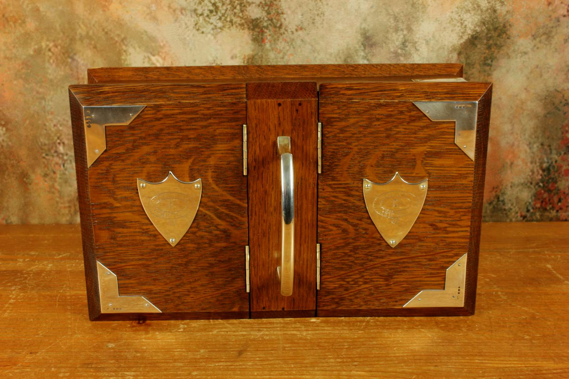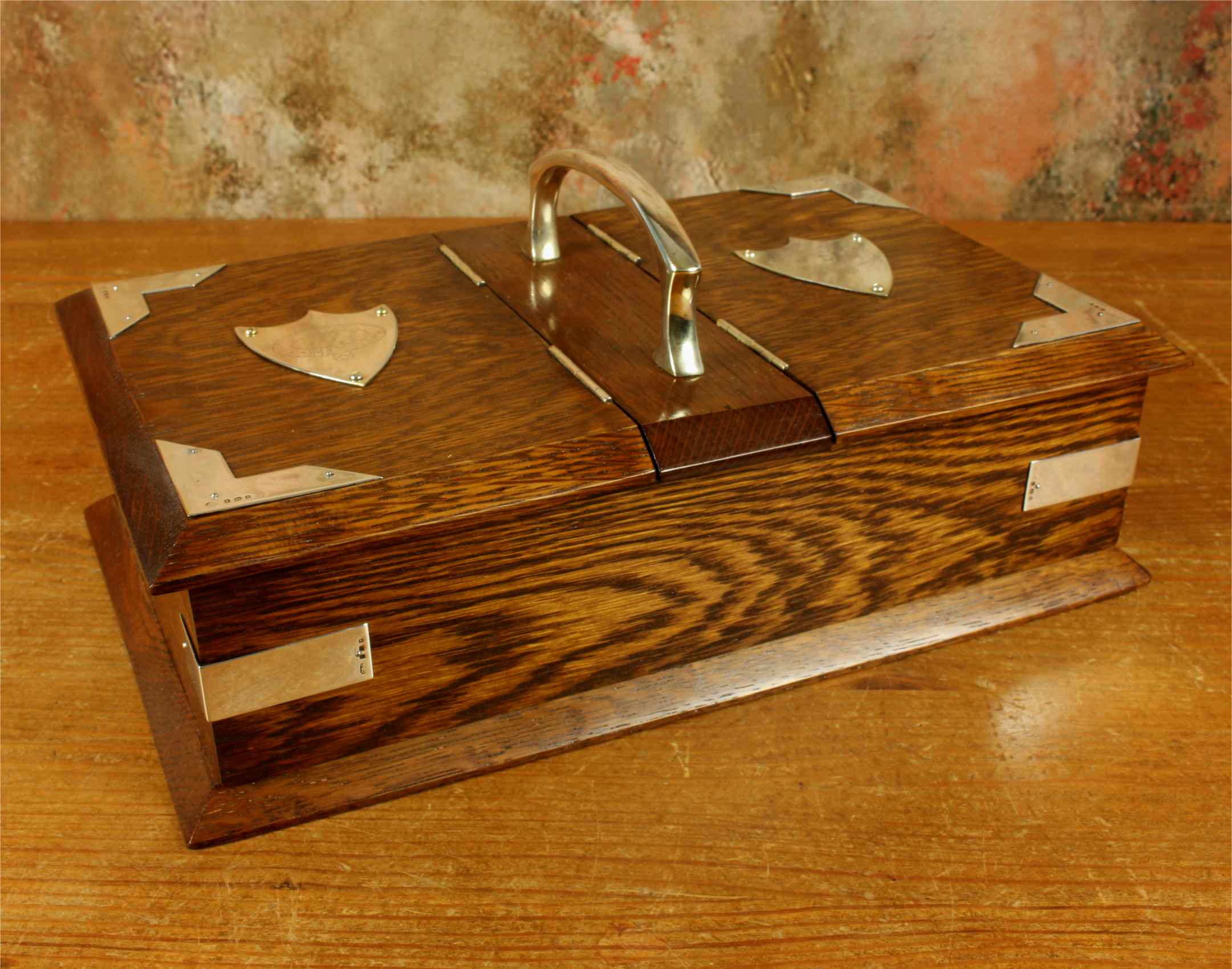 This oak box has hallmarked fittings to the top and edges which date to 1920. The top is also fitted with two silver plate shields which bear a monogrammed crest and the letter C.