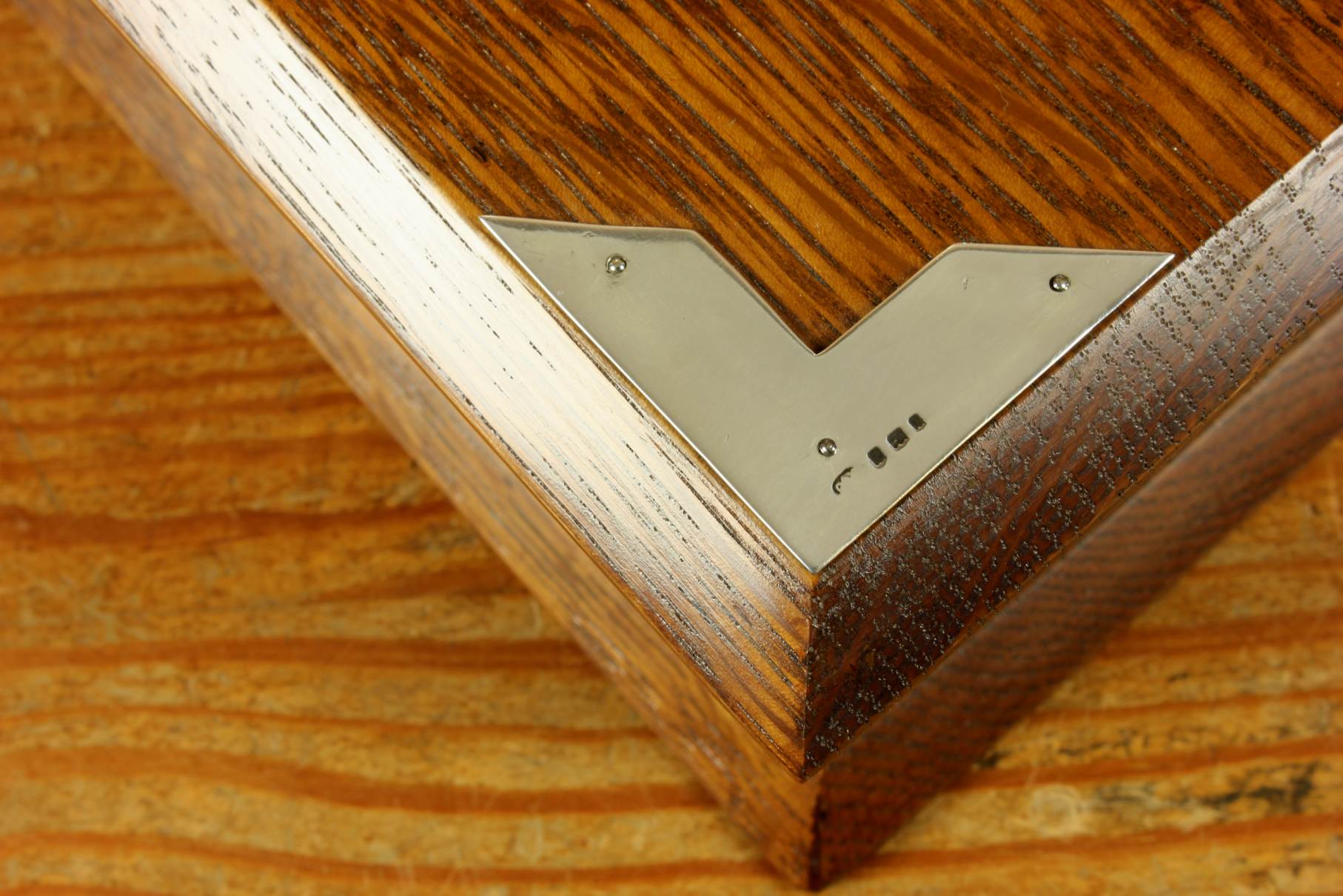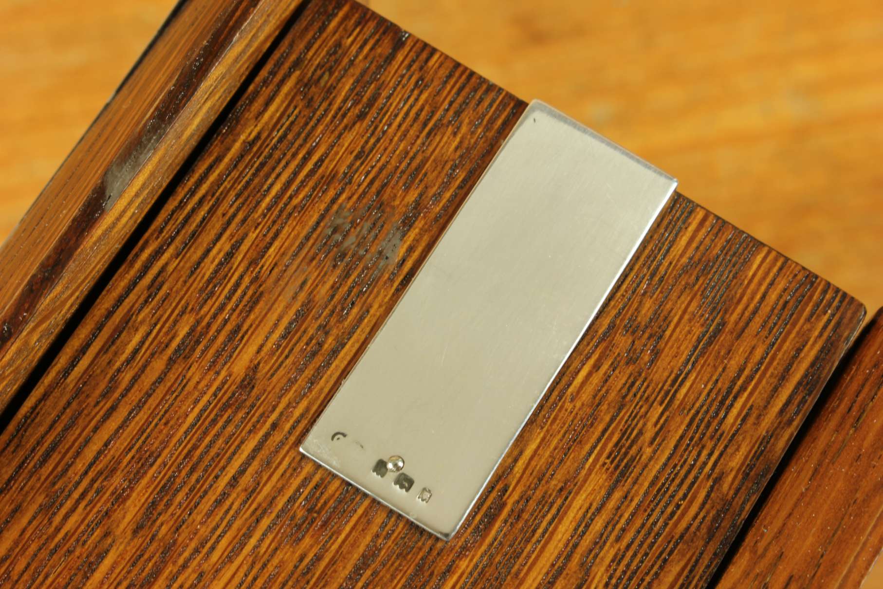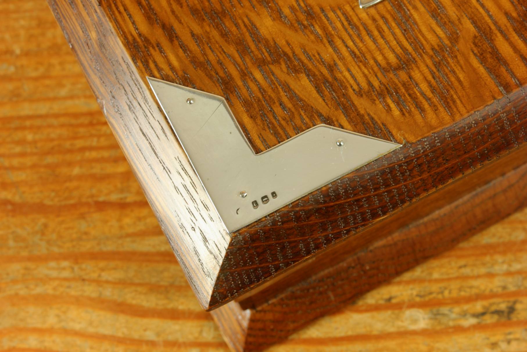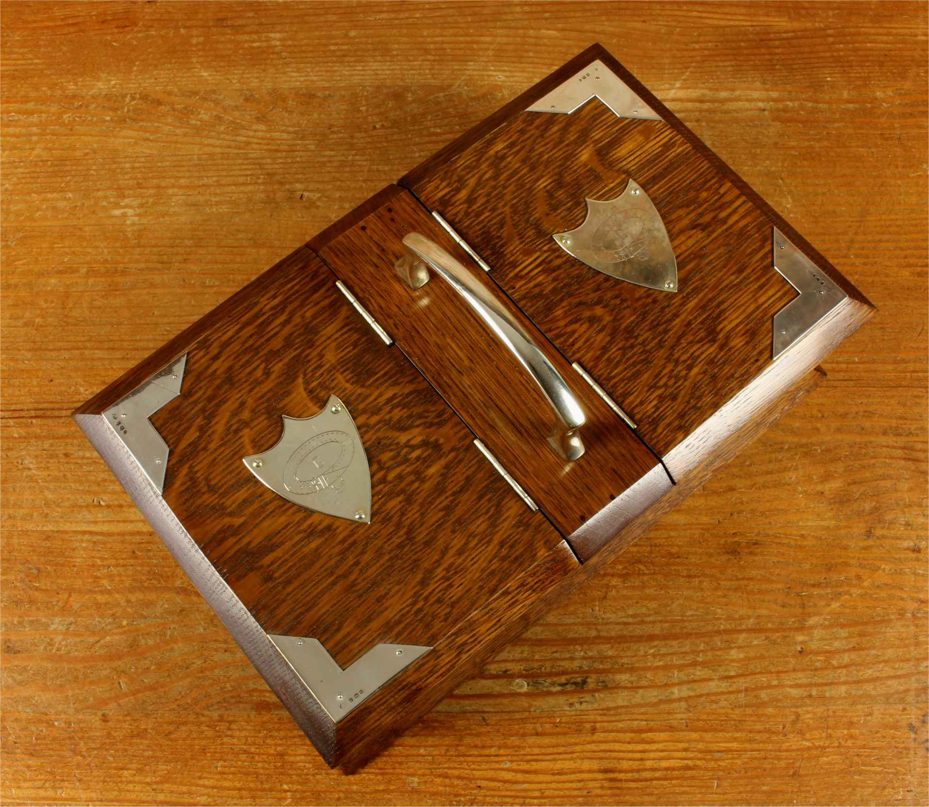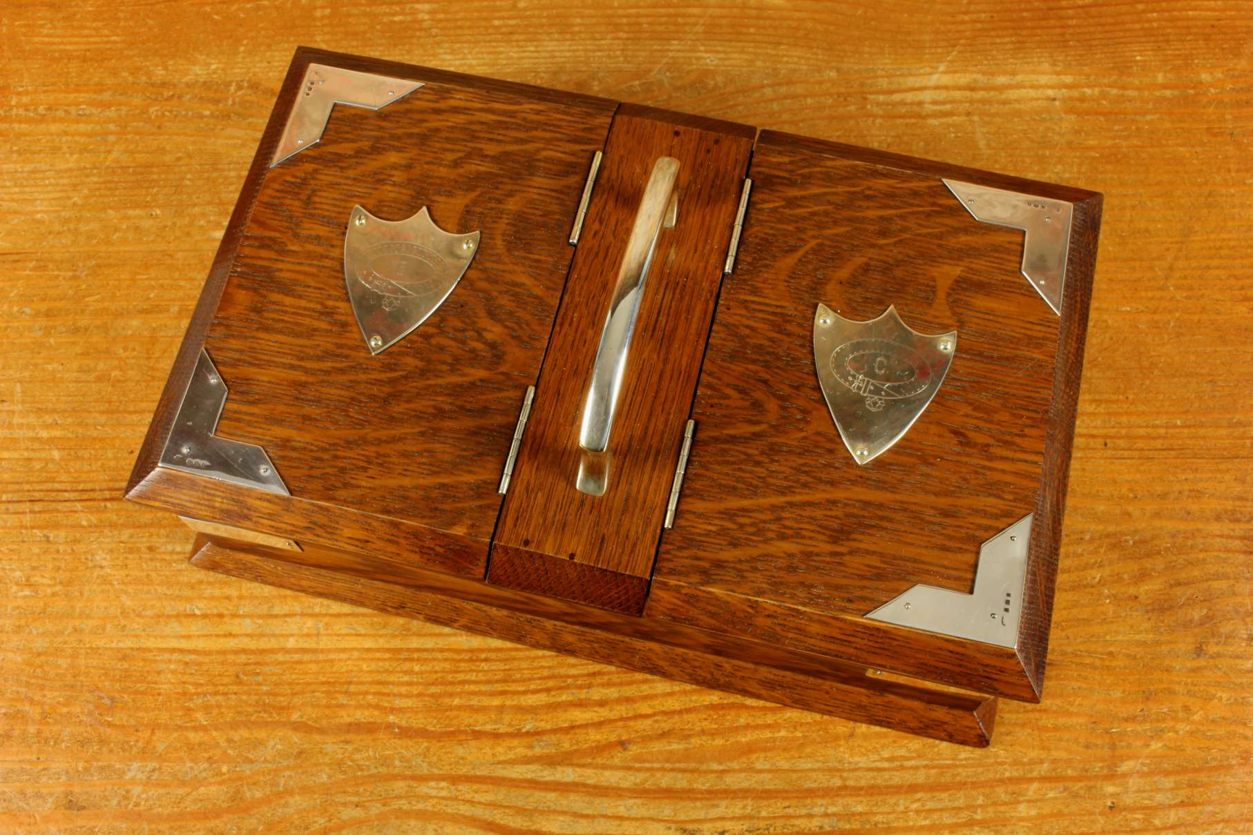 This oak box has hallmarked fittings to the top and edges which date to 1920. The top is also fitted with two silver plate shields which bear a monogrammed crest and the letter C.