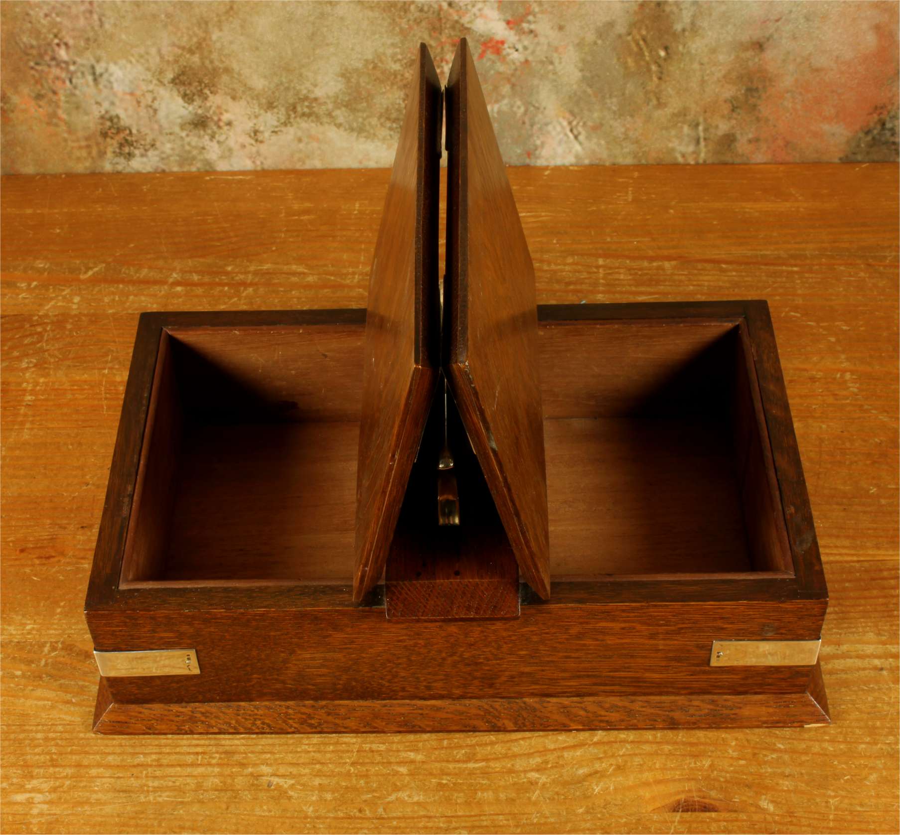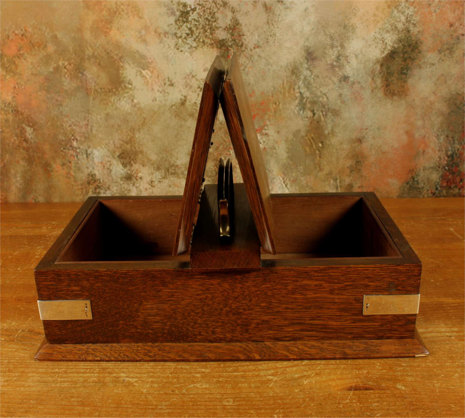 This handsome antique table humidor which is made of English oak dates from 1920 and has two lift up hinged lids to the top that when lifted reveal two compartments.