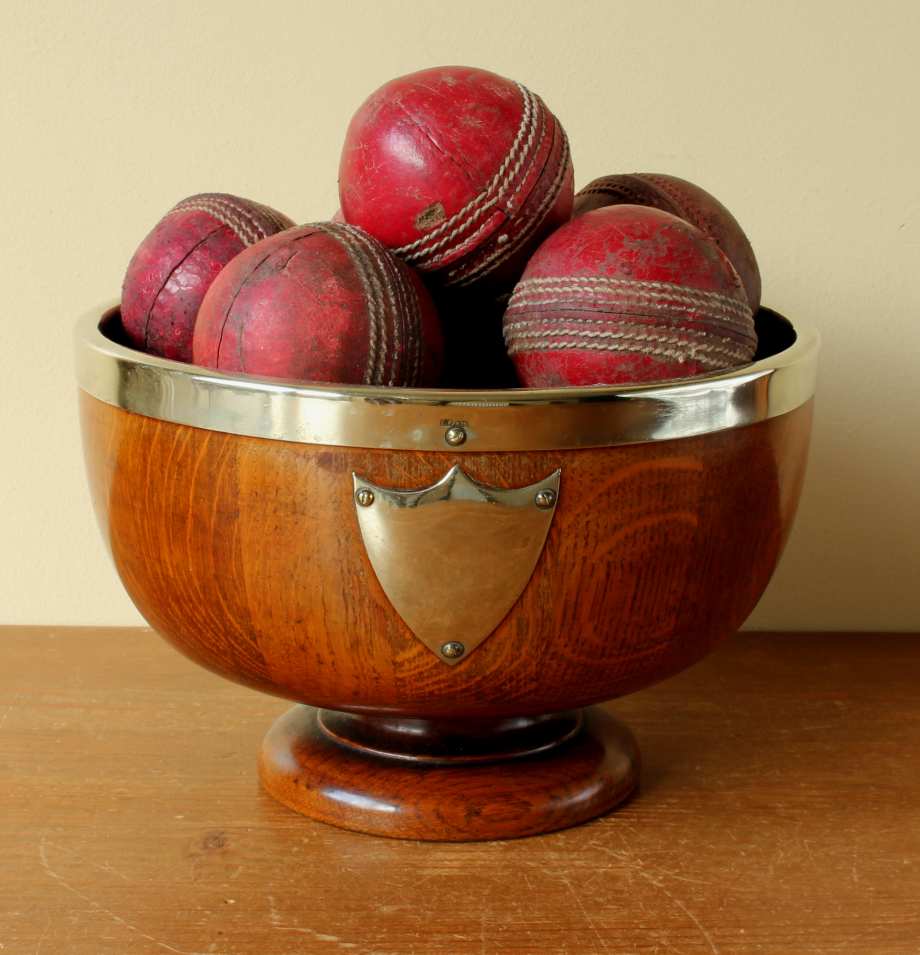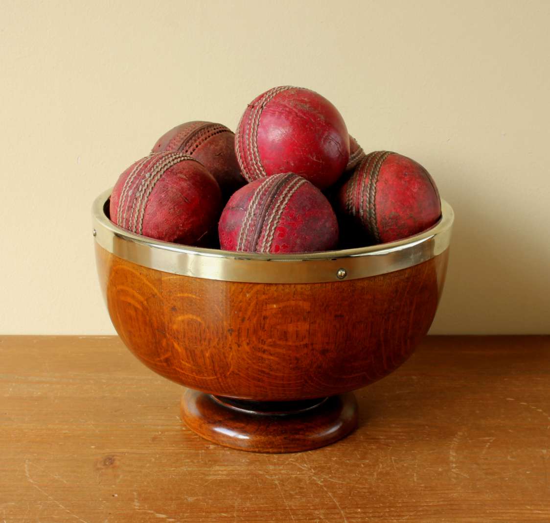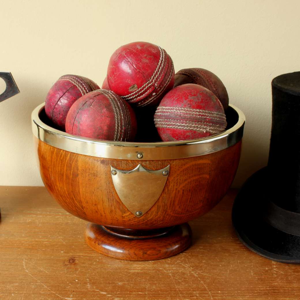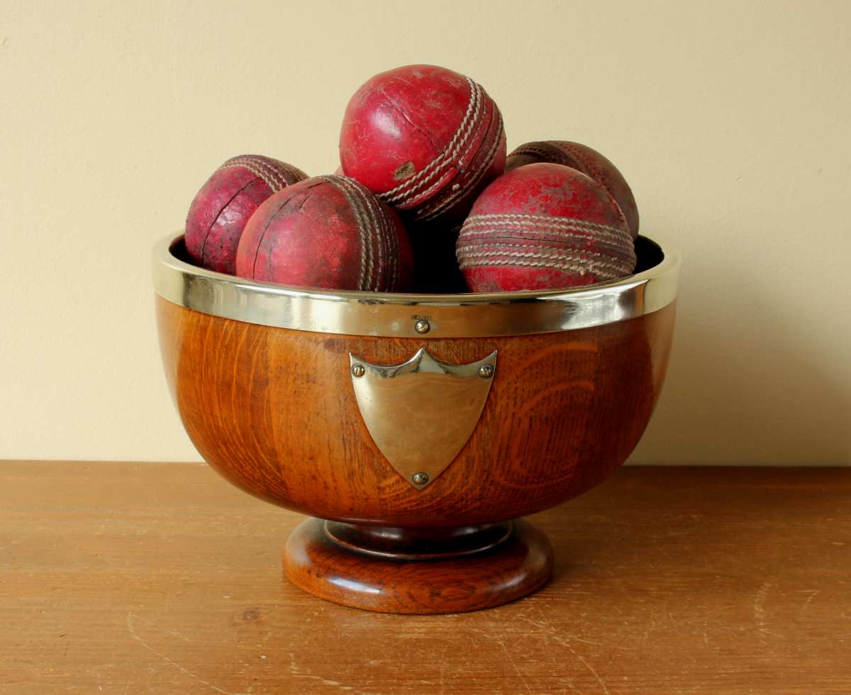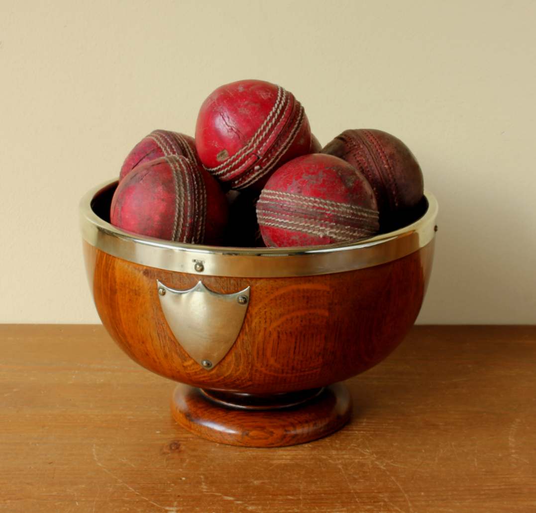 This English Oak trophy bowl which dates from c1900 has silver plated fittings and is filled with 12 vintage leather cricket balls.