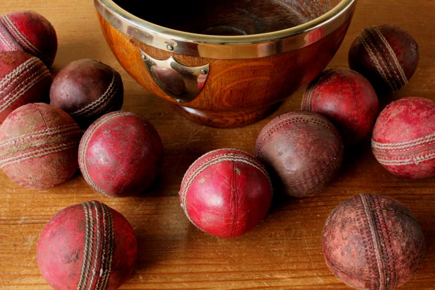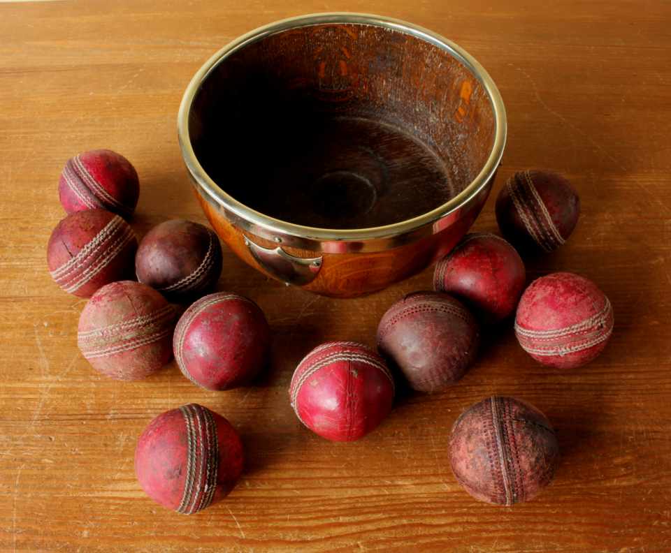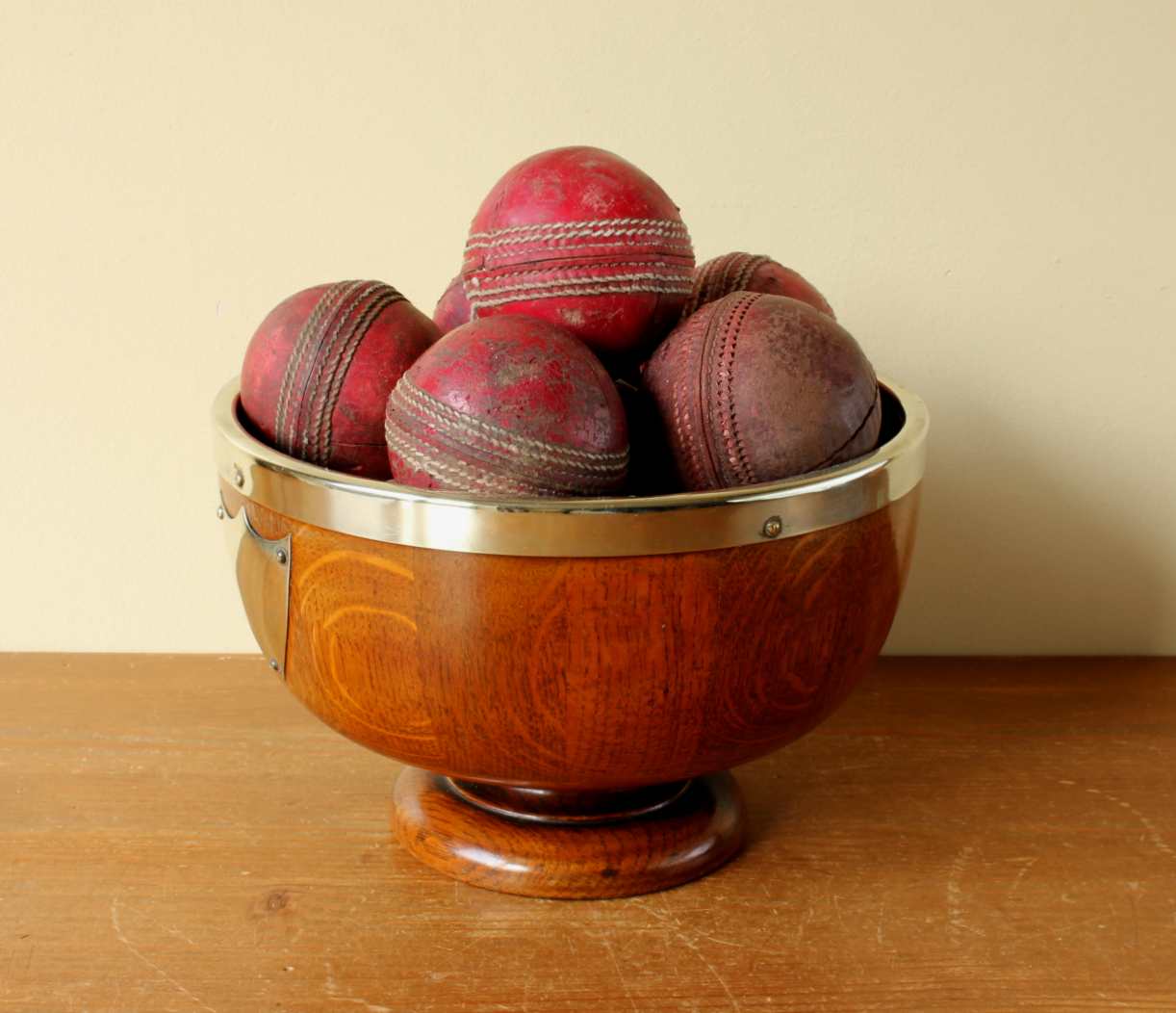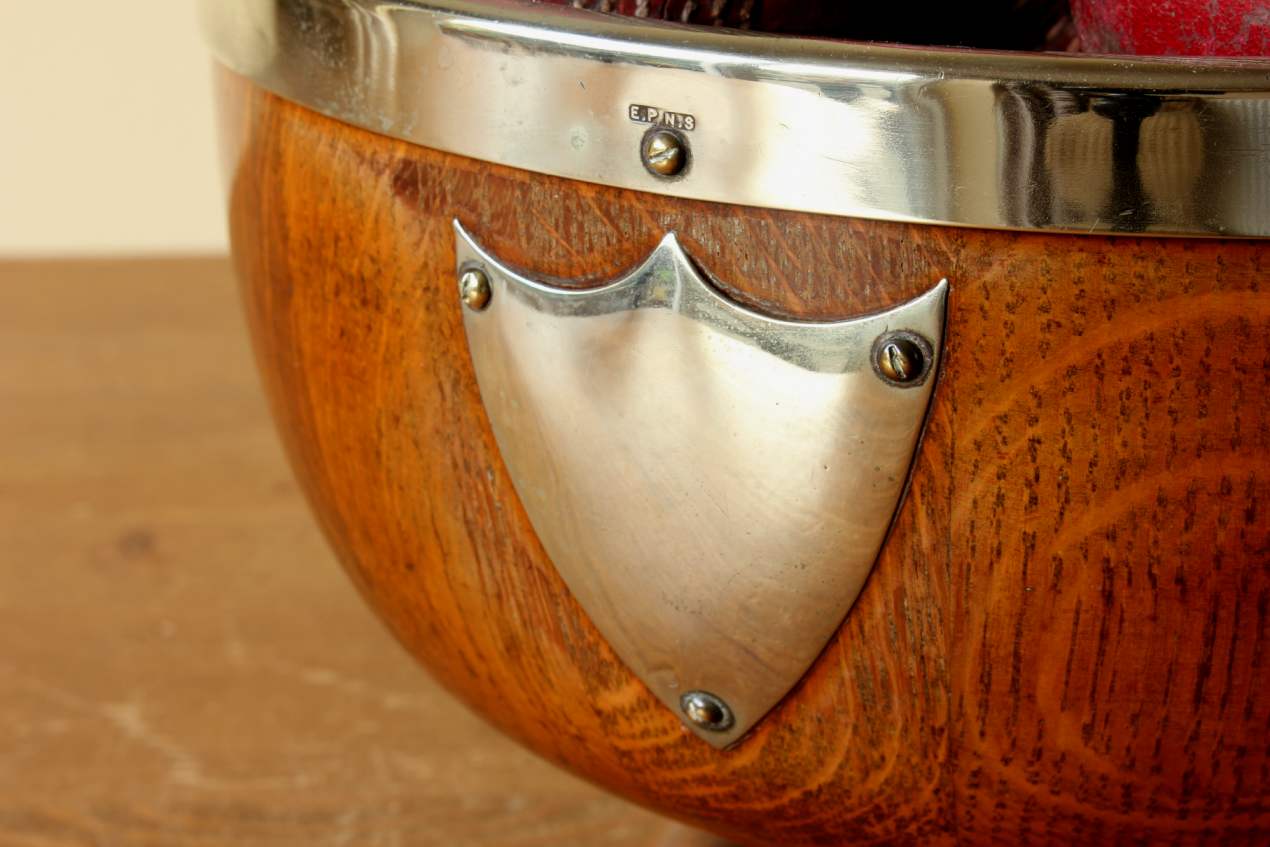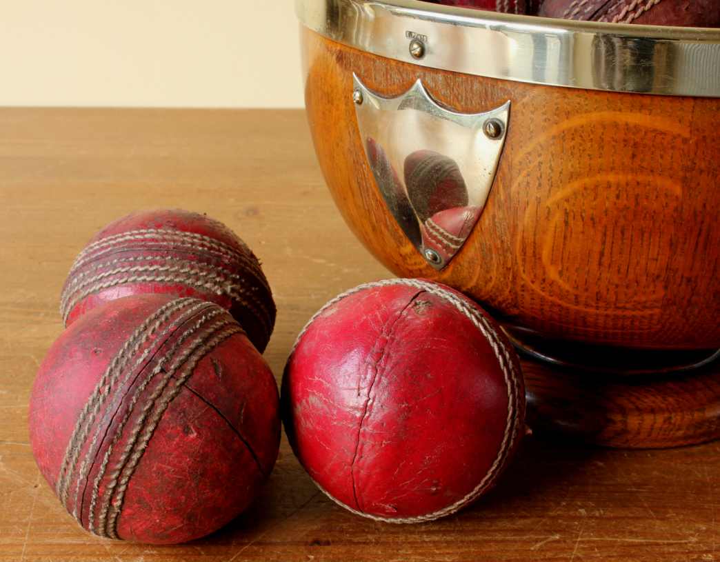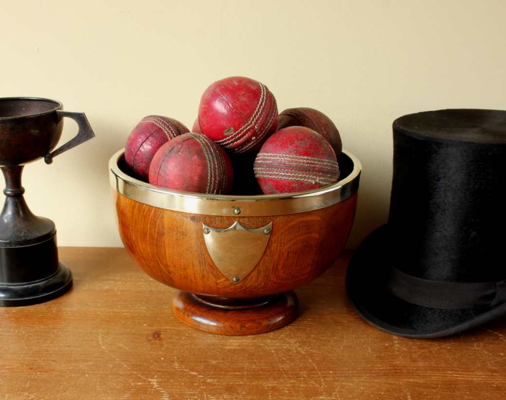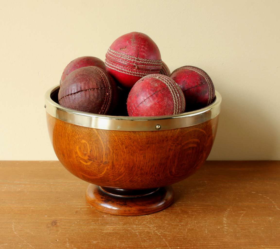 This English Oak trophy bowl which dates from c1900 has silver plated fittings and is filled with 12 vintage leather cricket balls.
