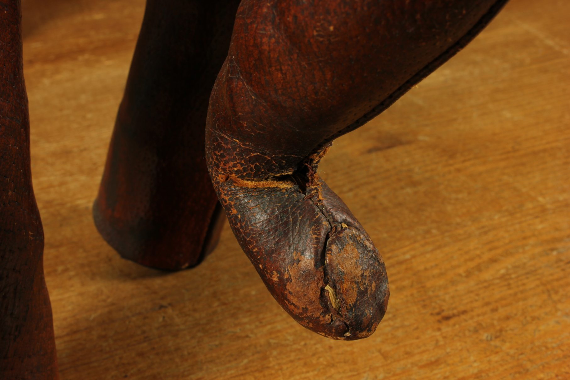 This desirable large size elephant which is made of a beautiful thick soft leather has his trunk turned up at the end, two lovely big ears, glass eyes, leather tusks and a tail with tassel end.