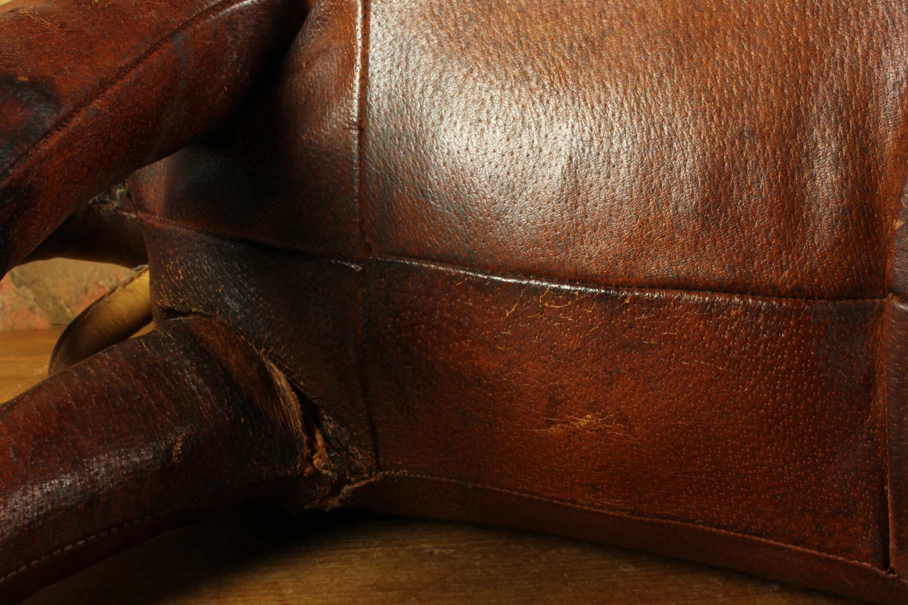 Condition: Nice pre-loved vintage condition with signs of use. There is some damage to the leather and legs. One leg is loose and the other is bent. Some marks, scuffs, rips and wear. Some repairs and restoration. Has a wonderful aged patina. Please see pictures.