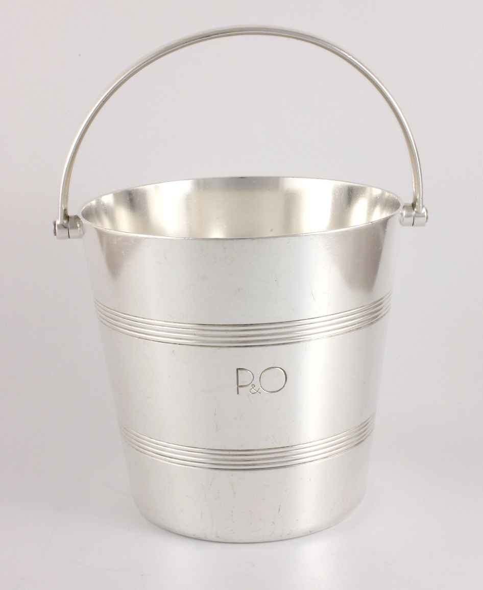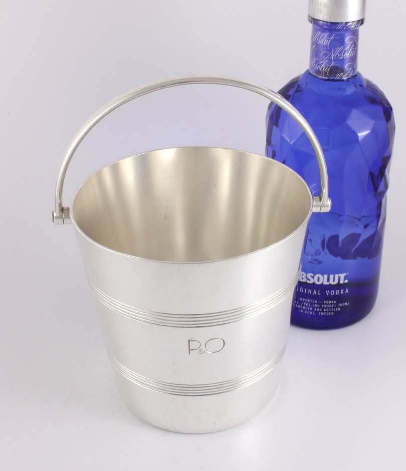 This ice bucket which is a good heavy weight has a top swing handle, a ring design to the body and engraved with P&O.