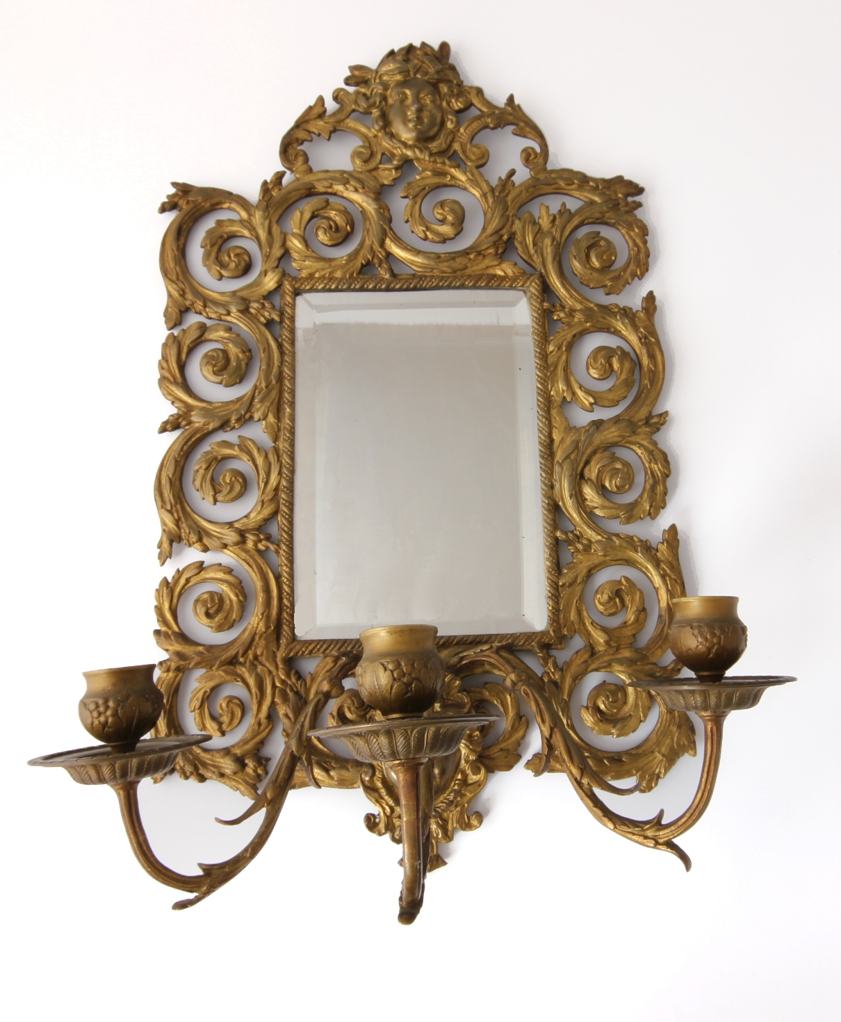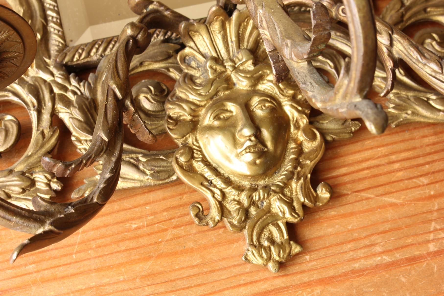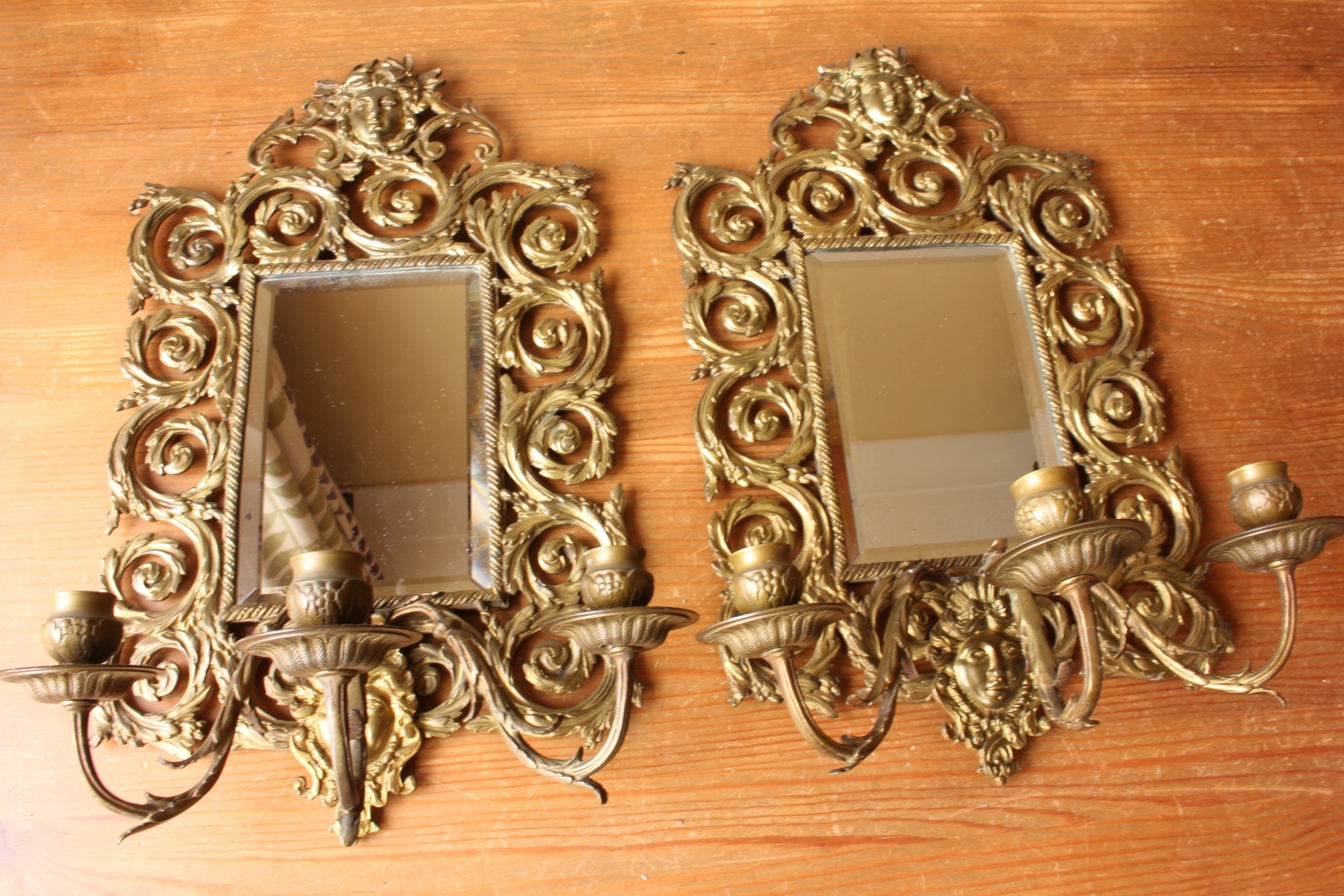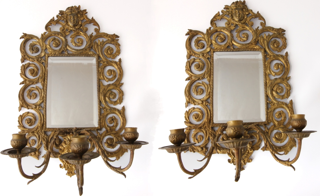 This beautiful pair of 19th Century French brass framed wall mirrors which feature a stylish Rococo scroll design with a ladies face mask to the top and bottom have central triple arm candle holders.