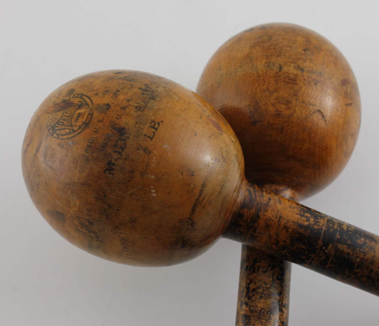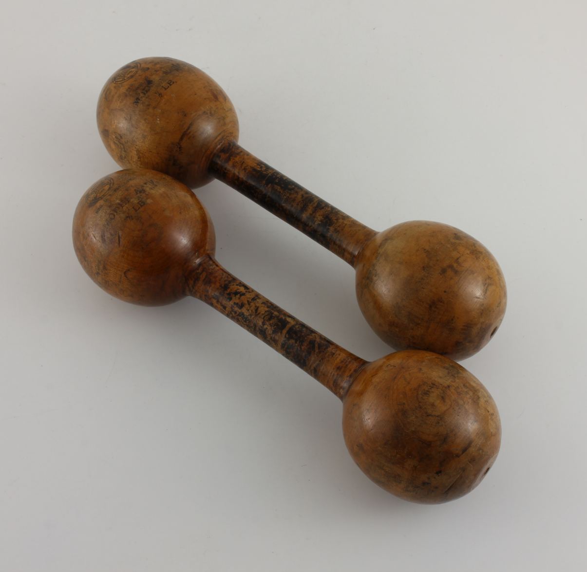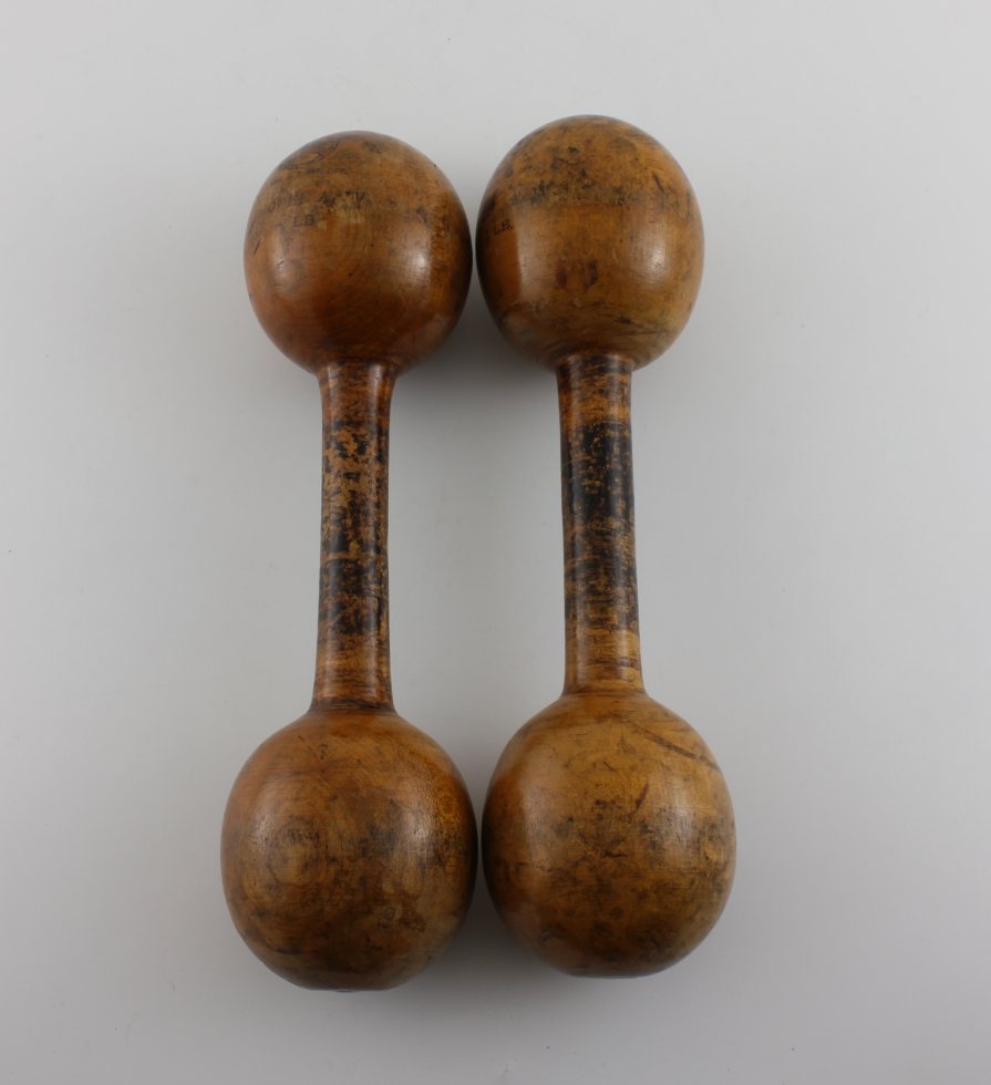 This pair of American wooden dumbbell weights which are made by Spalding are stamped with their maker's trade mark and date from the early 1900's.