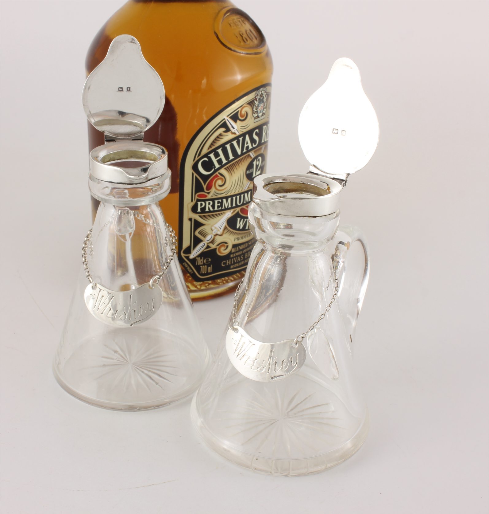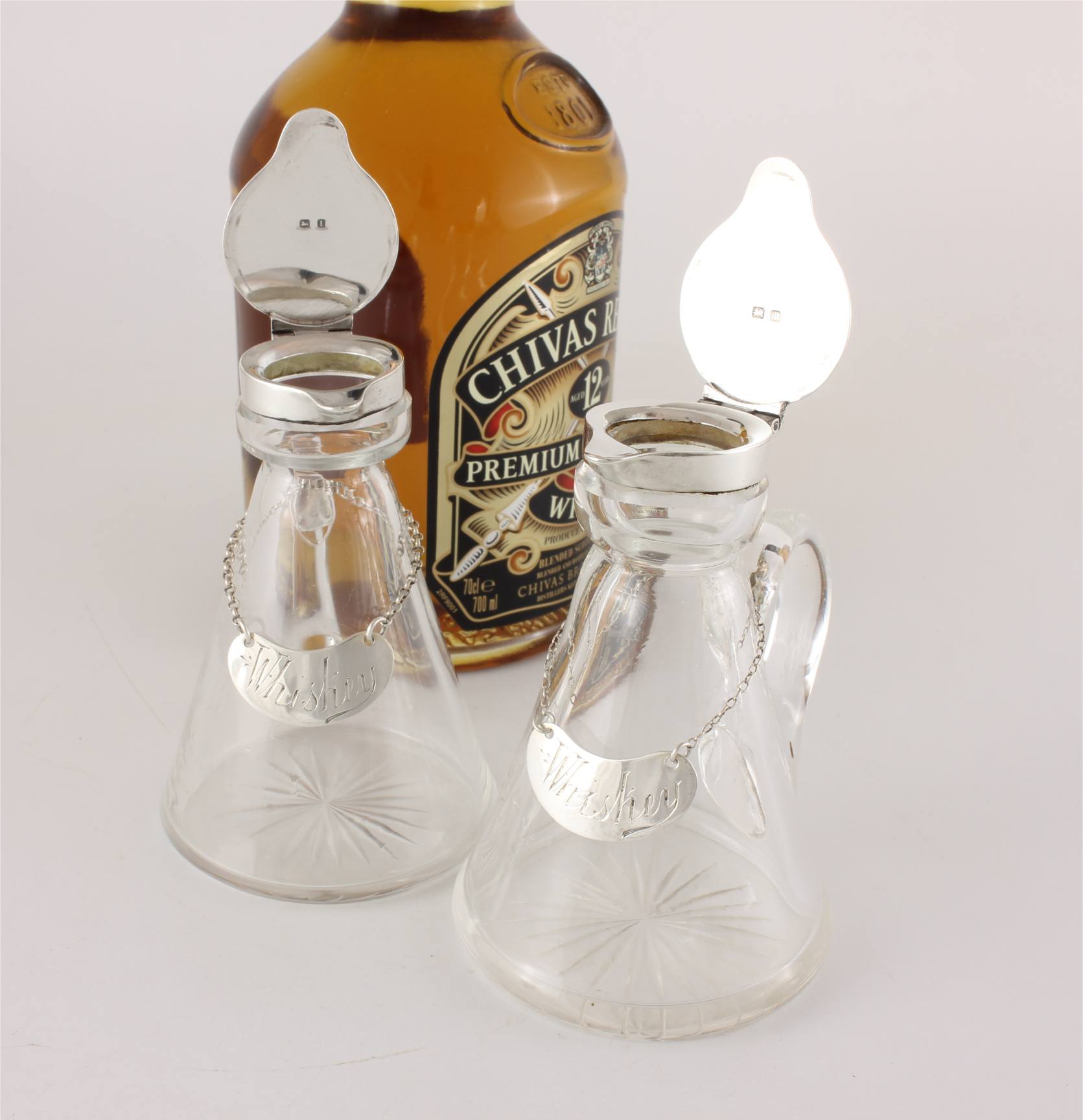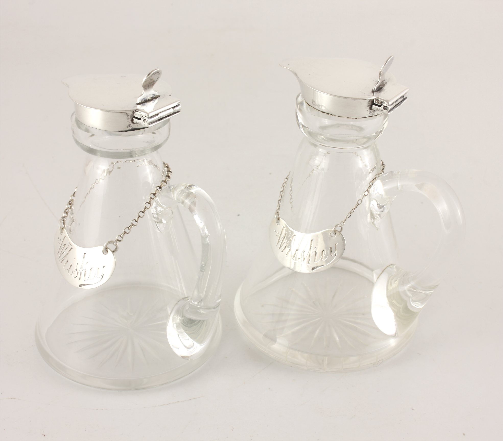 These early 20th century whisky noggins have a glass handle and fully hallmarked silver mounts with a top hinged cover that can be opened with the thumb tab for pouring.