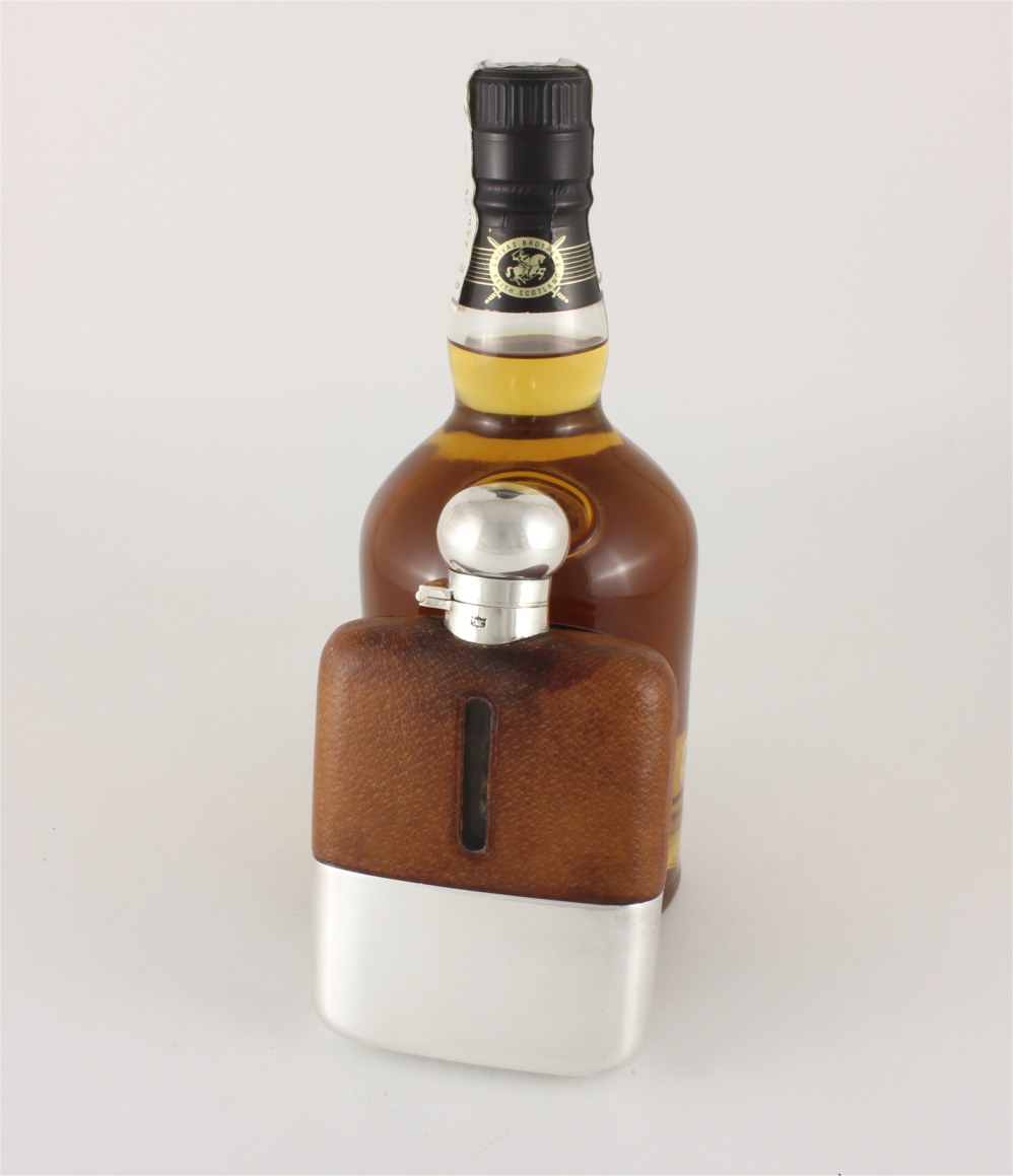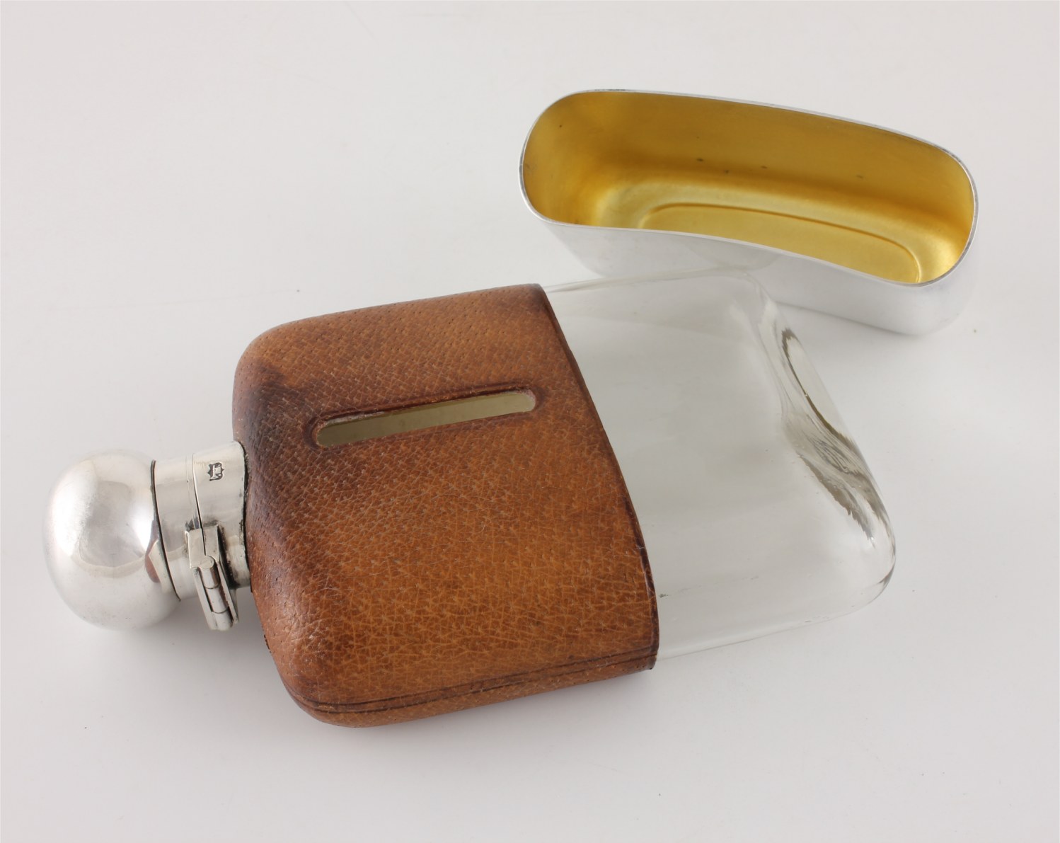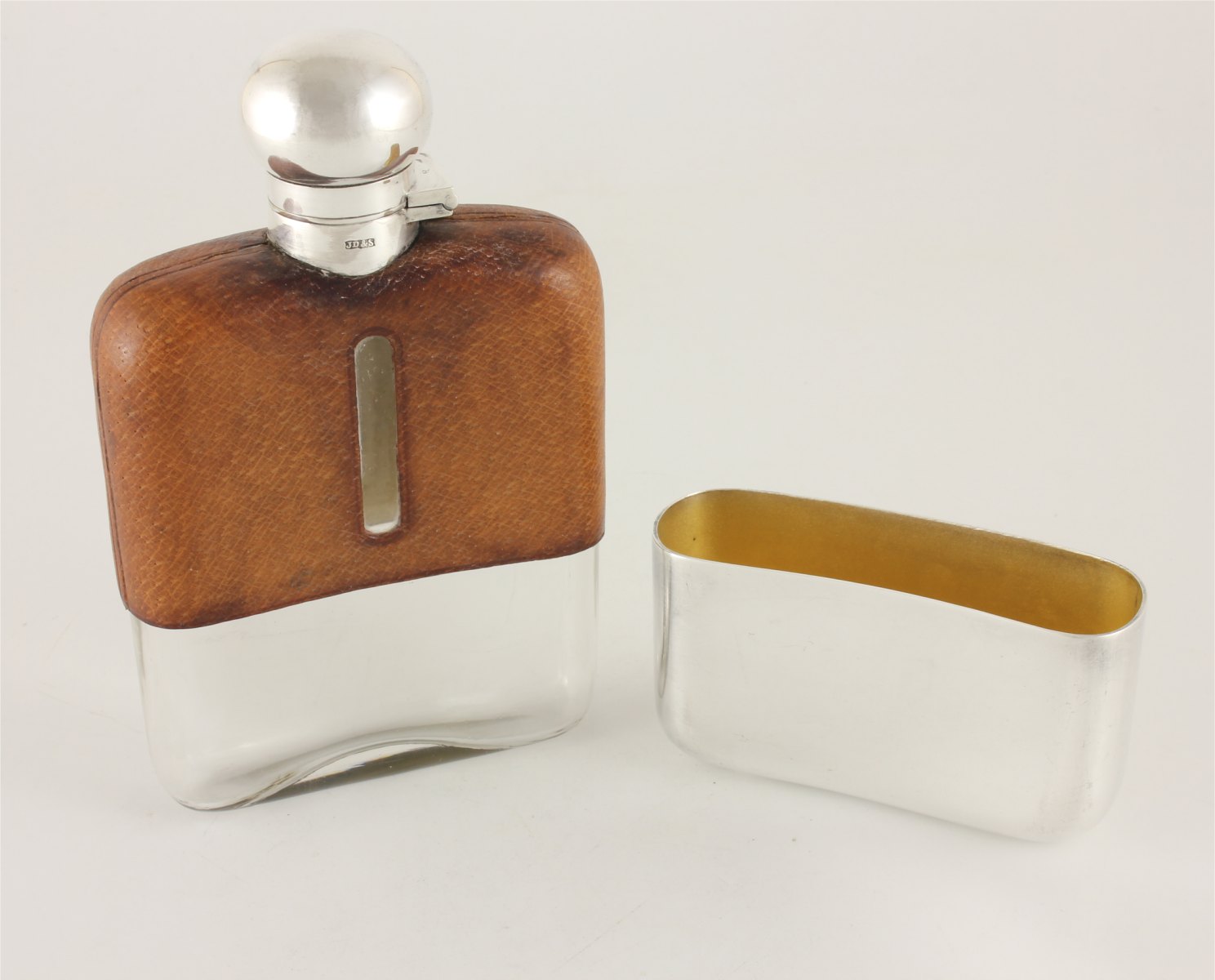 The flask which holds 1/4 of a pint has a leather top half with a sight level to both sides and has a hinged silver plated flip / bayonet top which has a new cork fitted so does not leak.