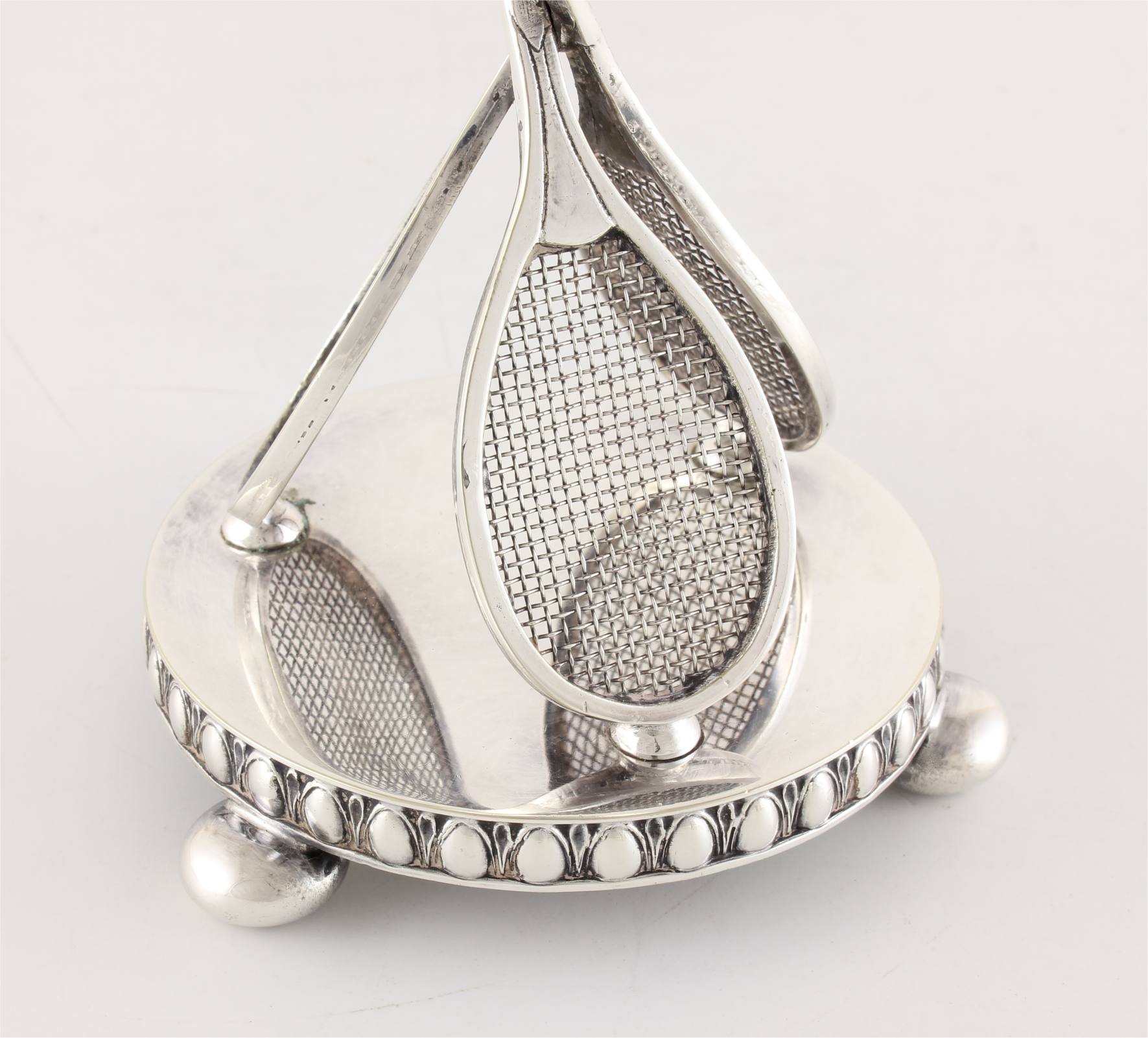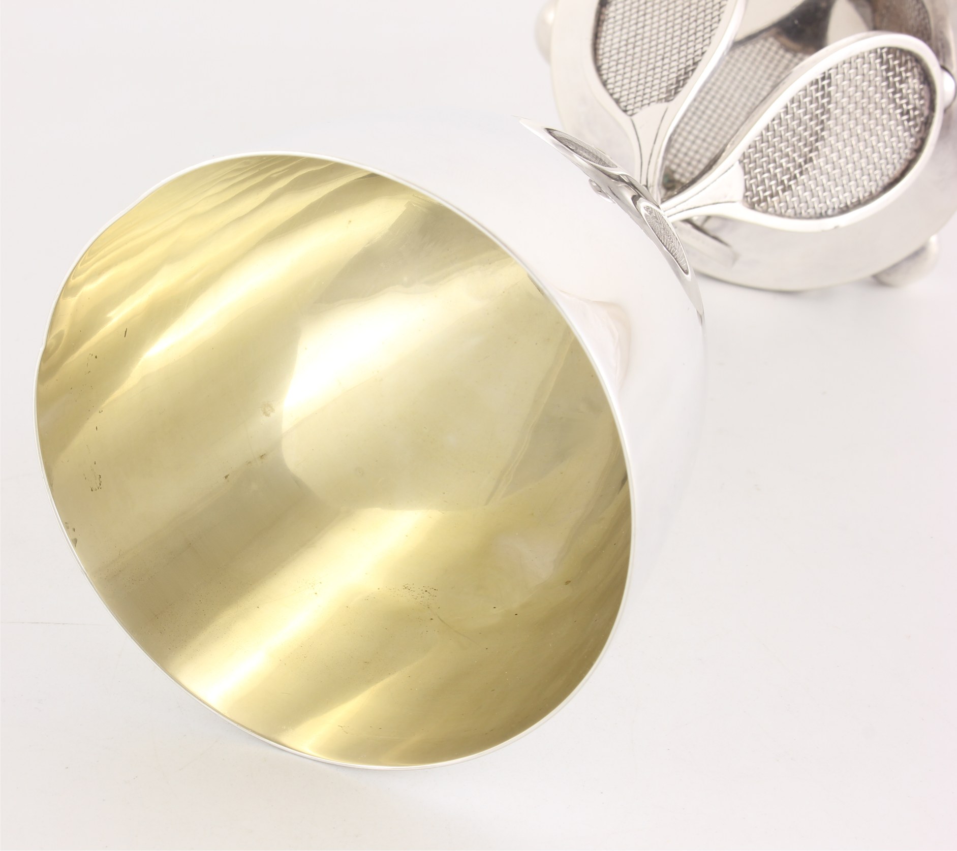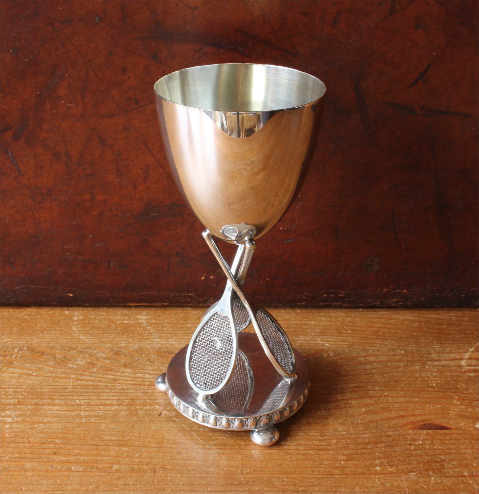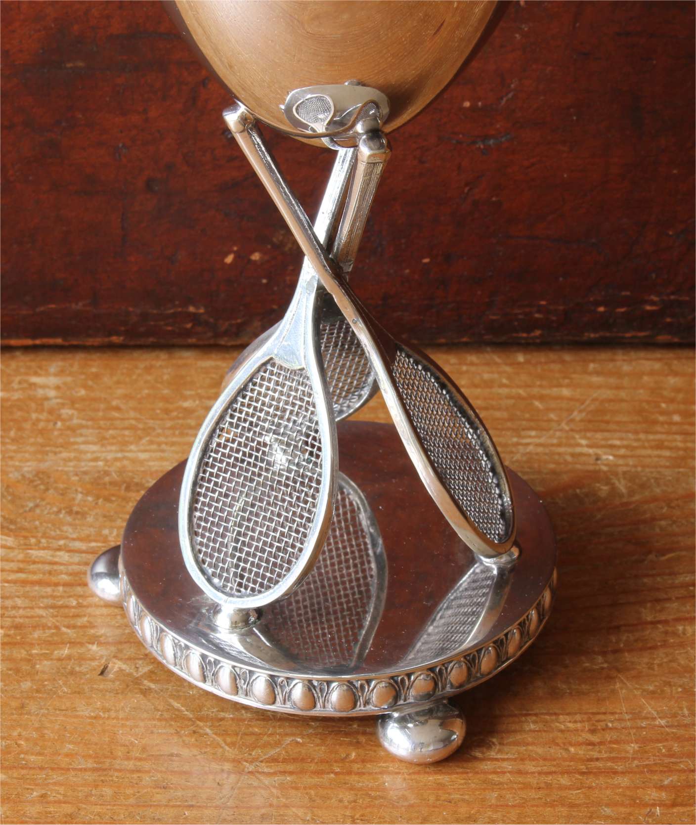 This decorative silver plated tennis trophy cup which features three crossed vintage tennis rackets dates from the beginning of the 20th century and is marked to the underside with Regd Plato EPNS and Made in England which are the maker's marks for David Hollander & Sons of Birmingham.