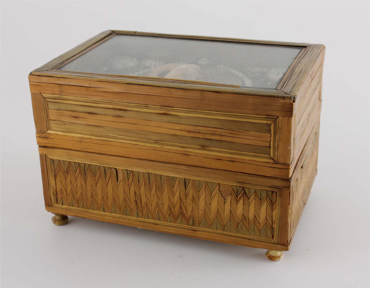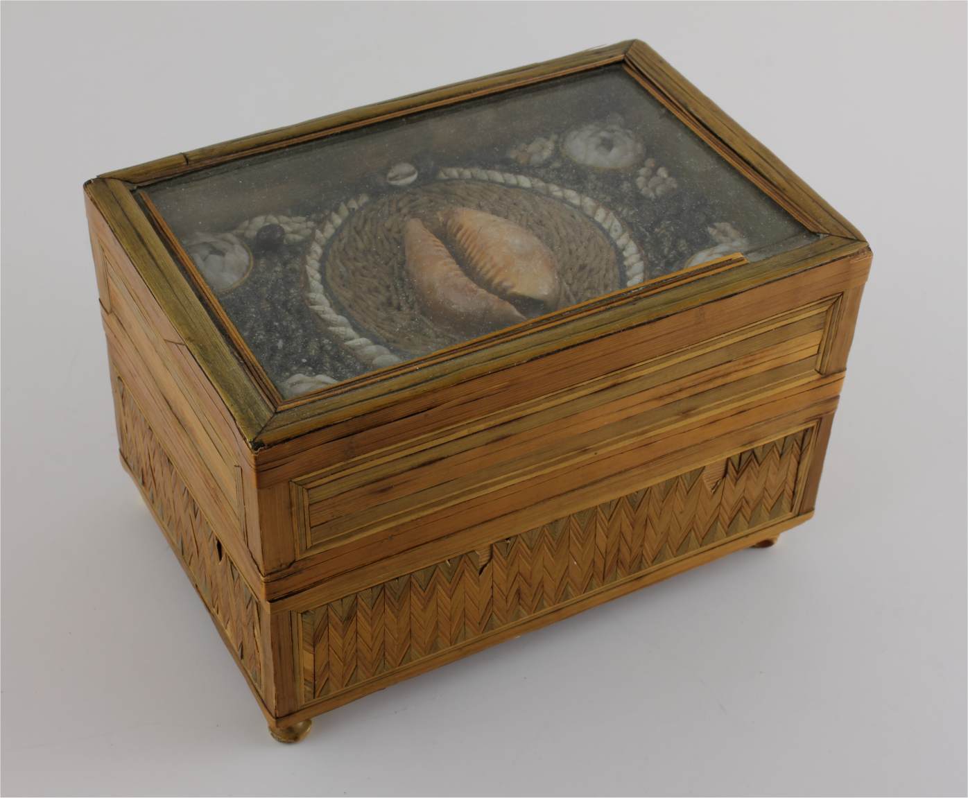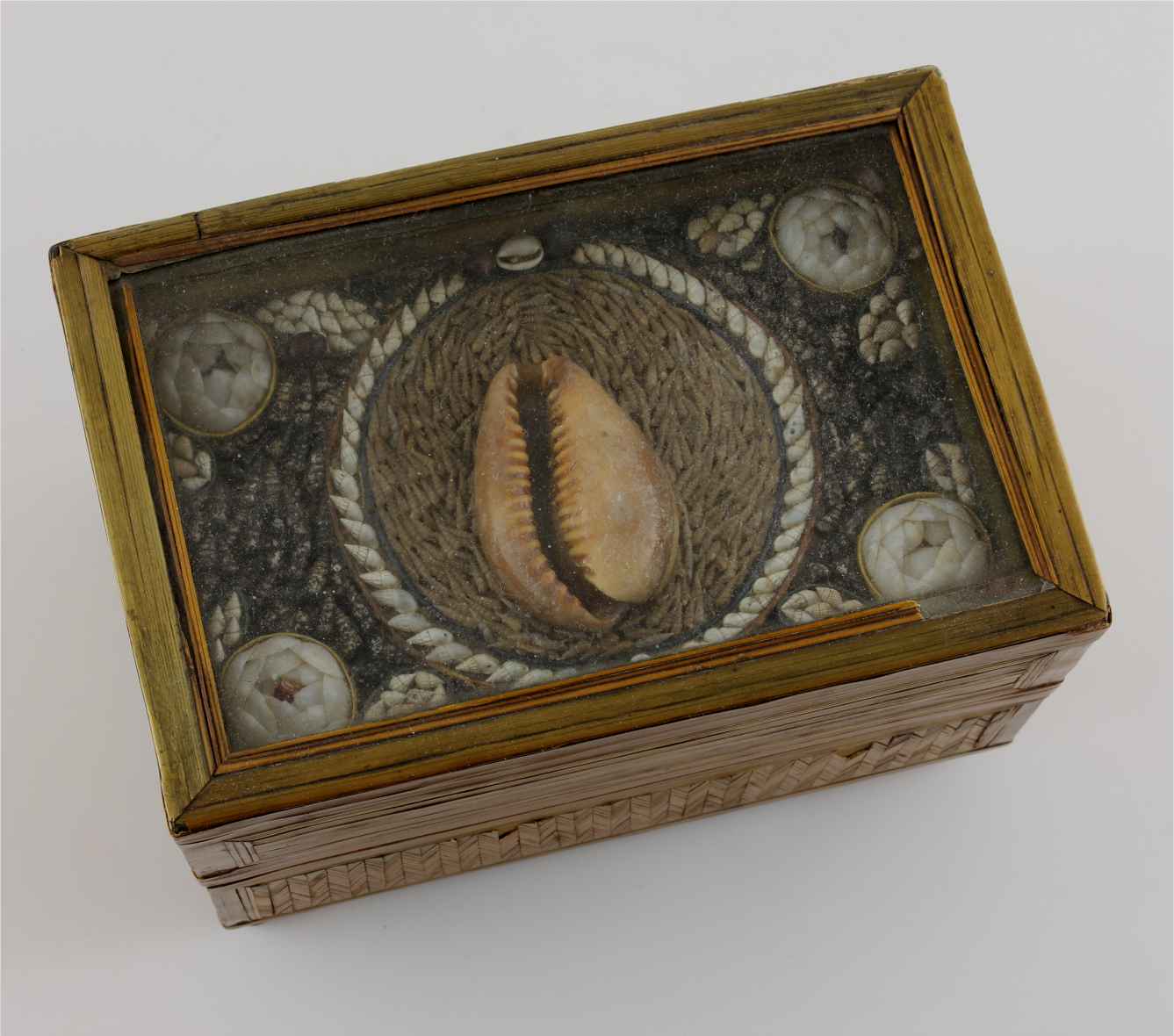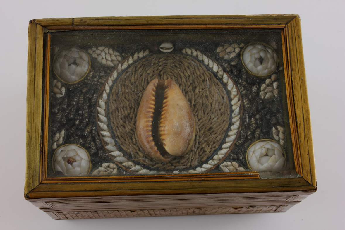 Unusually, the top half of this antique box has a glass fronted shellwork panel which is wonderfully decorated with different size and shaped shells.