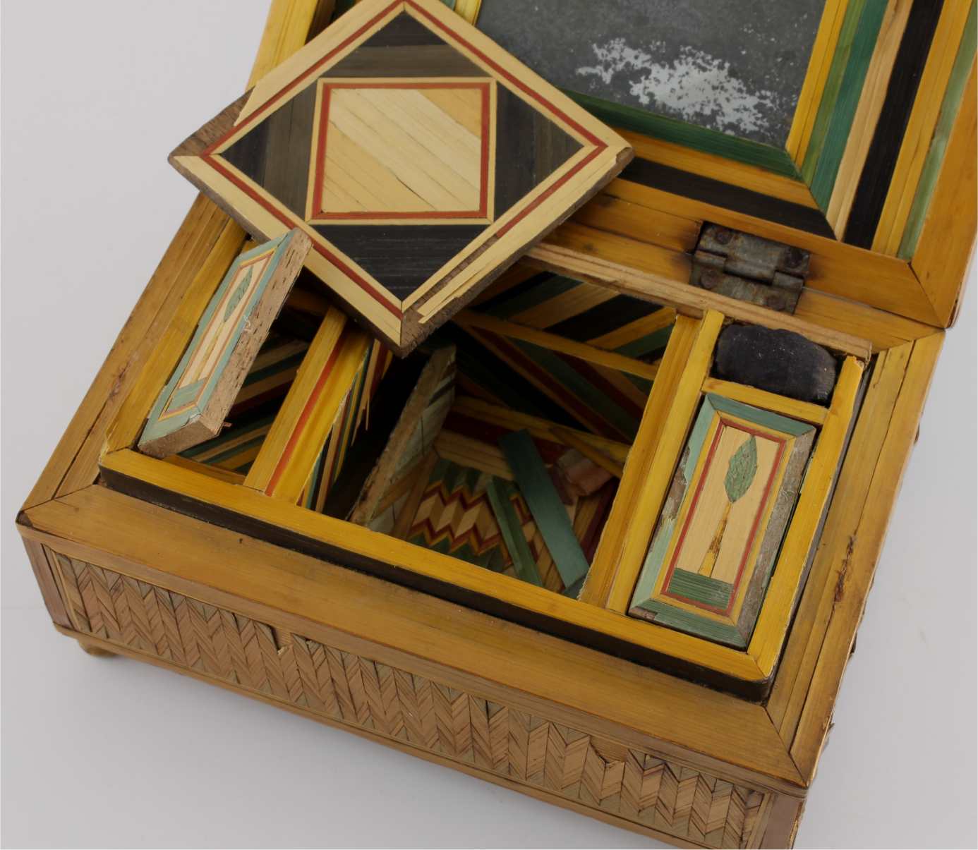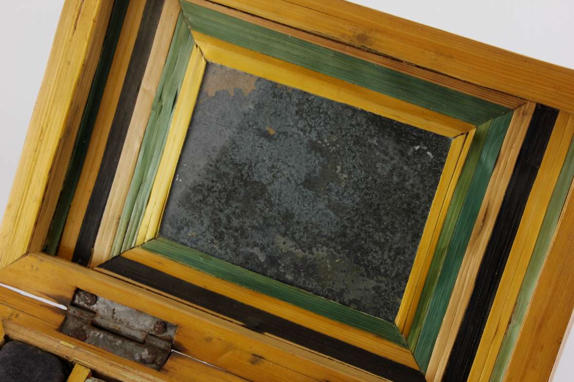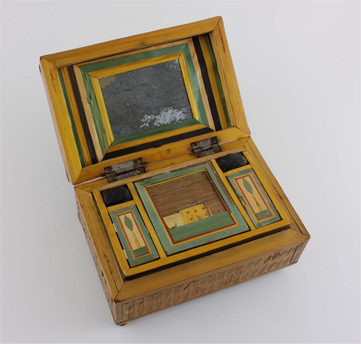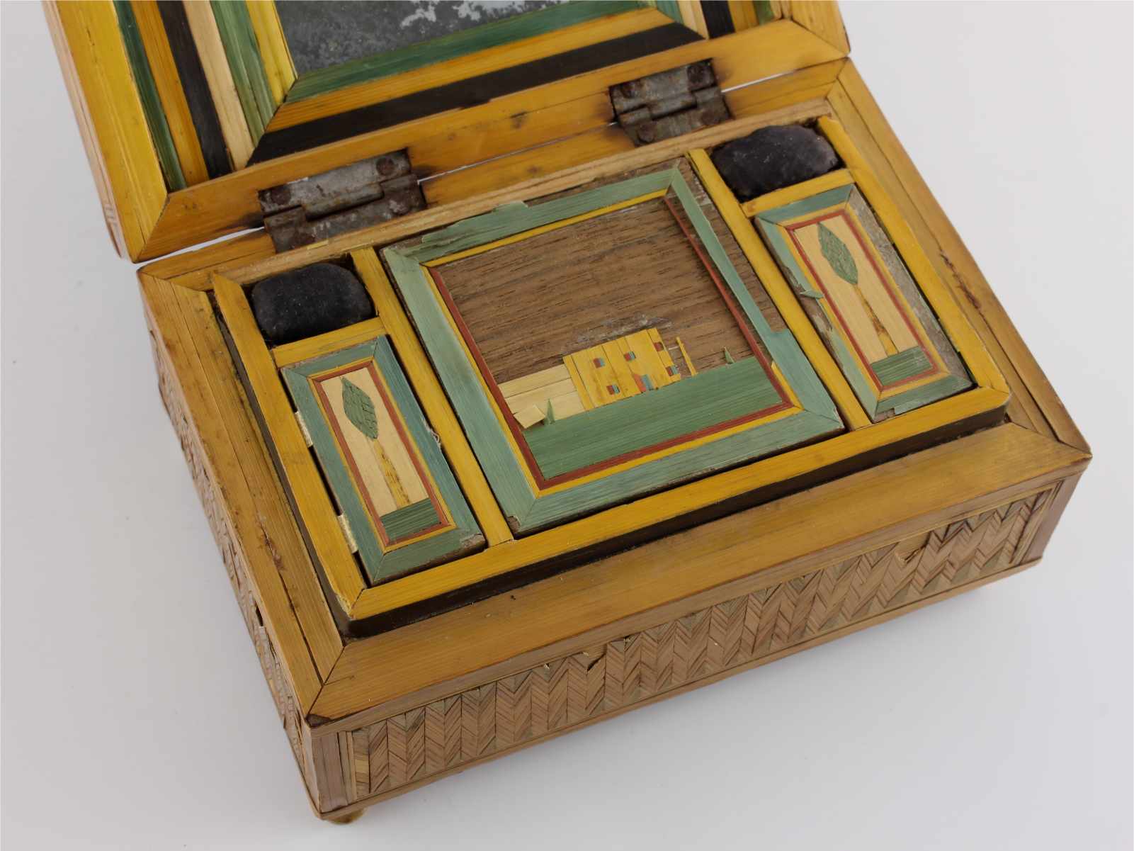 This antique wooden box has been intricately decorated with different coloured straw to the outer and inside with some of it being dyed to create the beautiful designs.