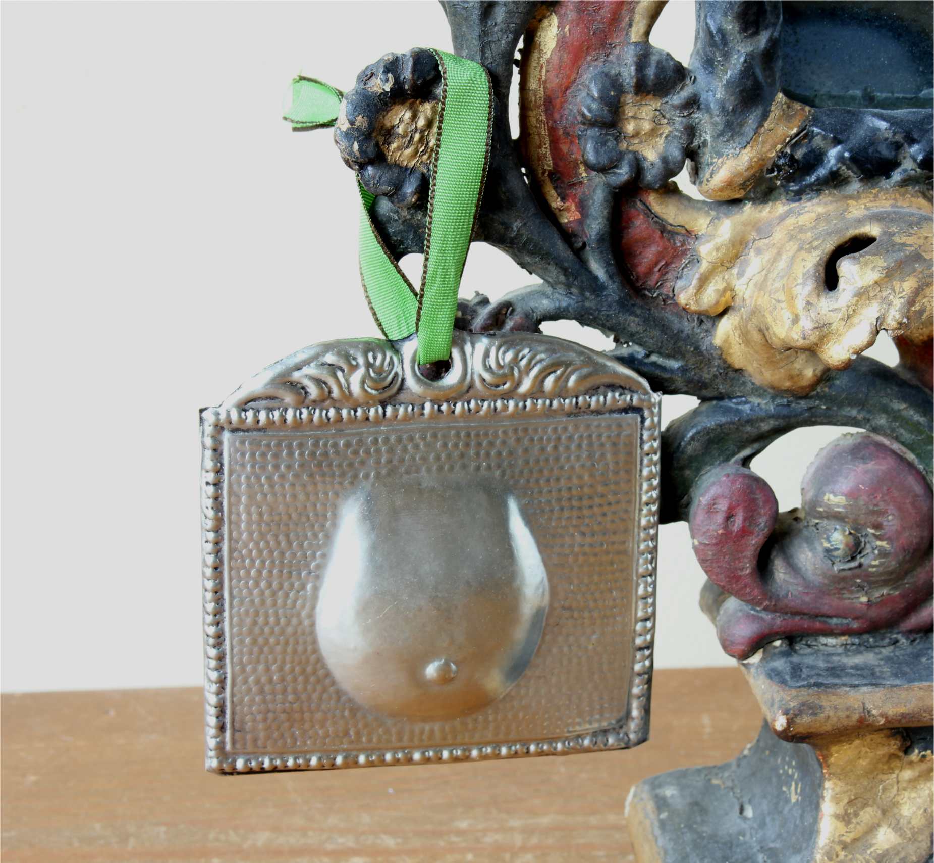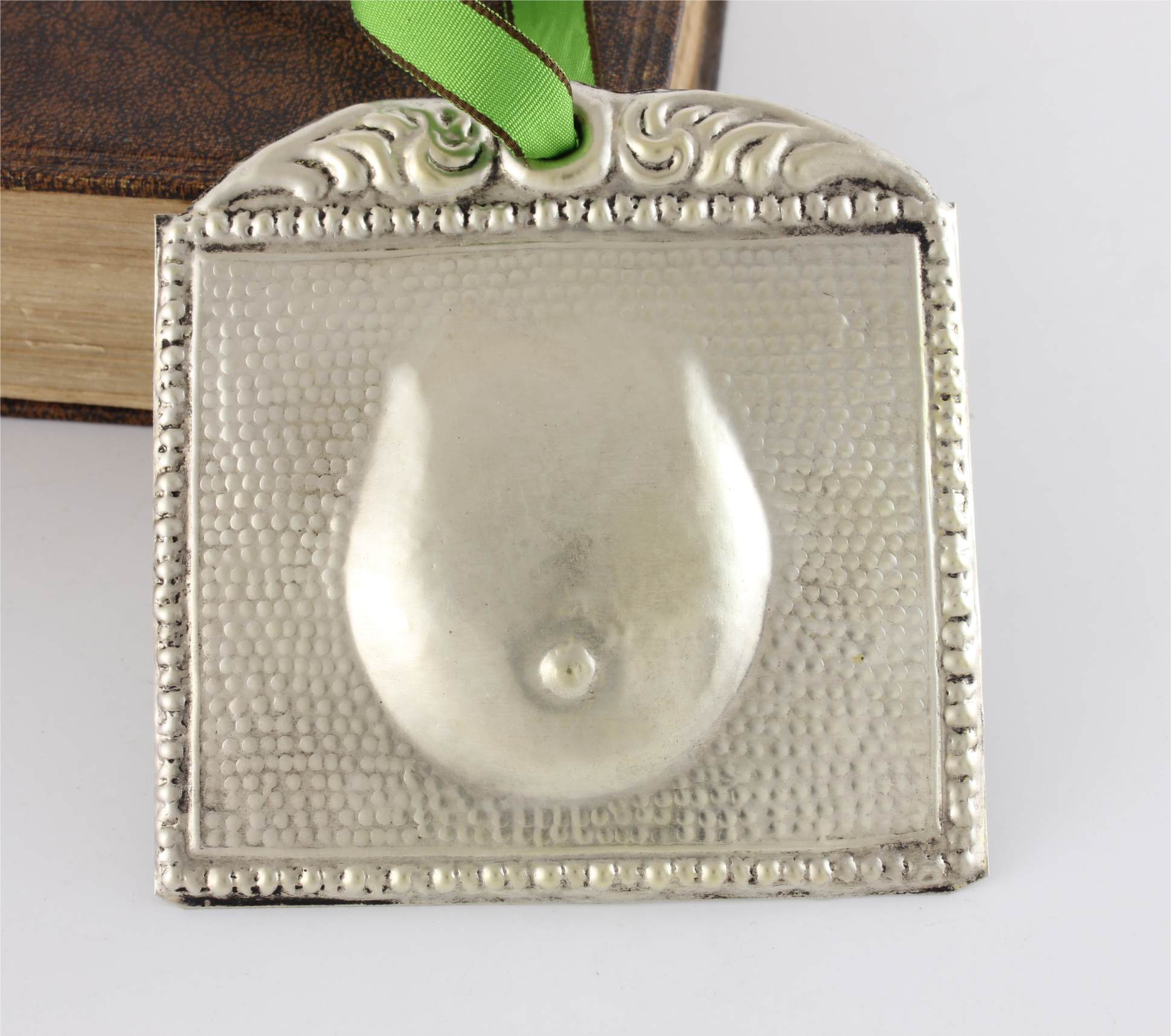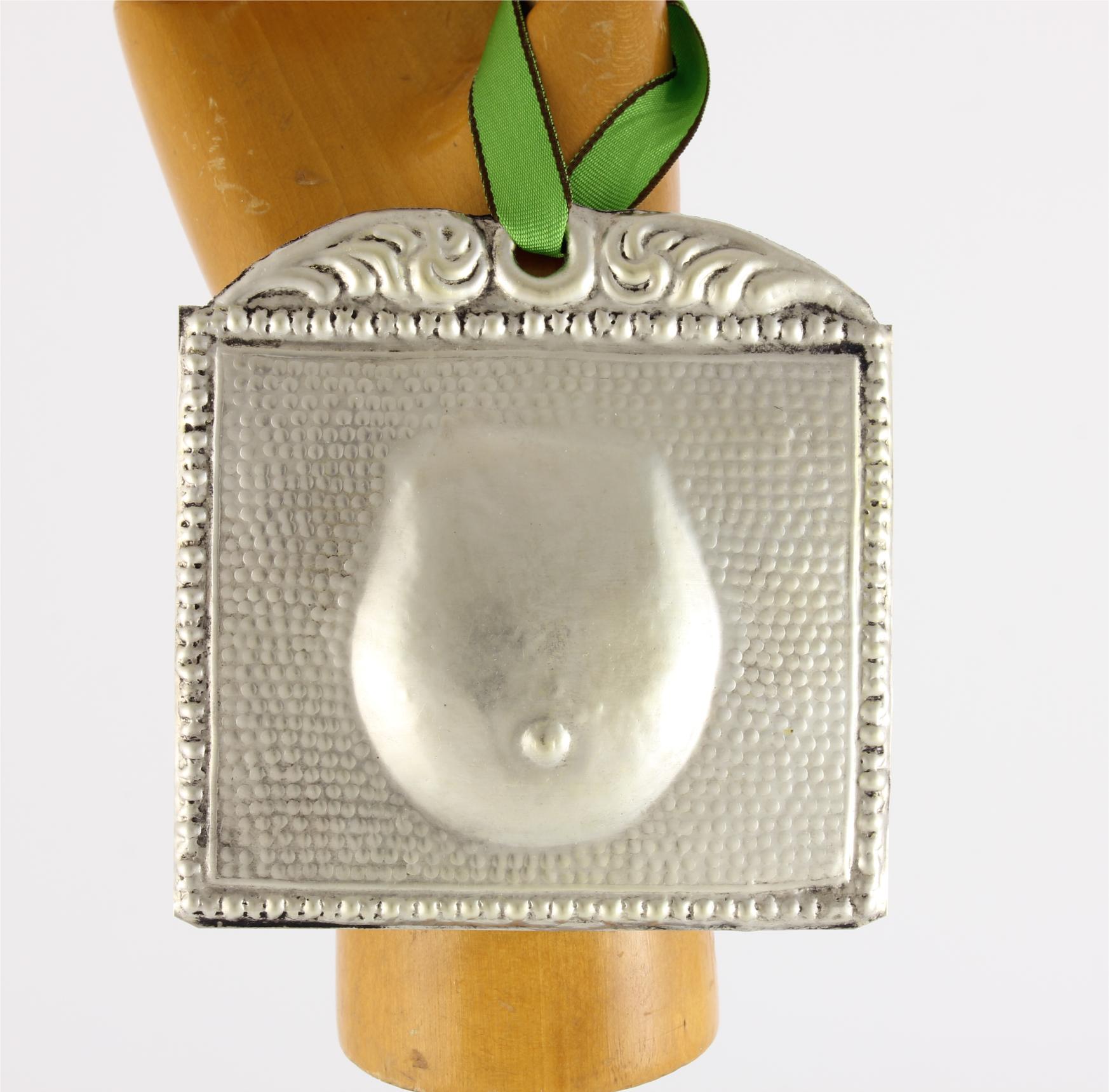 This fascinating ex voto which originates from Italy is made of silver plate / white metal and has a central embossed ladies pregnant belly.