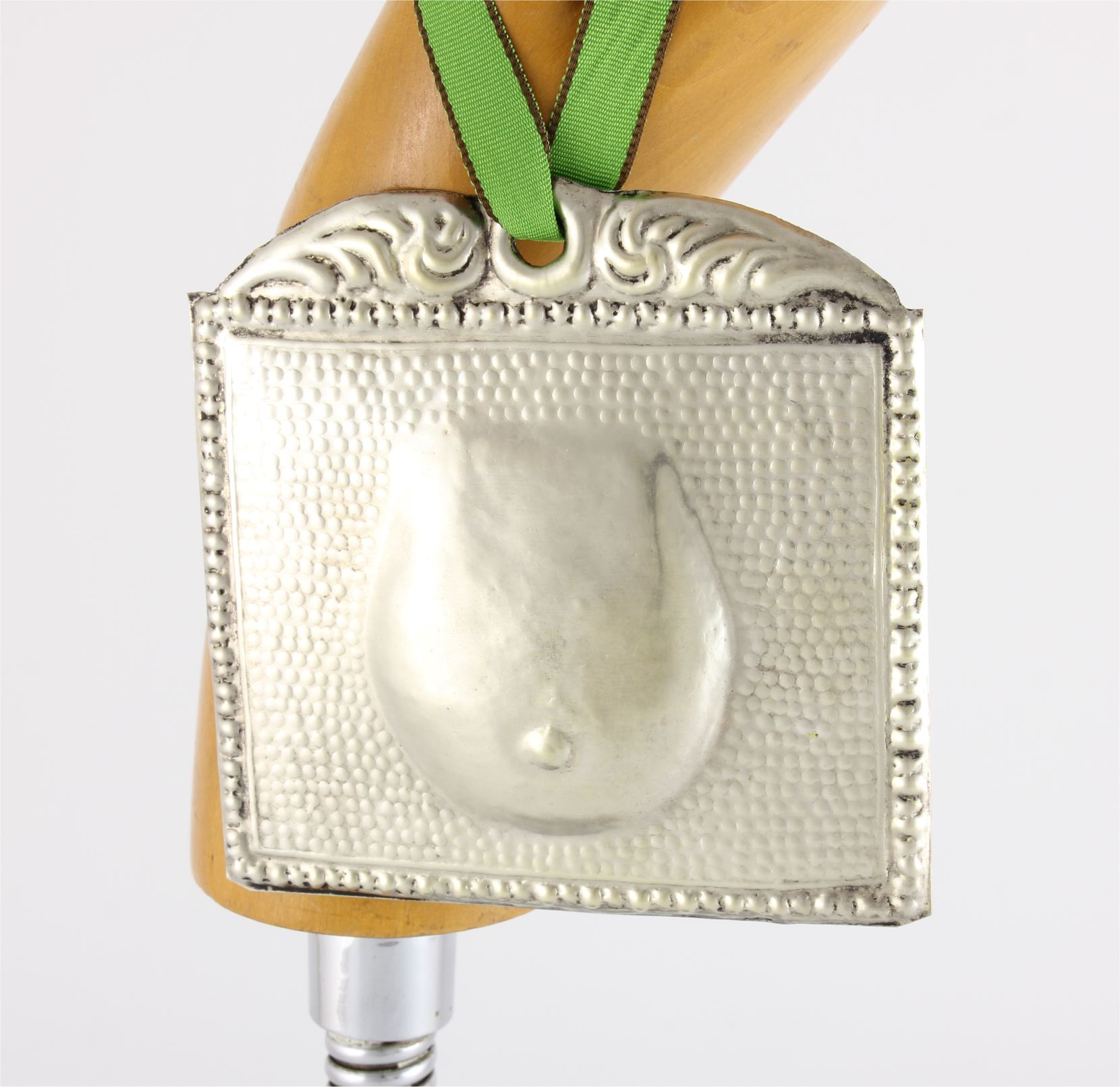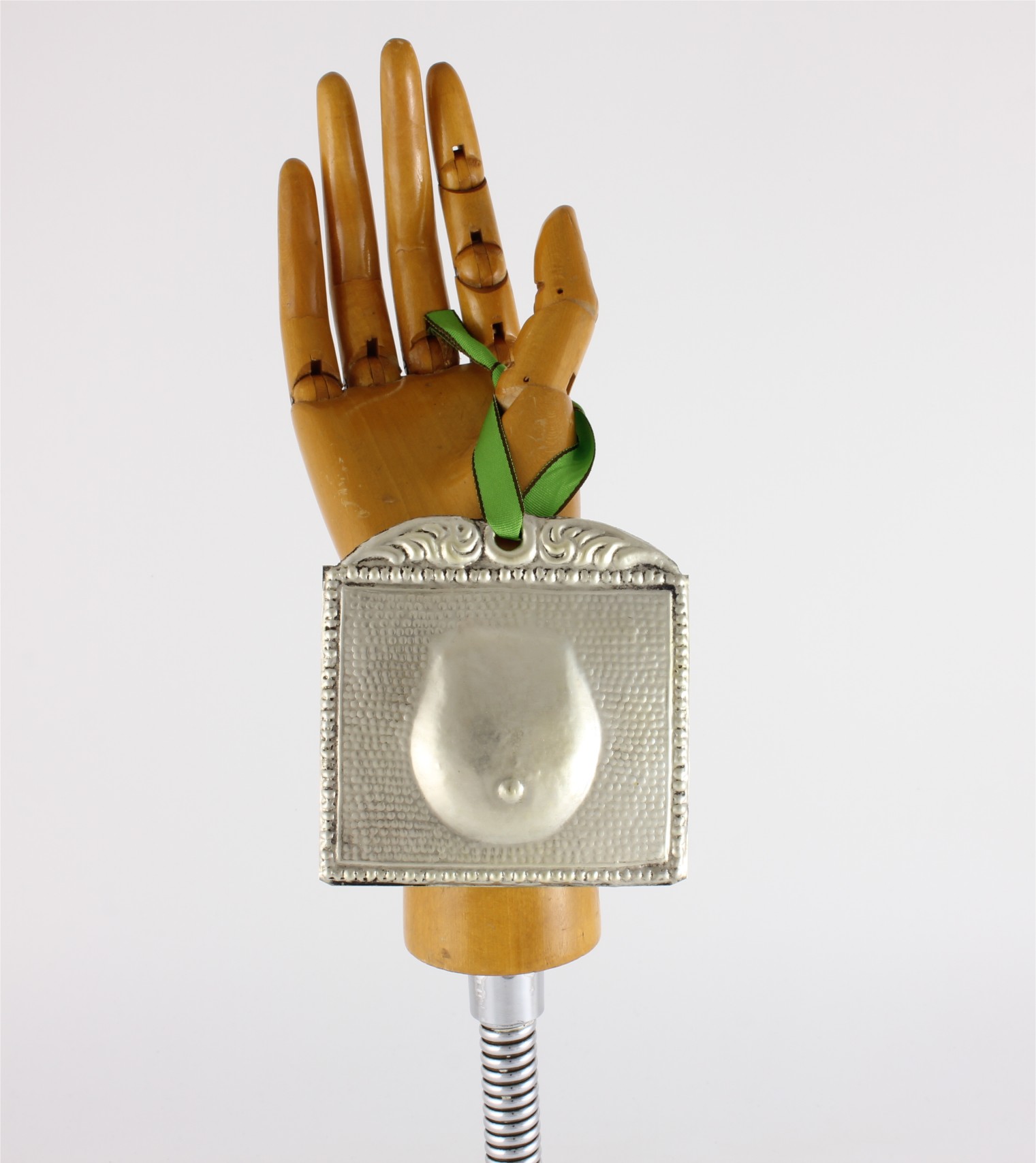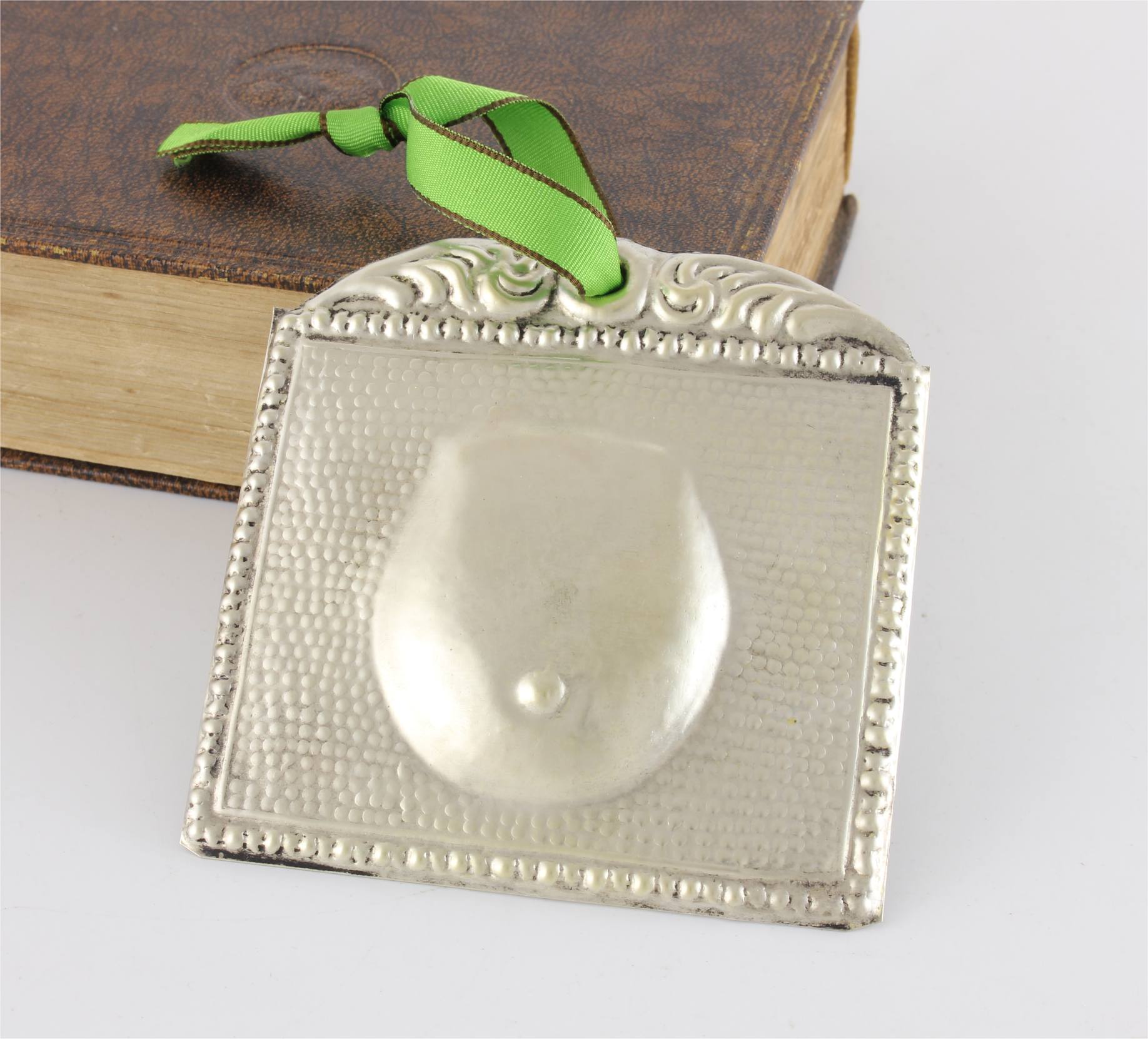 This fascinating ex voto which originates from Italy is made of silver plate / white metal and has a central embossed ladies pregnant belly.