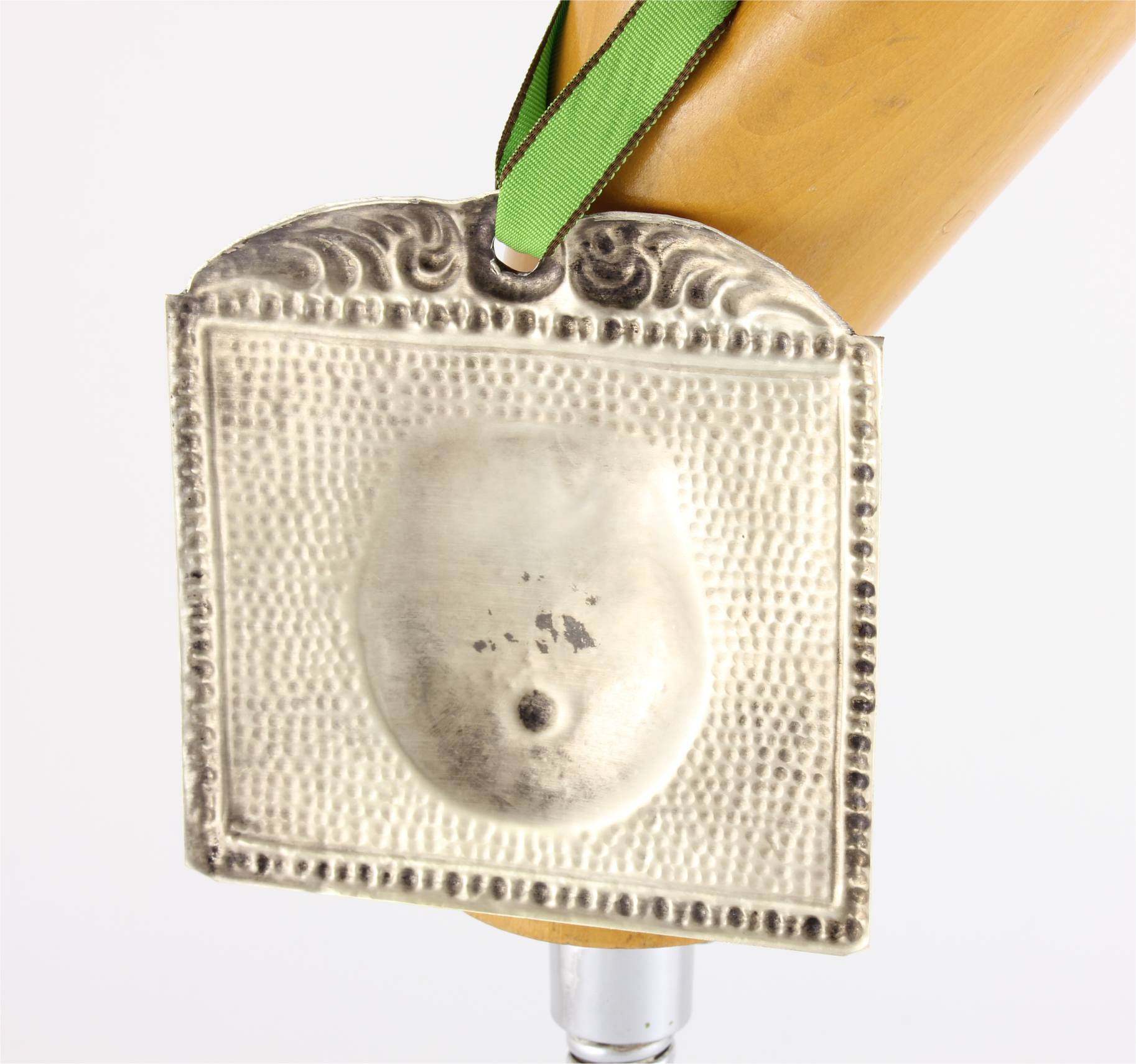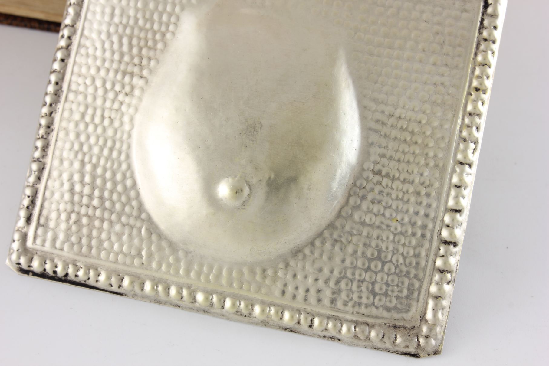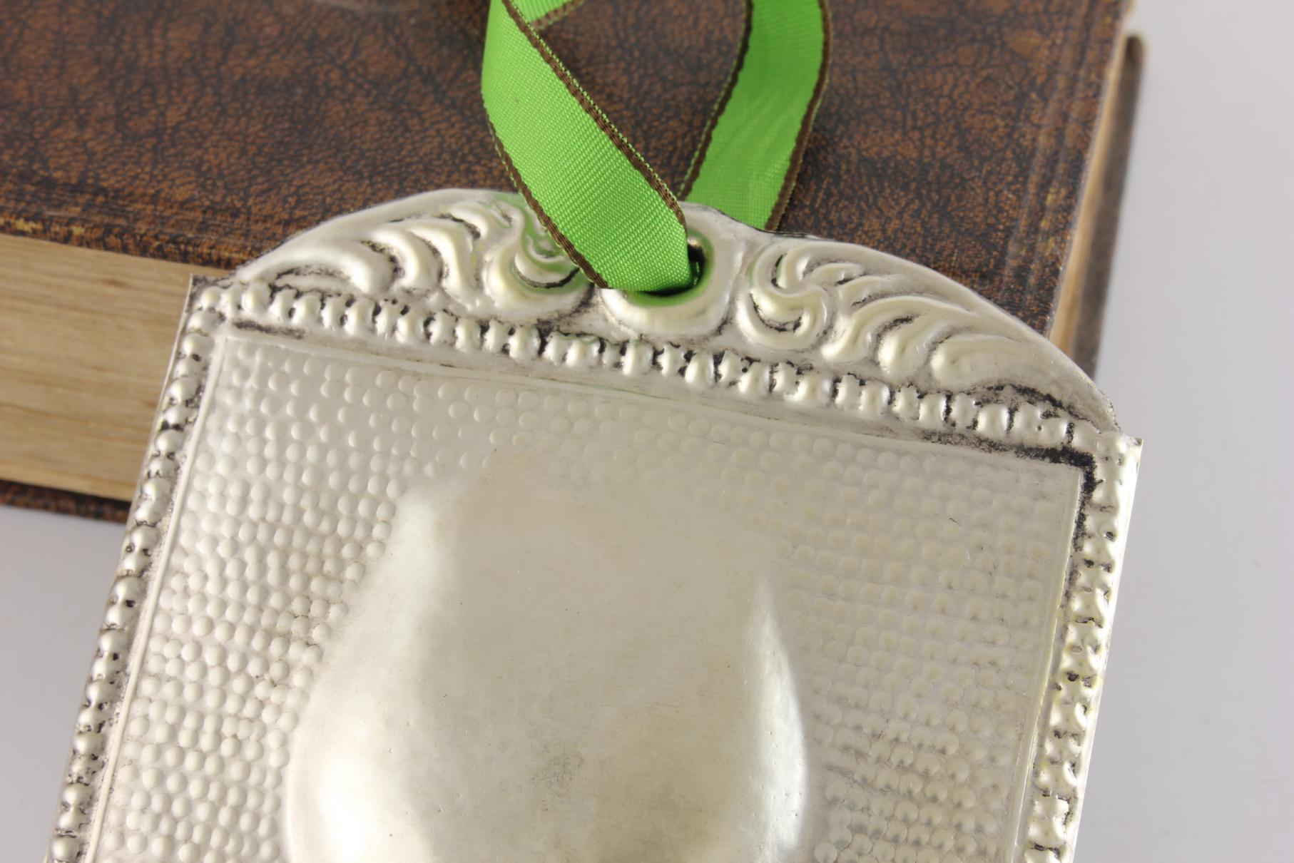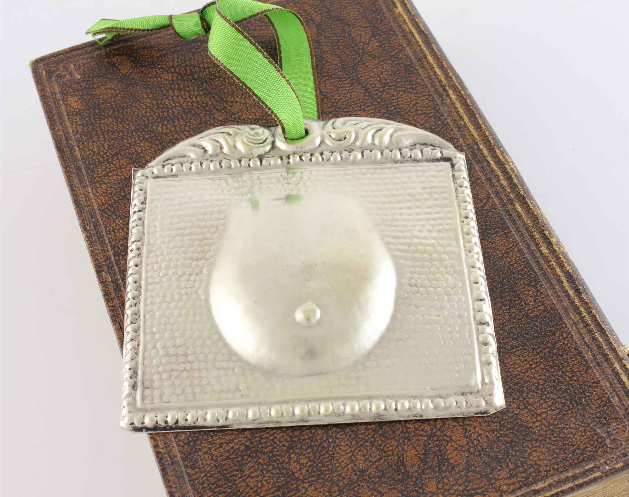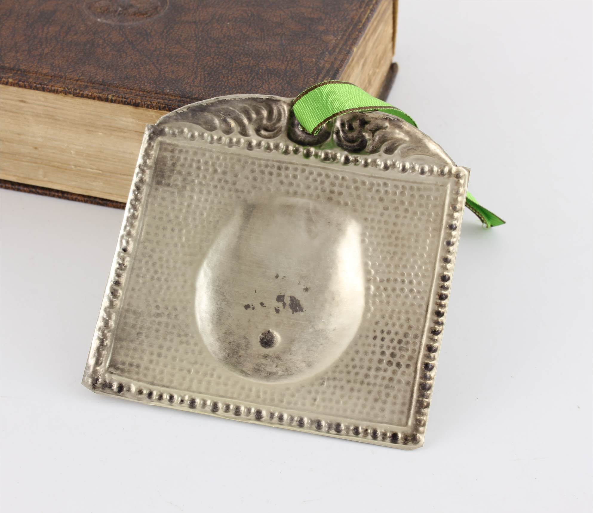 This ex voto which dates from the first half of the 20th century is square in shape with a hammered background and fancy top which is fitted with a hanging ribbon.