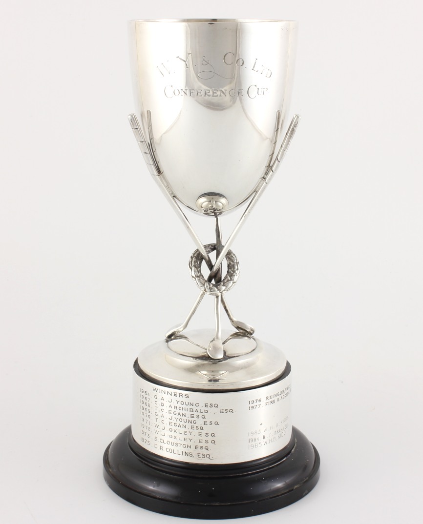 This interesting vintage golf trophy cup which is made of solid silver is by Robert Pringle and has a top cup that is engraved with: W Y & Co Ltd. Conference Cup.