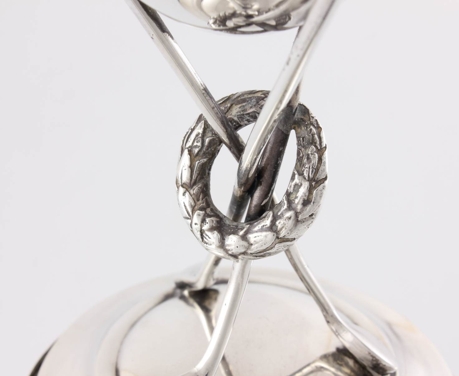 This cup which has a good weight and gauge is supported by three golf clubs which have a laurel wreath entwined and rests on it's base.
