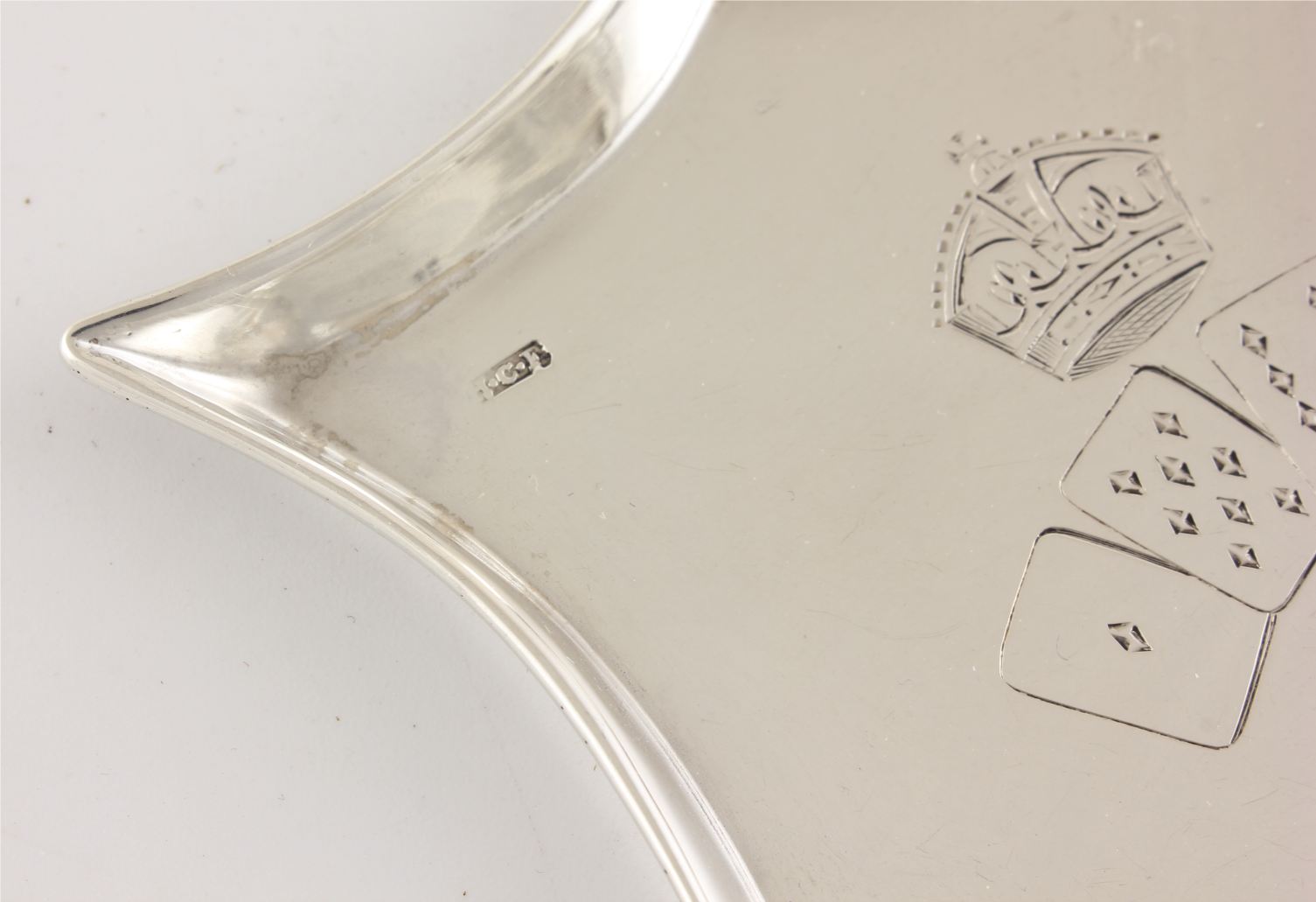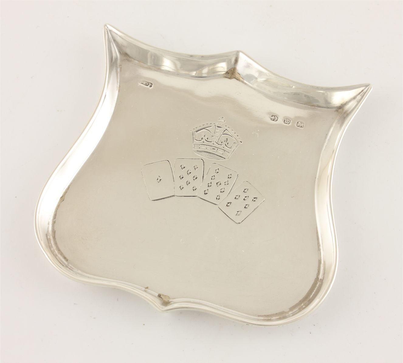 This solid silver Queen Victoria Diamond Jubilee commemorative pin dish which is by Henry Charles Freeman is in the shape of a shield and has four playing cards that display the date of her 60th Jubilee of 1897 and the Victorian crown.