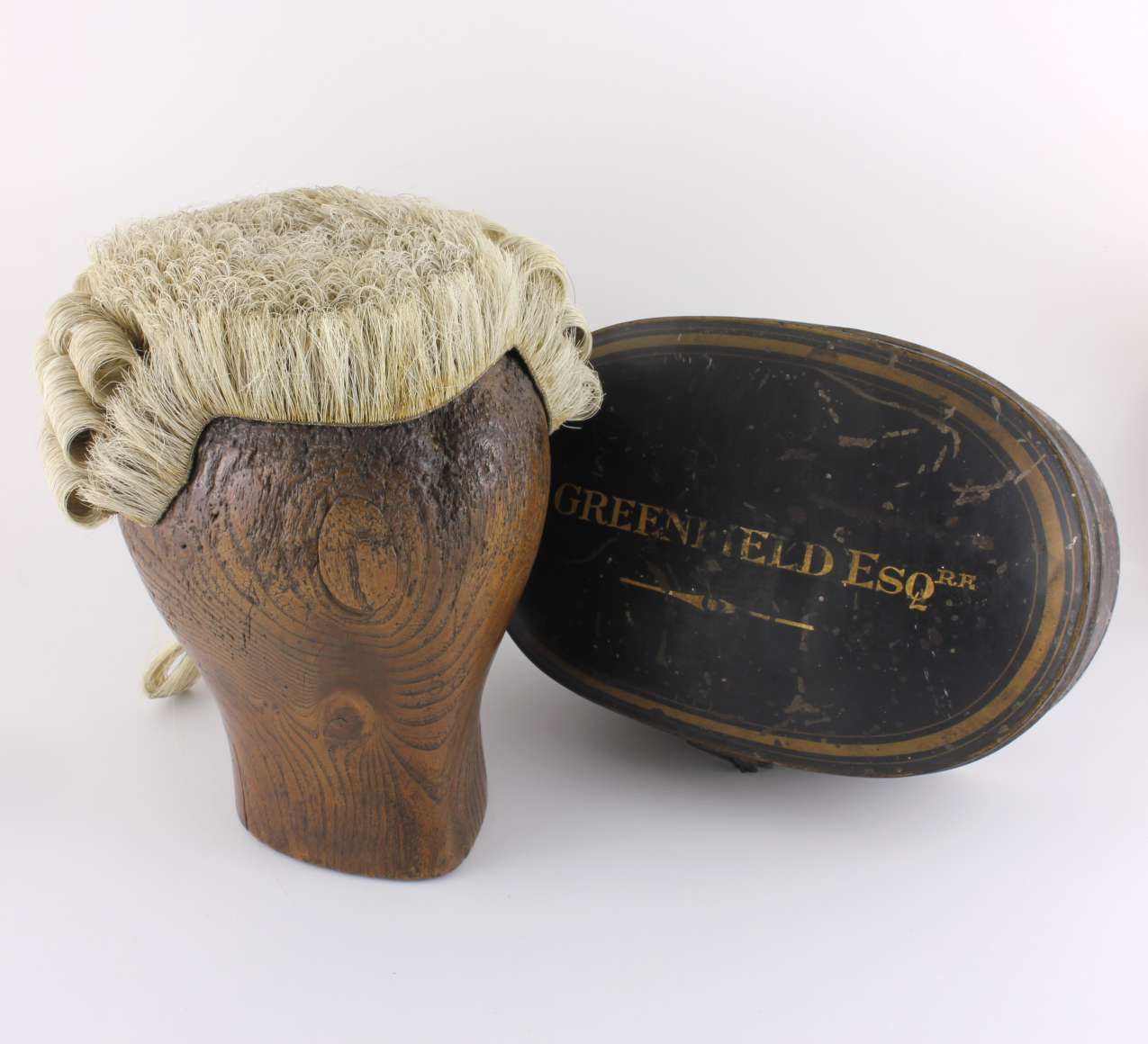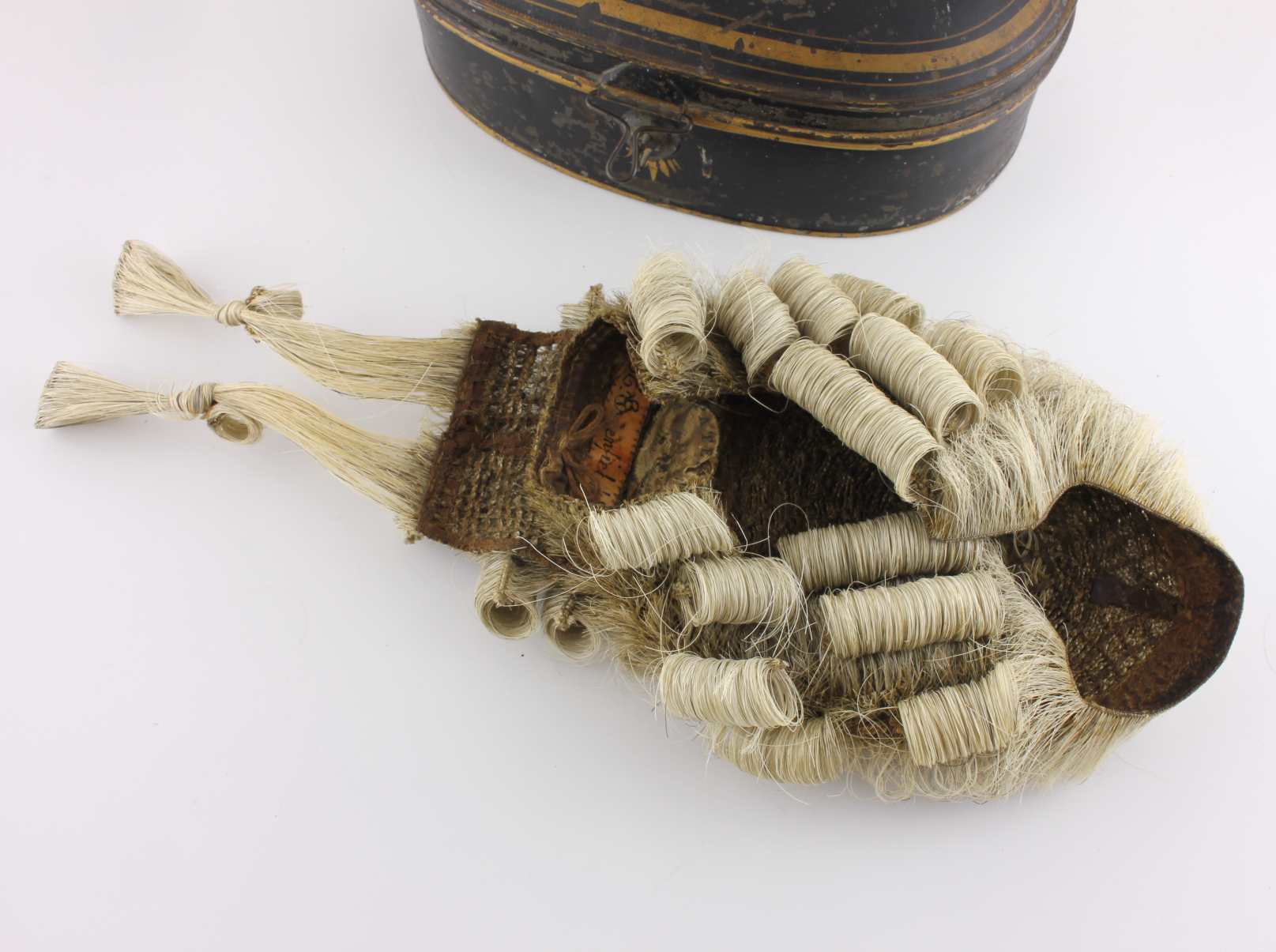 This Victorian wig which came from a family in Hampshire comes complete with it's black and gold toleware Ravenscroft tin which is marked to the top with the owner's name of H Greenfield Esqre which reads the same as to the inside of the wig. Also marked to the inside with Ravenscroft Law. Wig & Robe Maker. Lincolns Inn. London.
