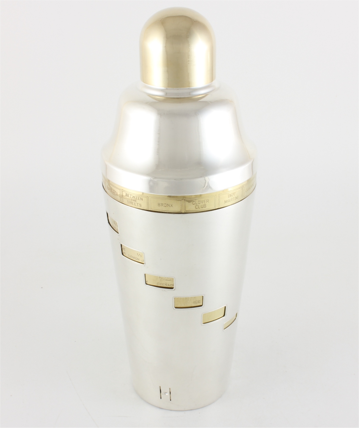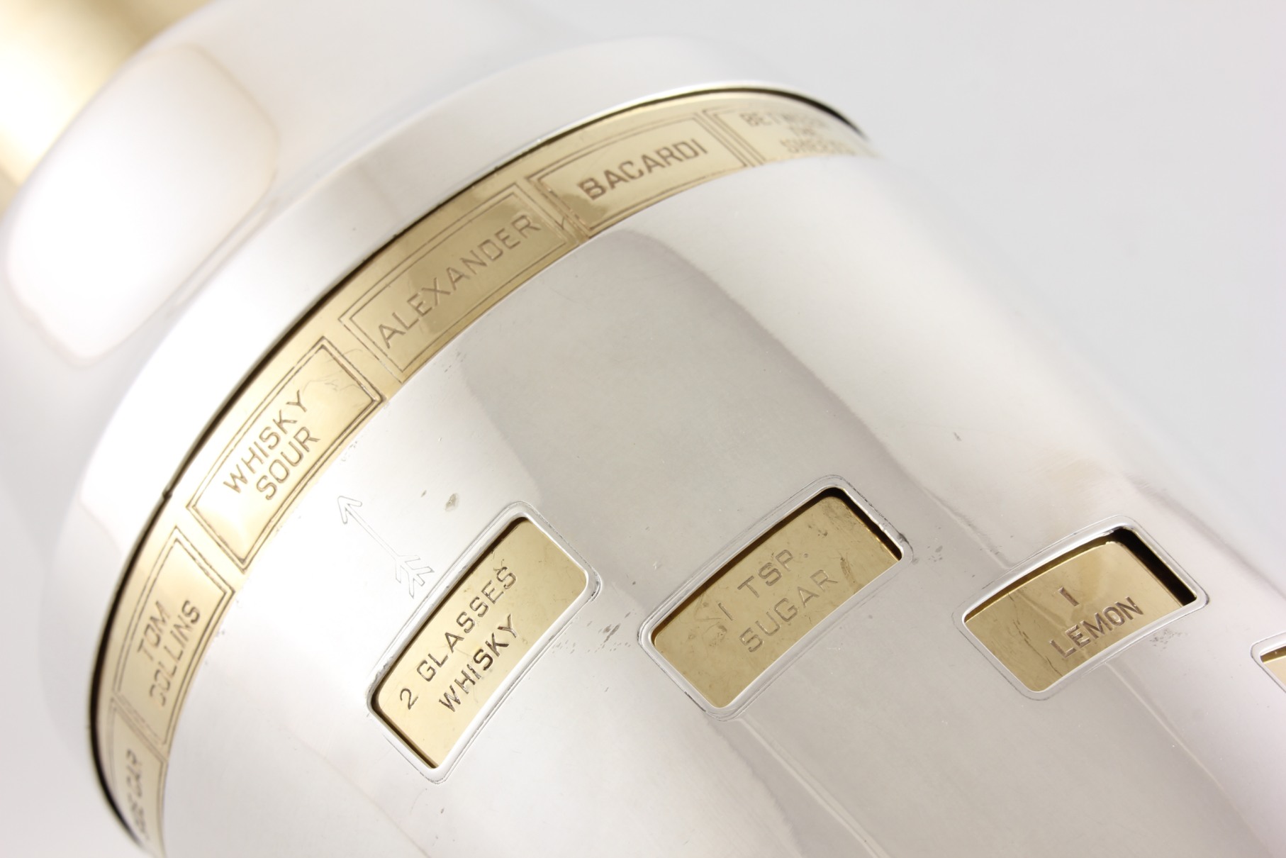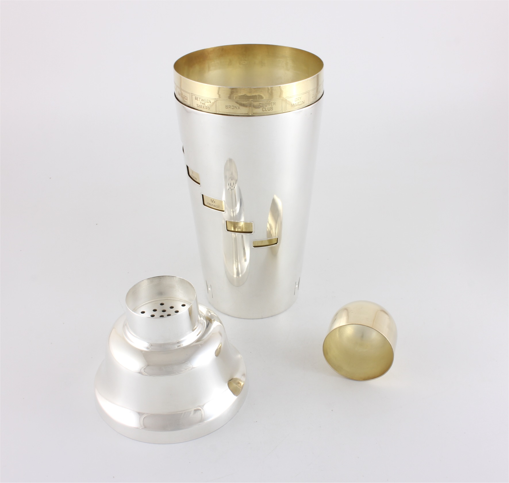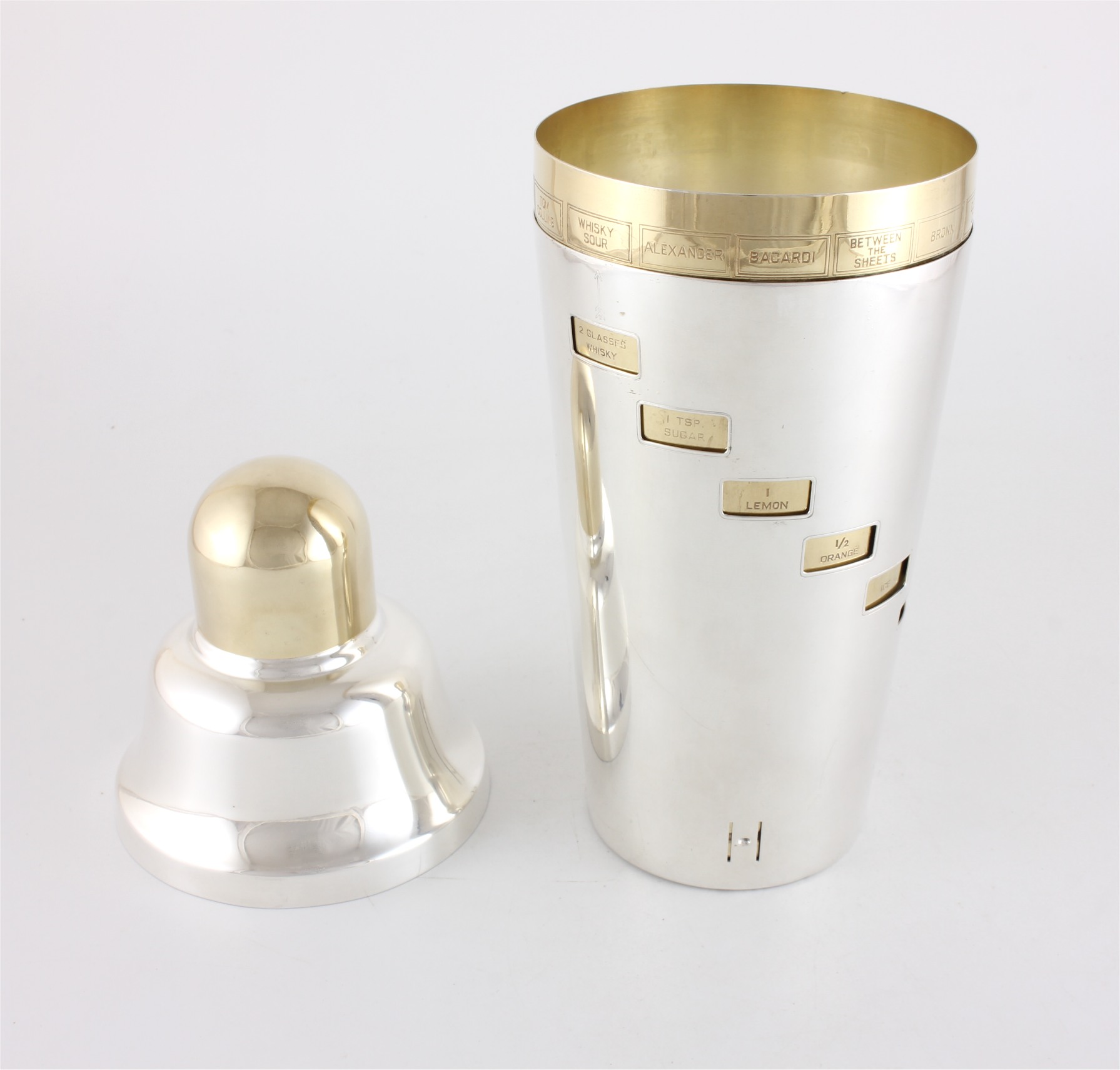 This stylish Art Deco Dial a Drink recipe cocktail shaker is by the American company Napier and features a silver plated sleeve which fits over the nicely gilded body.